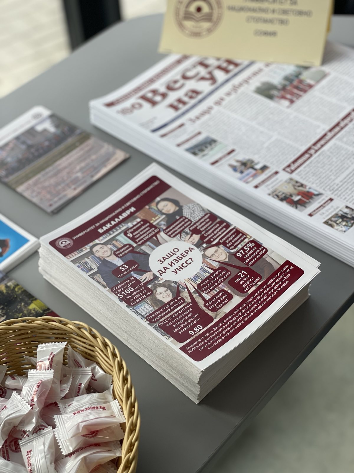 Средношколците научиха, че УНСС е с най-високата институционална акредитация сред българските университети (9.80), има модерно оборудвани аудитории, 12 общежития с 5000 места, с всички условия за учене и живот и отлични възможности за спорт в спортен комплекс „Бонсист“.