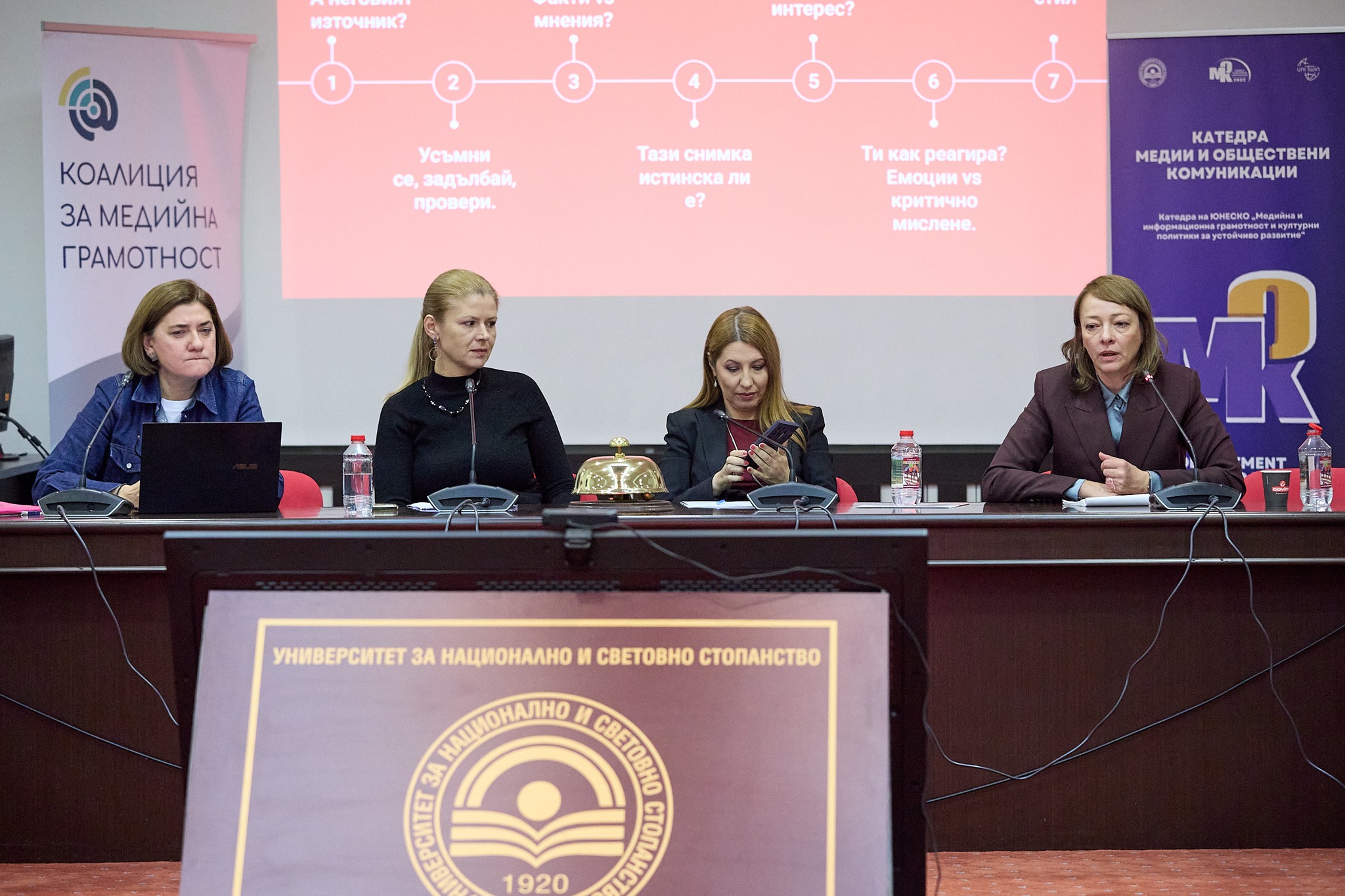 Заместник-ректорът по учебната дейност – проф. д-р Матилда Александрова, отбеляза важността на темата и обърна внимание на това, че тя излиза извън образователната сфера и навлиза в гражданското общество: „Медийната и дигиталната грамотност, както и вземането на информирани решения, са важна част от развитието на едно общество. Още през 2016 г. Европейската комисия прие Директива за аудио-визуални и медийни услуги, в която се подчертава ролята на медийната грамотност и утвърждаването й като важен фактор в развитието на ЕС“. Тя допълни, че УНСС се гордее с постигнатото през годините от катедра „Медии и обществени комуникации“, която е и катедра на ЮНЕСКО. „Разчитаме, че след всички тези съвместни инициативи, ще имаме ученици, които ще получат базовите знания и умения в защита срещу фалшивите новини и дезинформацията“.