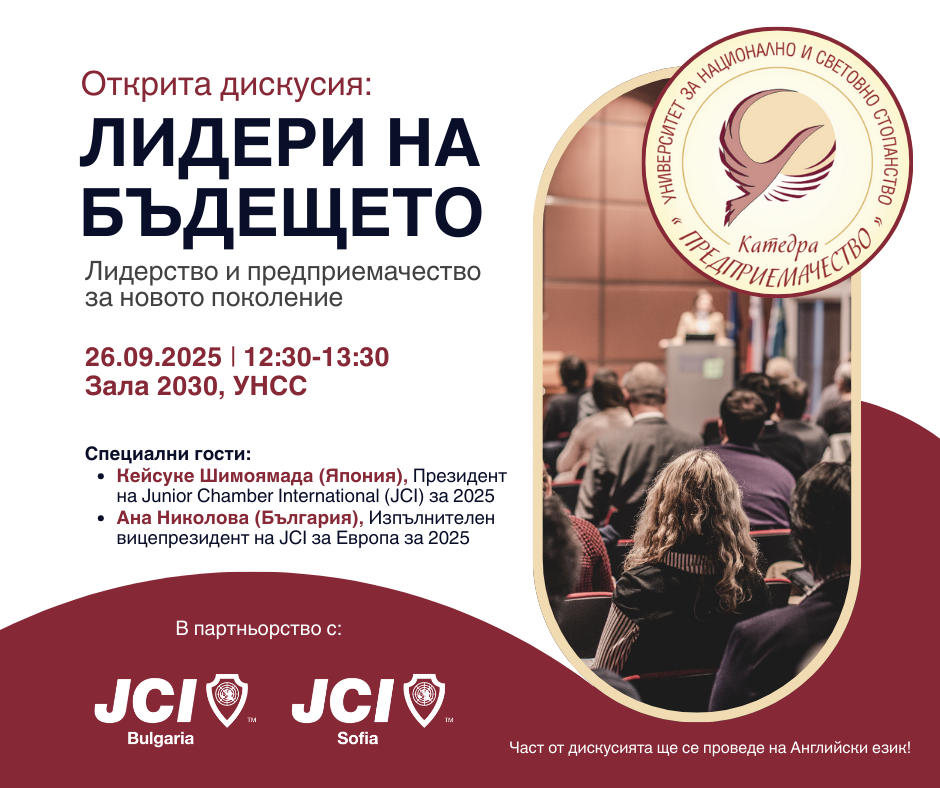 На тези и още въпроси ще търсим отговор по време на откритата дискусия „Лидери на бъдещето“, която ще се проведе на 26 септември 2025 г. от 12.30 до 13.30 ч. в зала 2030 на УНСС.