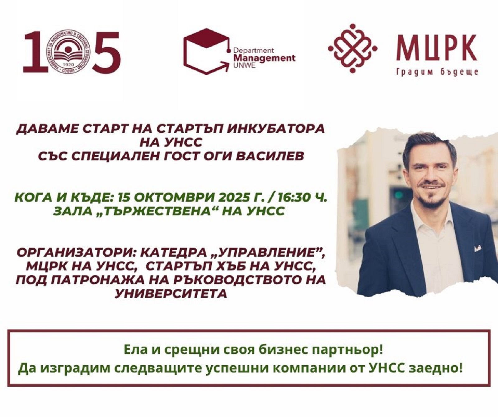 StartUp Kick-Off: от визия към успех петък, 03 октомври 2025 12:57 / Начало: сряда, 15 октомври 2025 16:30 Край: Място: зала „Тържествена“ Подробности: Тагове: StartUp Kick-Off: от визия към успех