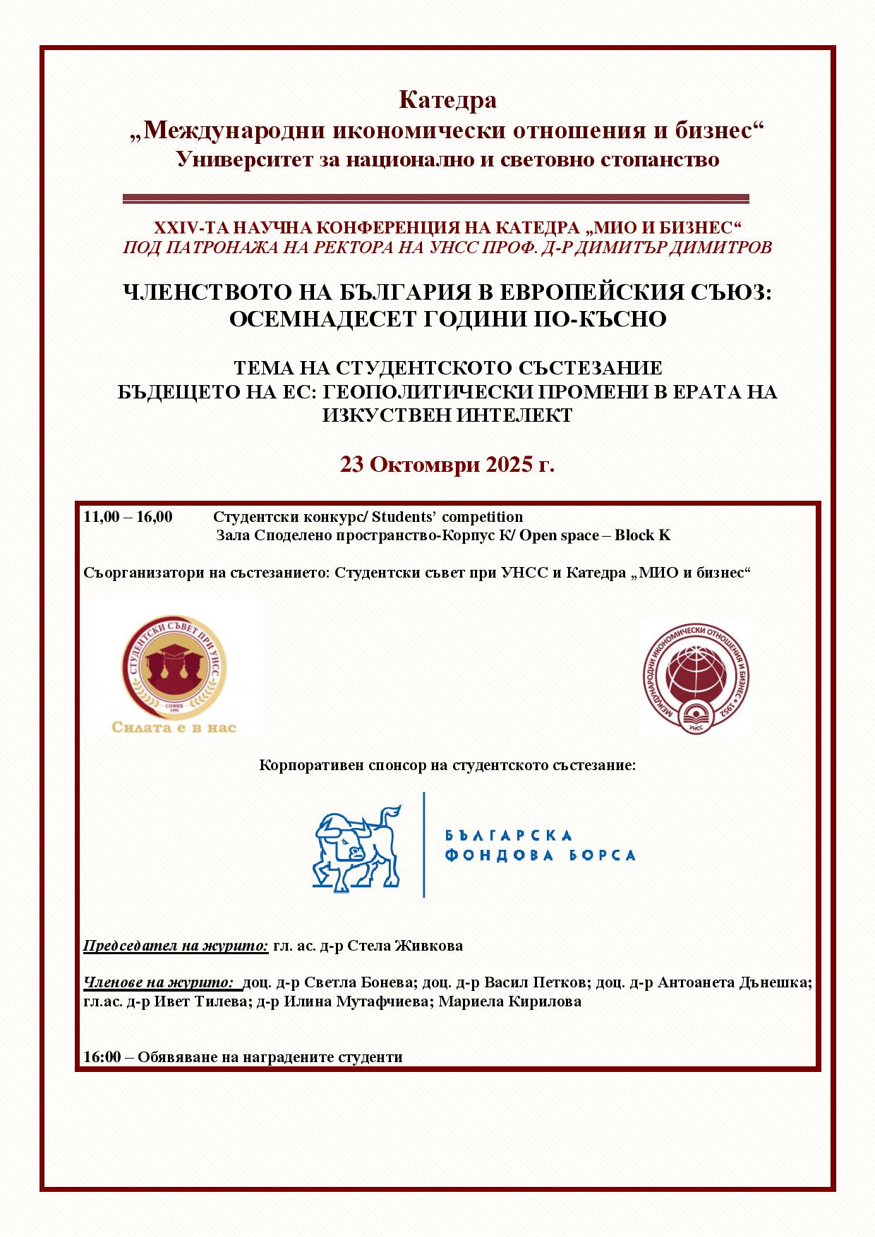 XXIV международна научна конференция „Членството на България в ЕС – 18 години по-късно“ - Студентското състезание за есе на тема „Бъдещето на ЕС: геополитически промени в ерата на изкуствен интелект“