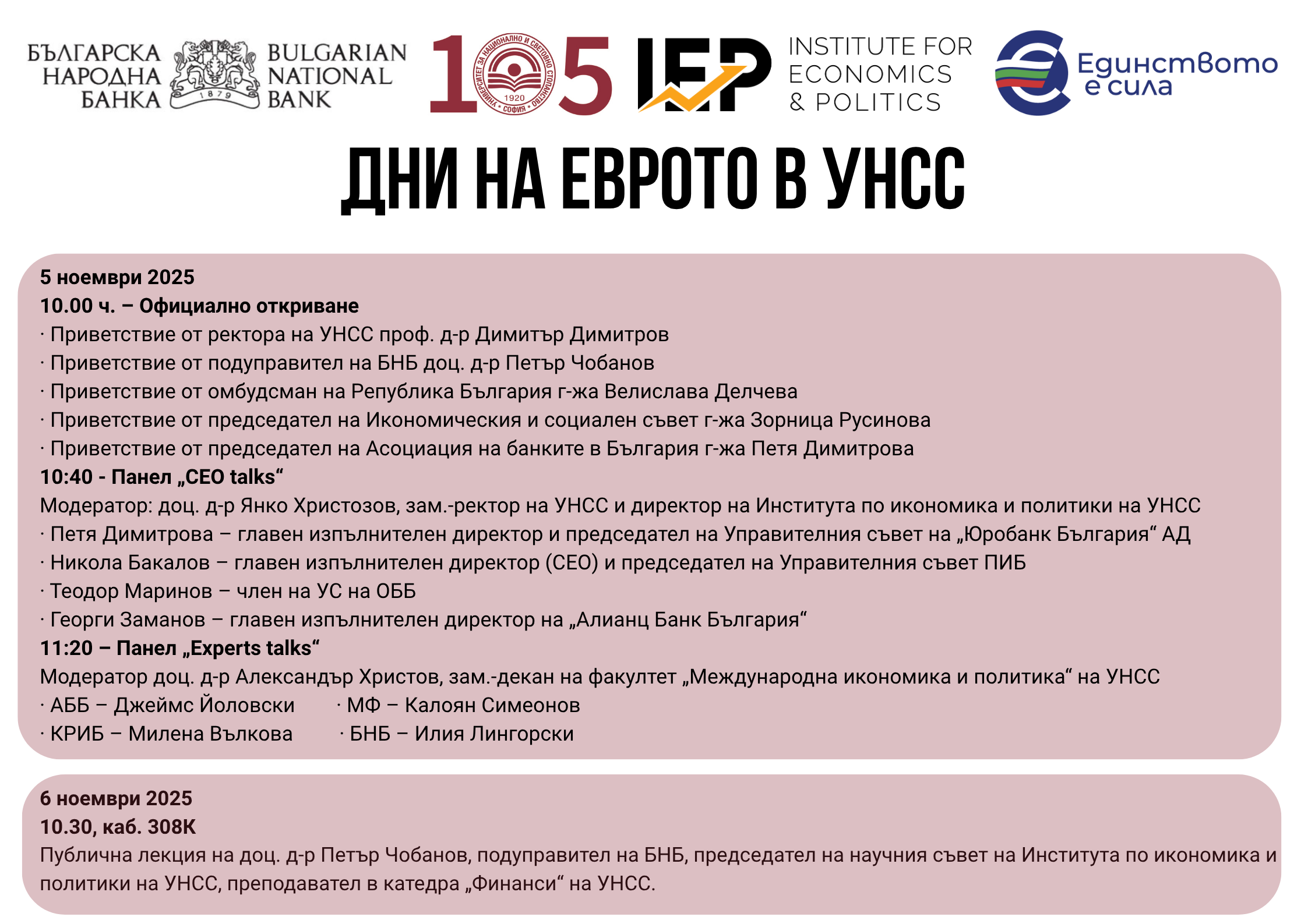 ДНИ НА ЕВРОТО В УНСС вторник, 04 ноември 2025 13:18 / Начало: сряда, 05 ноември 2025 10:00 Край: четвъртък, 06 ноември 2025 Място: аула „Максима" Подробности: Университетът за национално и световно стопанство, Институтът по икономика и политики на УНСС и Българската народна банка организират дискусии, свързани с присъединяването на България към еврозоната. Тагове: ДНИ НА ЕВРОТО В УНСС