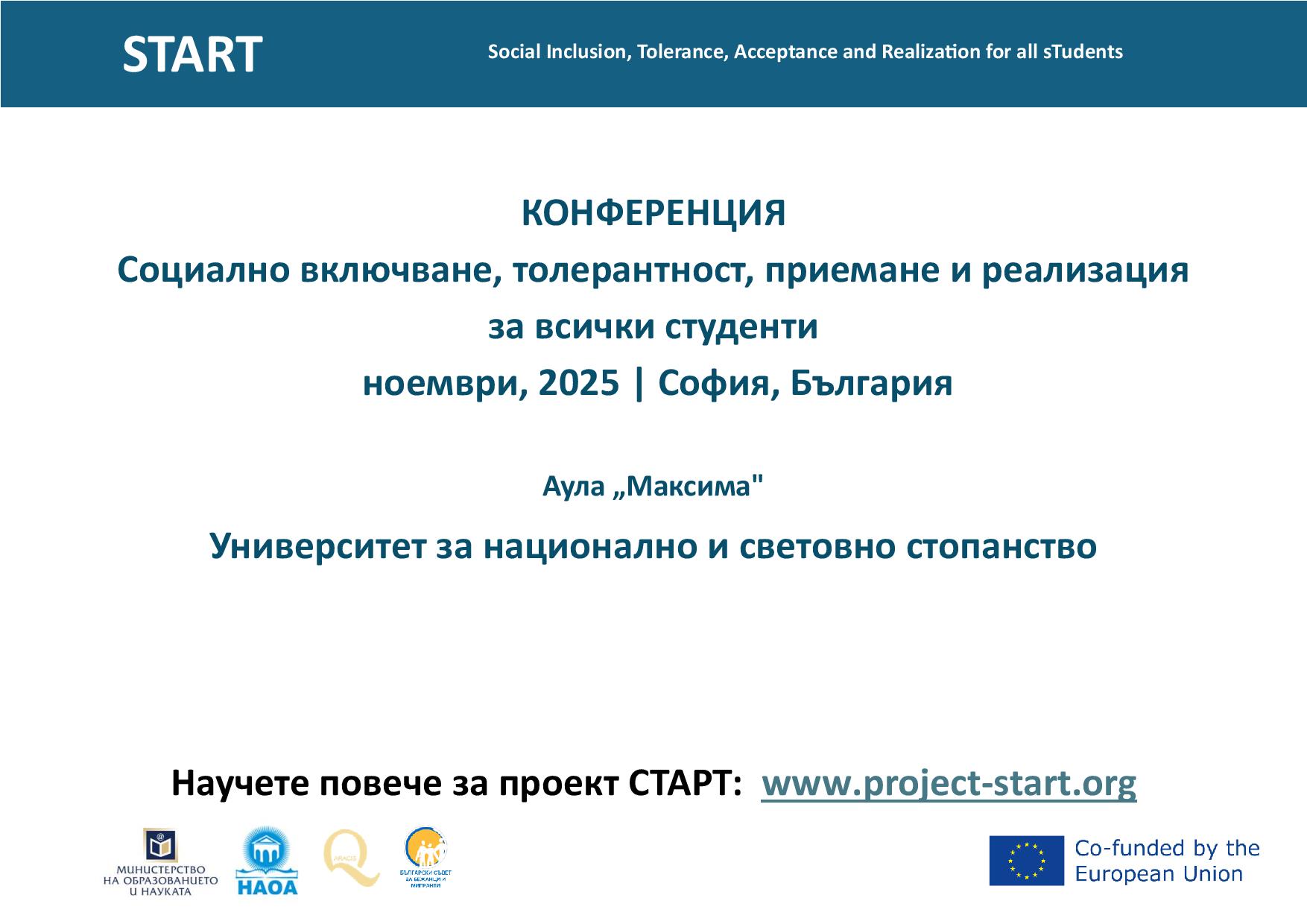Финална конференция по проект START - Социално включване, толерантност, приемане и реализация за всички студенти петък, 14 ноември 2025 16:28 / Начало: понеделник, 17 ноември 2025 9:30 Край: вторник, 18 ноември 2025 Място: аула „Максима" Подробности: ПРОГРАМА Повече информация за проект START можете да намерите ТУК. Тагове: Финална конференция по проект START - Социално включване, толерантност, приемане и реализация за всички студенти