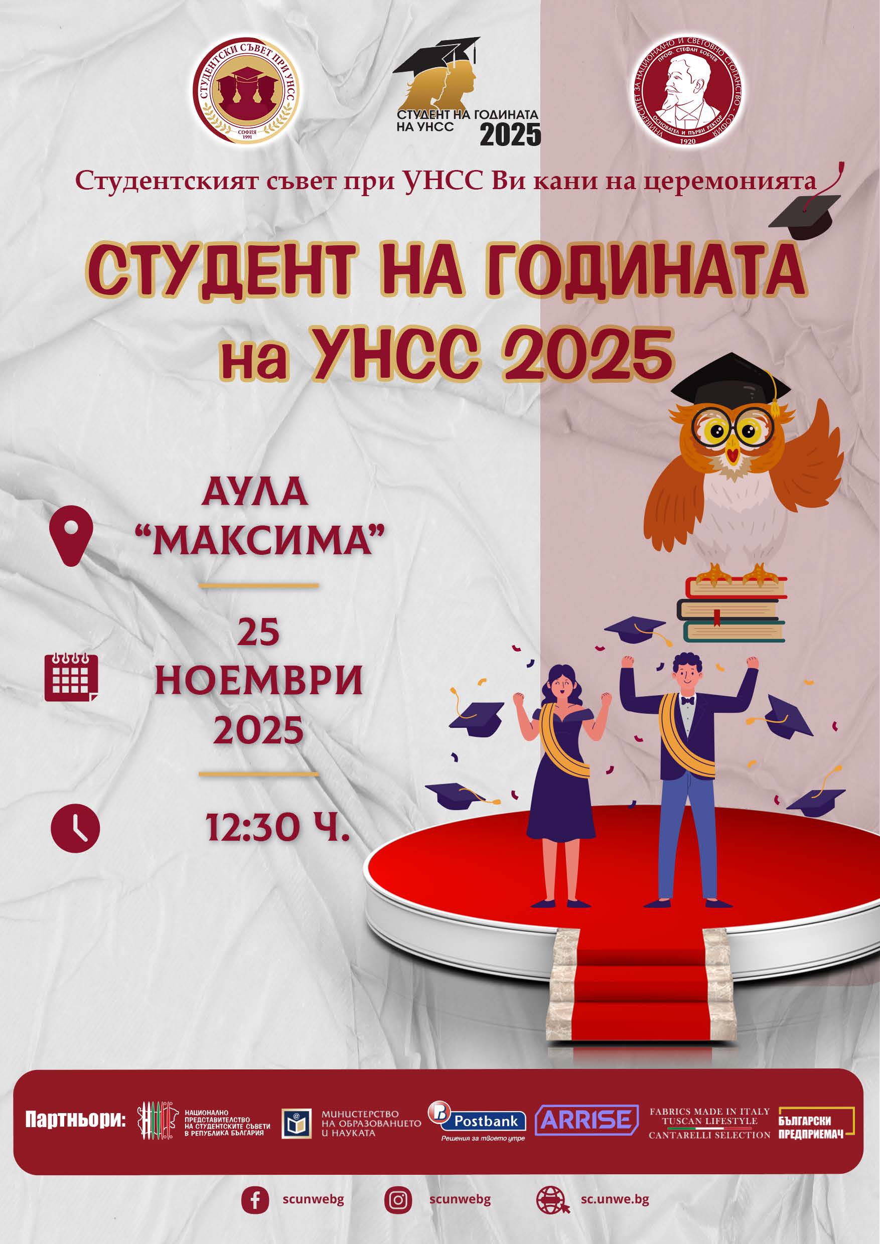Студент на годината на УНСС 2025 сряда, 19 ноември 2025 11:51 / Начало: вторник, 25 ноември 2025 12:30 Край: Място: аула „Максима" Подробности: Тагове: Студент на годината на УНСС 2025