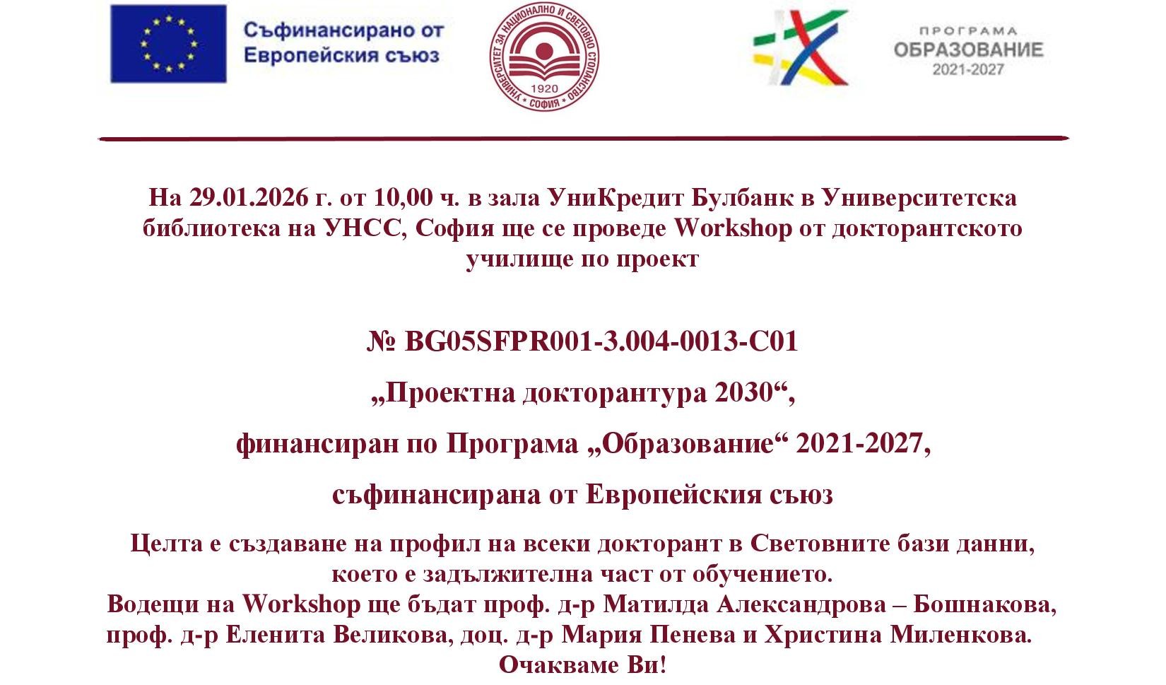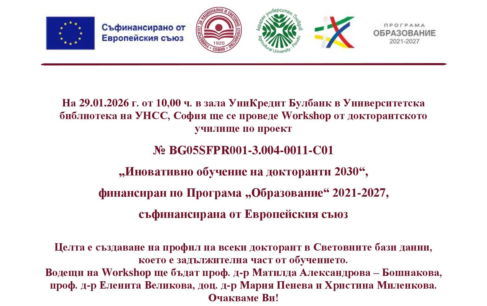> Workshop, организиран от докторантското училище за участниците в проекти „Иновативно обучение за докторанти 2030“ и „Проектна докторантура 2030“