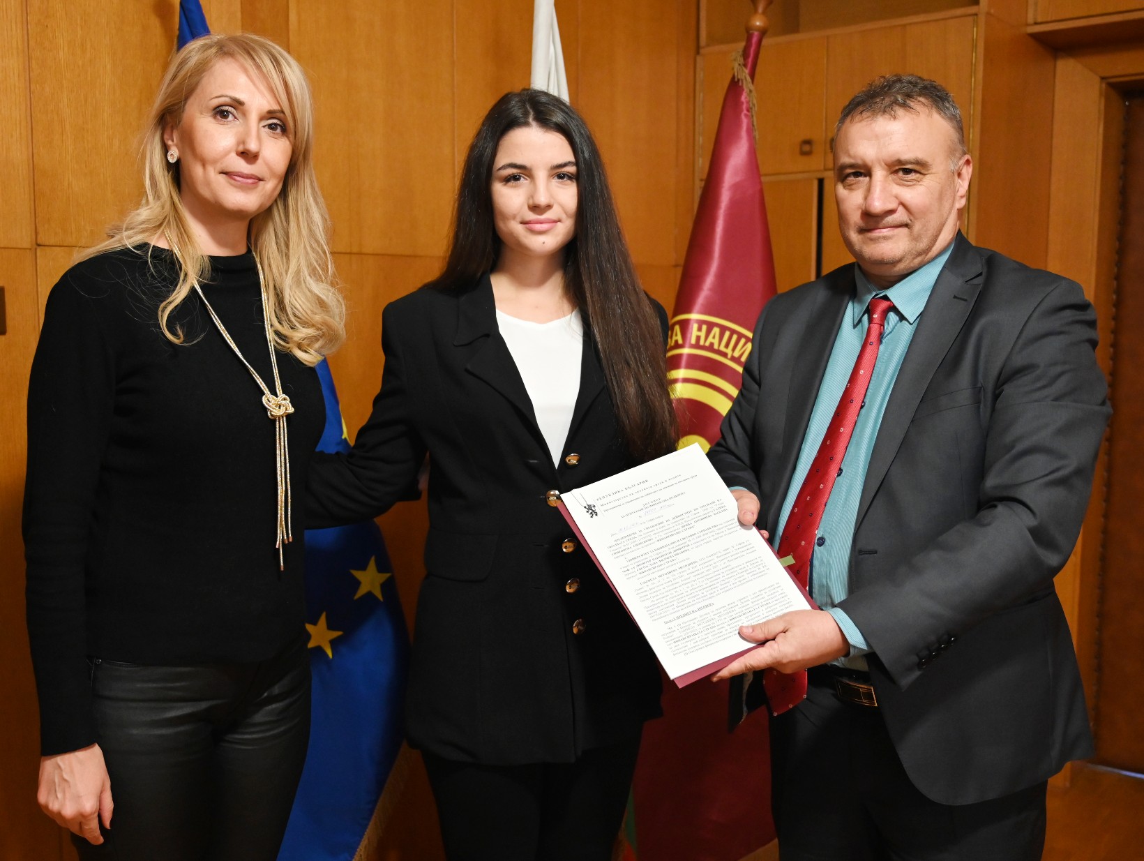 Ректорът проф. Димитров и г-жа Галина Симеонова връчват договора за стипендия на Габриела Методиева |