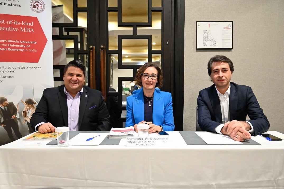 Г-н Антъни Престън, зам.-декан по бизнес програми и международно сътрудничество на College of Business, NIU, се присъедини към думите на ректора, че това е едно съвсем ново начинание за България: „Ние не за първи предлагаме международни програми като тази, имаме кампуси в Китай и Колумбия и сме изключително доволни да работим с УНСС, за да осъществим магистърската програма по бизнес администрация и в България“. Той разясни на присъстващите, че студентите ще получат две дипломи - една от УНСС и една от Northern Illinois University (NIU) като дипломата от техния университет е абсолютно идентична на тази, която получават всички студенти, завършили програмата в САЩ.