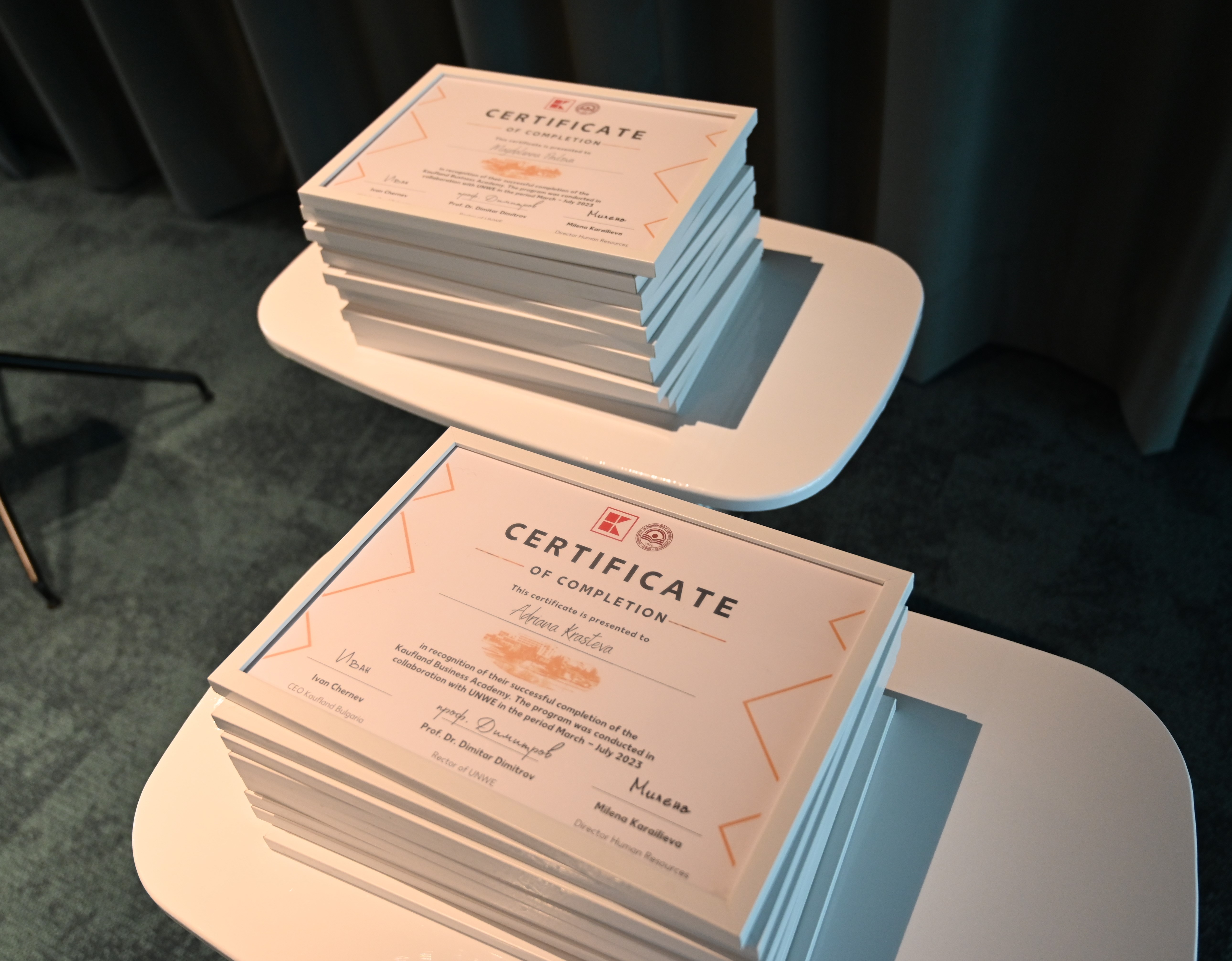 На официална церемония в присъствието на ректора на УНСС проф. д-р Димитър Димитров курсистите от първия випуск на съвместната Бизнес академия между УНСС и Kaufland получиха своите сертификати за завършване на програмата. В рамките на близо 3 месеца 30 студенти имаха възможността да станат част от първата по рода си изцяло бизнес ориентирана академия, провеждана от експерти на най-голямата верига у нас.