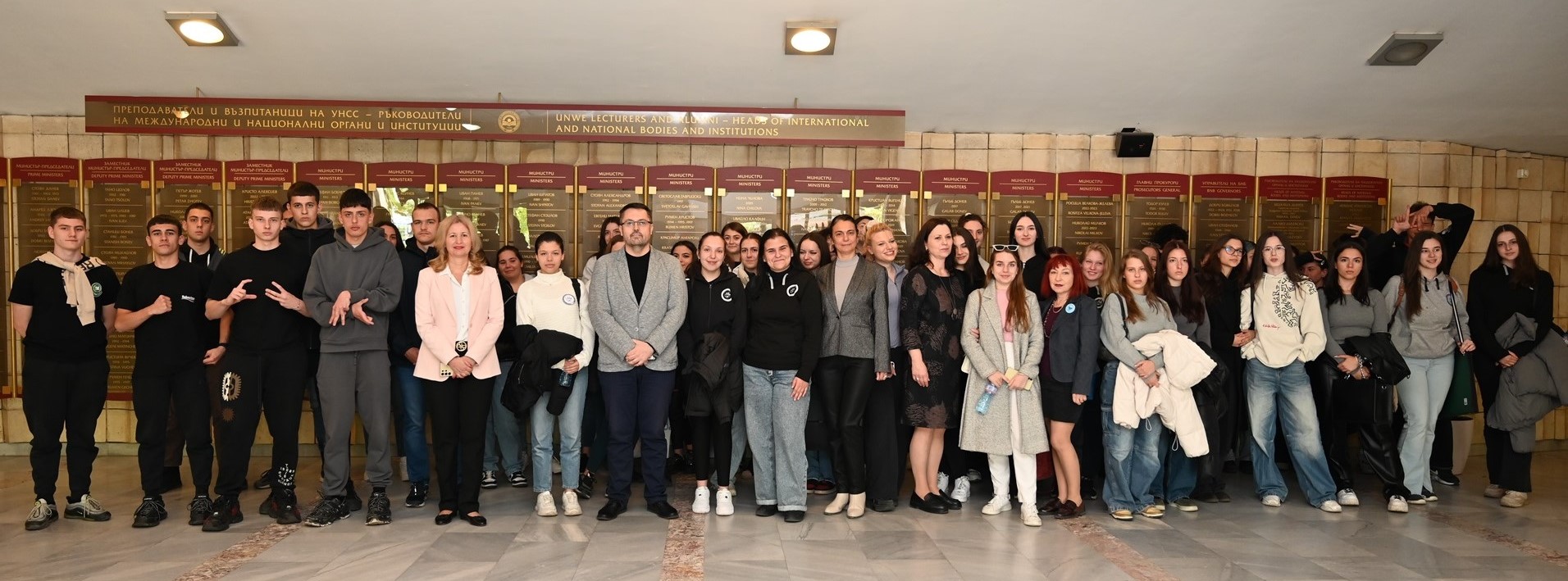 „Изключително ми е приятно, че мога да ви посрещна в УНСС и да ви приветствам от името на ректора проф. д-р Димитър Димитров“, обърна се към учениците проф. д-р Цветана Стоянова, зам.-ректор по институционално и бизнес сътрудничество и студентски политики. Тя допълни: „За нас е удоволствие да ви покажем част от условията, в които учат нашите студенти, включително корпус „К“, конгресния център с аула „Максима“, реновираната библиотека и музея“. В УНСС имаме и отлични възможности за спорт в комплекс „Бонсист", а нашите отбори са носители на много купи и медали. Университетът предлага голям брой специалности, от които имате възможност да избирате, а преподавателите, които ще ви обучават са на световно ниво.“ Проф. Стоянова се спря и на връзката с бизнеса, и на подкрепата, която УНСС получава от партньорски компании, свързани с изграждане на споделени пространства за студентите, стартиране на бизнес академии, стипендии за изявени студенти и подкрепа за техните предприемачески идеи чрез Стартъп хъба към МЦРК. Тя подчерта, че УНСС получава няколко поредни години наградата на работодателите за най-добър партньор на бизнеса и преди няколко седмици - за „Най-иновативен университет“. „Уверена съм, че ще направите правилния избор и след една година ще станете част от голямото академично семейство на нашия университет, защото „Пътят на успеха минава през УНСС“, заключи тя.