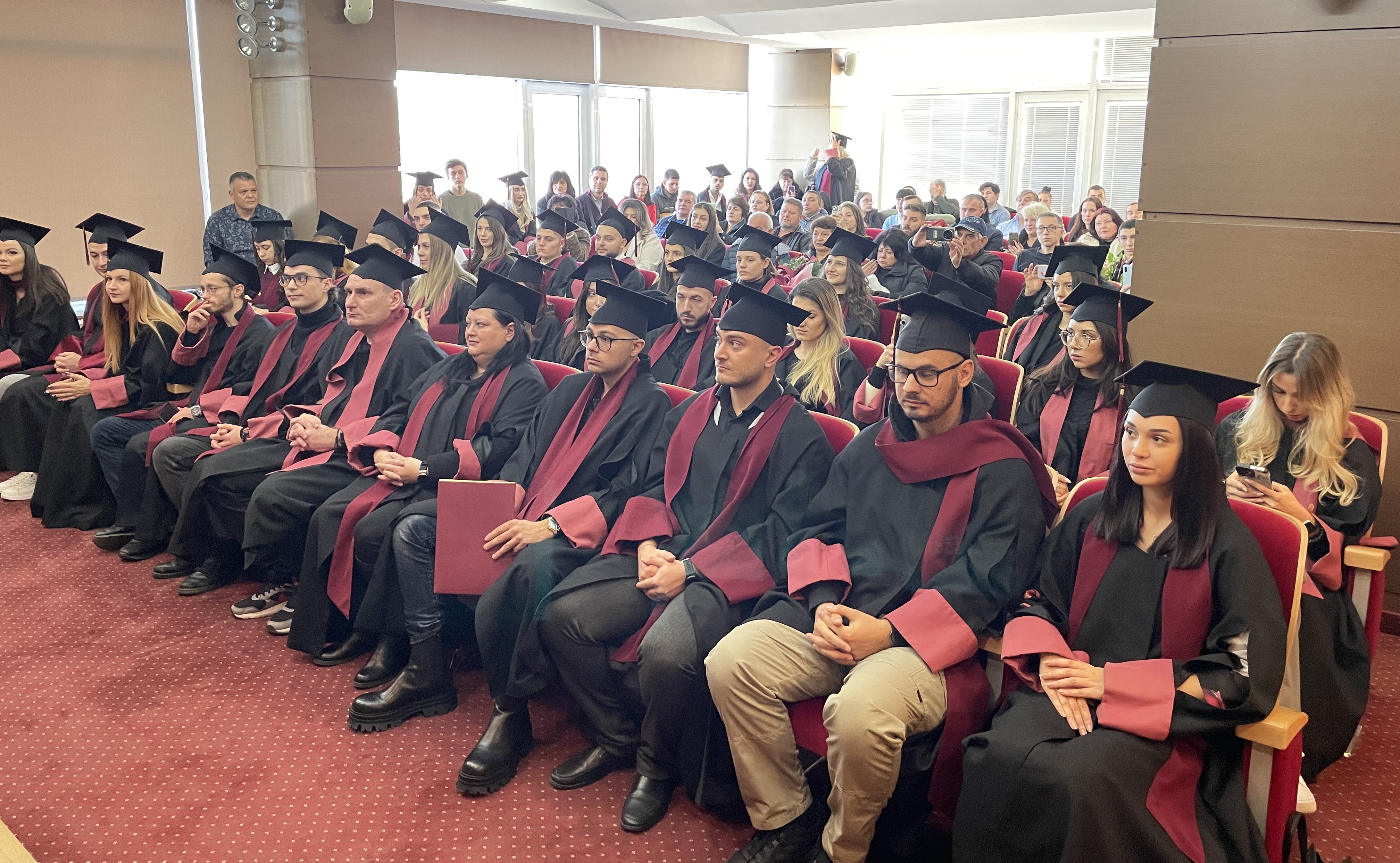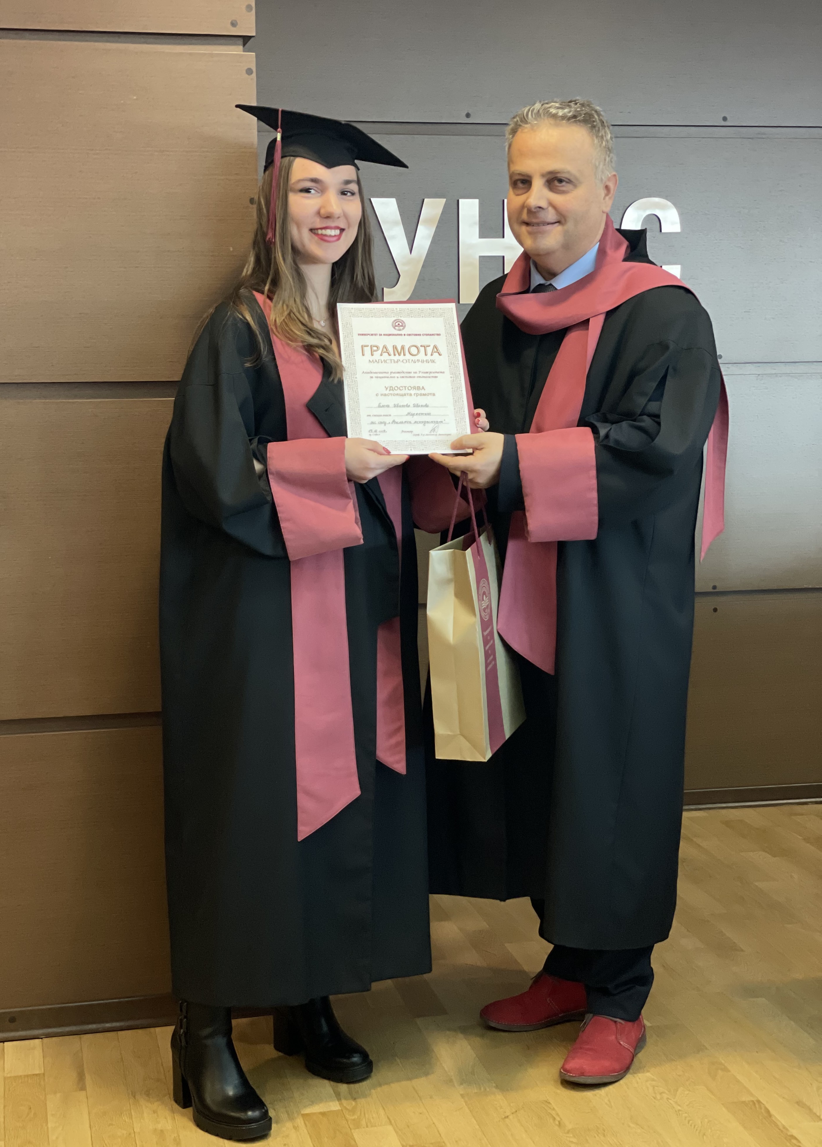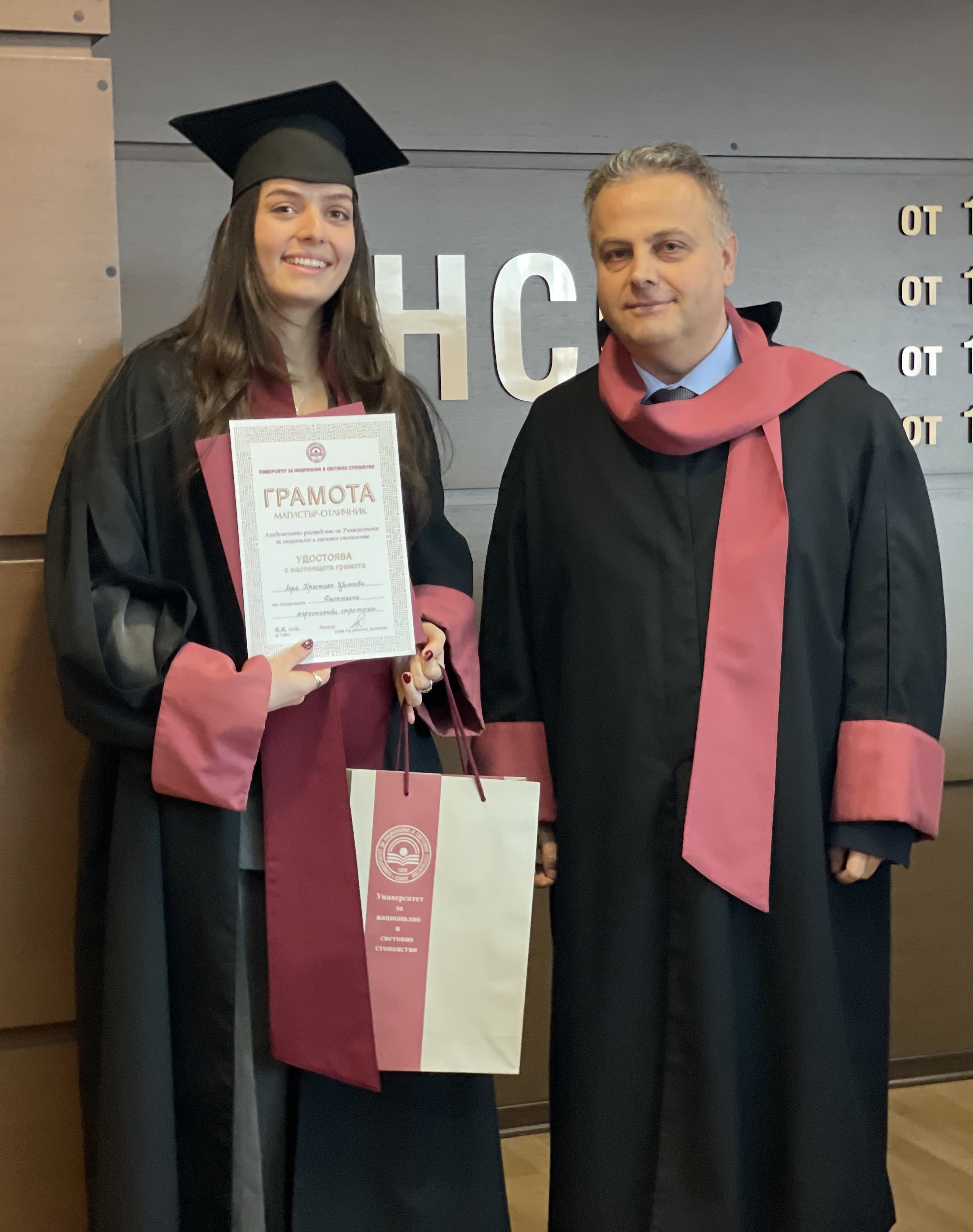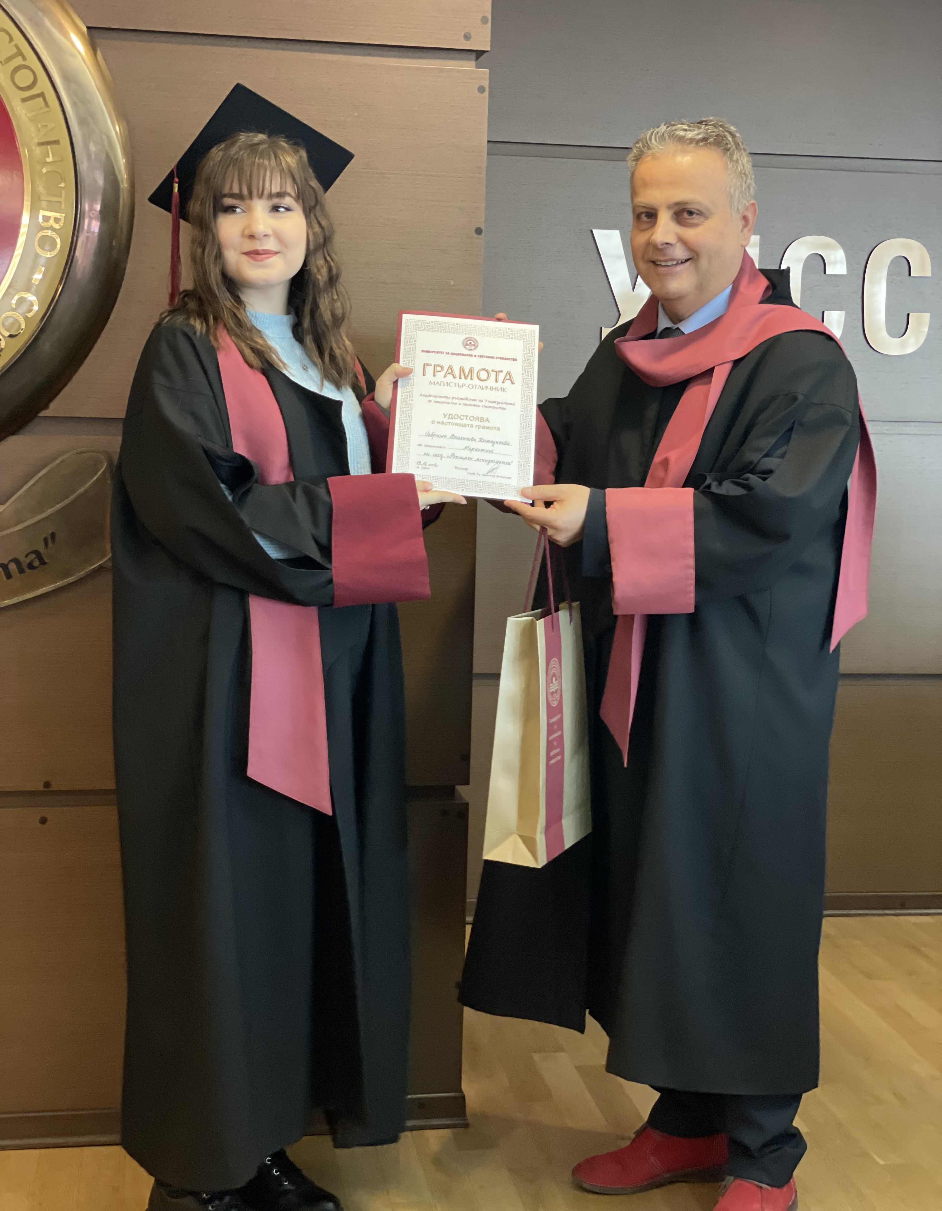 Приветствие от името на завършващите поднесе Лора Цветкова. Тя благодари на преподавателите за знанията, търпението и вдъхновението, а на родителите за тяхната подкрепа, независимо от обстоятелствата: „Днес не просто празнуваме края на едно пътуване, а поставяме началото на много нови приключения. Дипломирането ни като магистри не е просто вземане на диплома, то е символ на труд, упоритост и стремеж за развитие. По време на обучението си научихме, че успехът е постоянен процес на учене, адаптиране и израстване. Научихме се да посрещаме предизвикателствата и трудностите и да излизаме от тях като по-добри професионалисти и най-вече по-добри хора“.