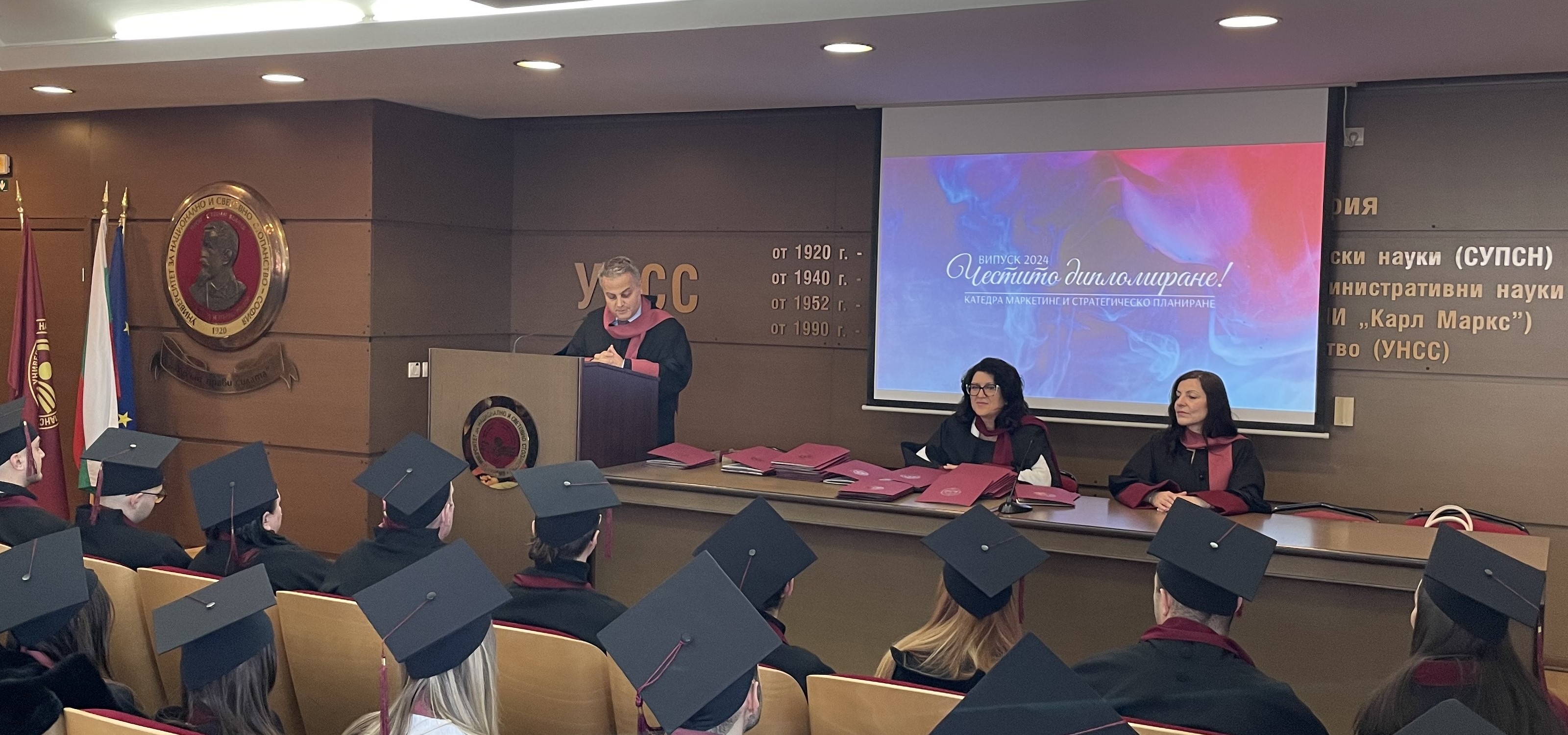На тържествена церемония в присъствието на преподаватели, родители и приятели магистрите от катедра „Маркетинг и стратегическо планиране“, випуск 2024, редовна и дистанционна форма на обучение, получиха своите дипломи.