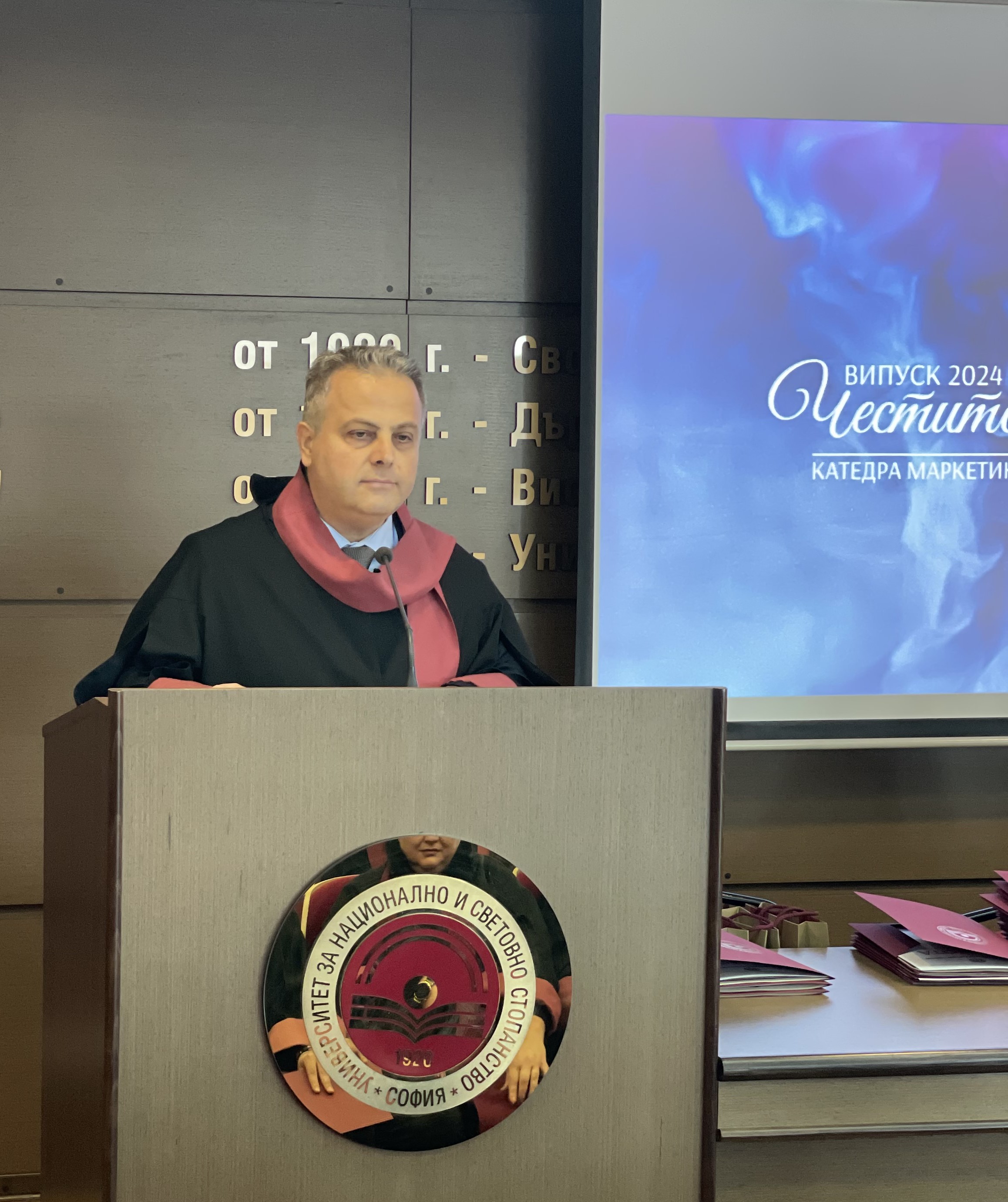 „От името на ректорското ръководство на УНСС и от името на всички ваши преподаватели искам да ви поздравя с успешното дипломиране като магистри в УНСС. Вярваме, че магистърските програми на нашата катедра, които неслучайно са най-желаните в нашия университет, поставят солидна основа и дават импулс за развитието ви като професионалисти в областта на маркетинга и планирането. Ние в УНСС знаем, че знанието дава сила, а силата дава свобода“, обърна се към абсолвентите проф. Маринов и им пожела „Натрупвайте и раздавайте знание. Бъдете силни, за да сбъднете мечтите си, и пазете свободата си, за да живеете достойно!“.