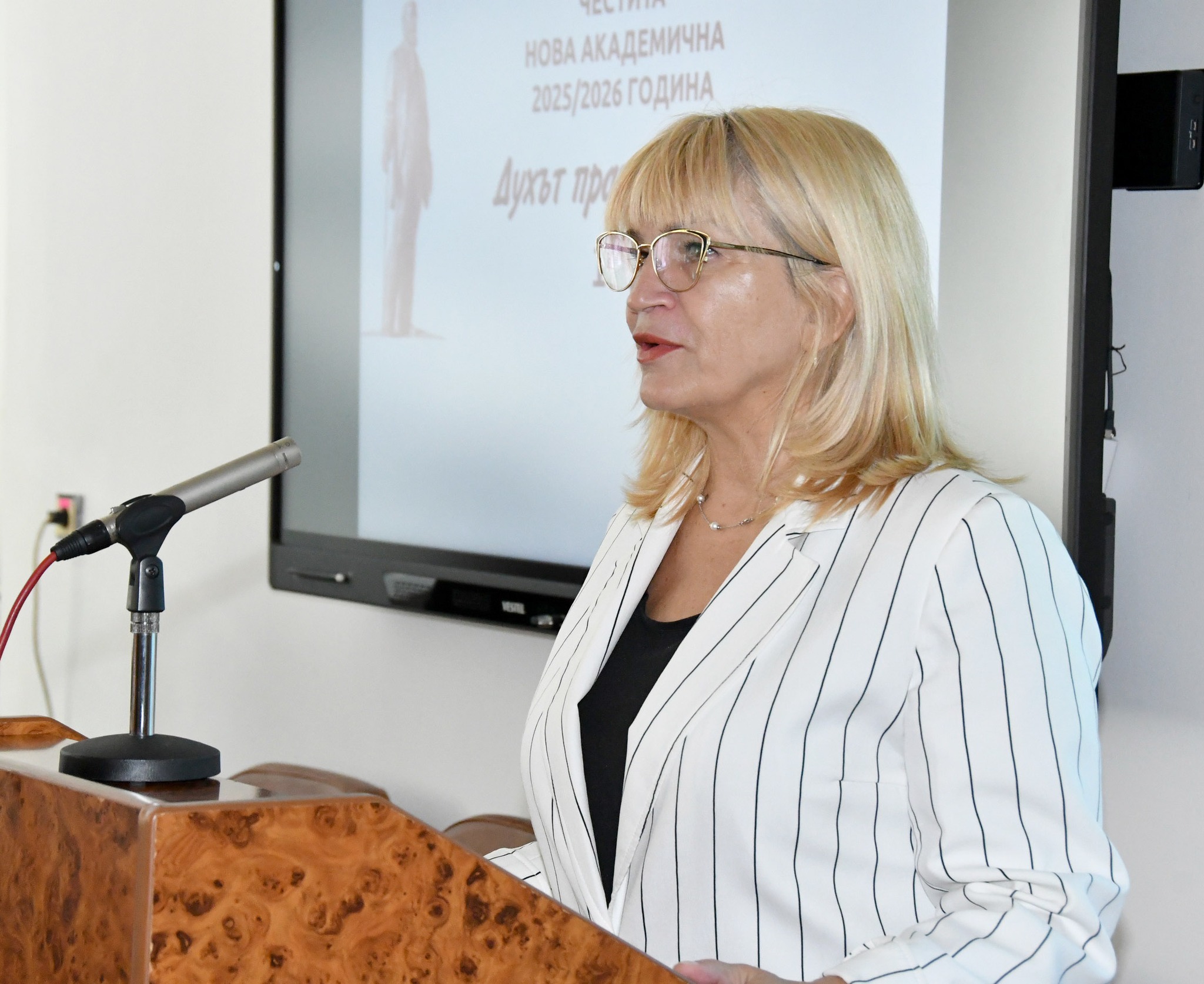 От името на първокурсниците магистри приветствие поднесе Красимира Славова, която подчерта мотивацията на работещите студенти да надграждат познанията, да обновяват непрекъснато знанията си и да продължават ученето през целия си живот.