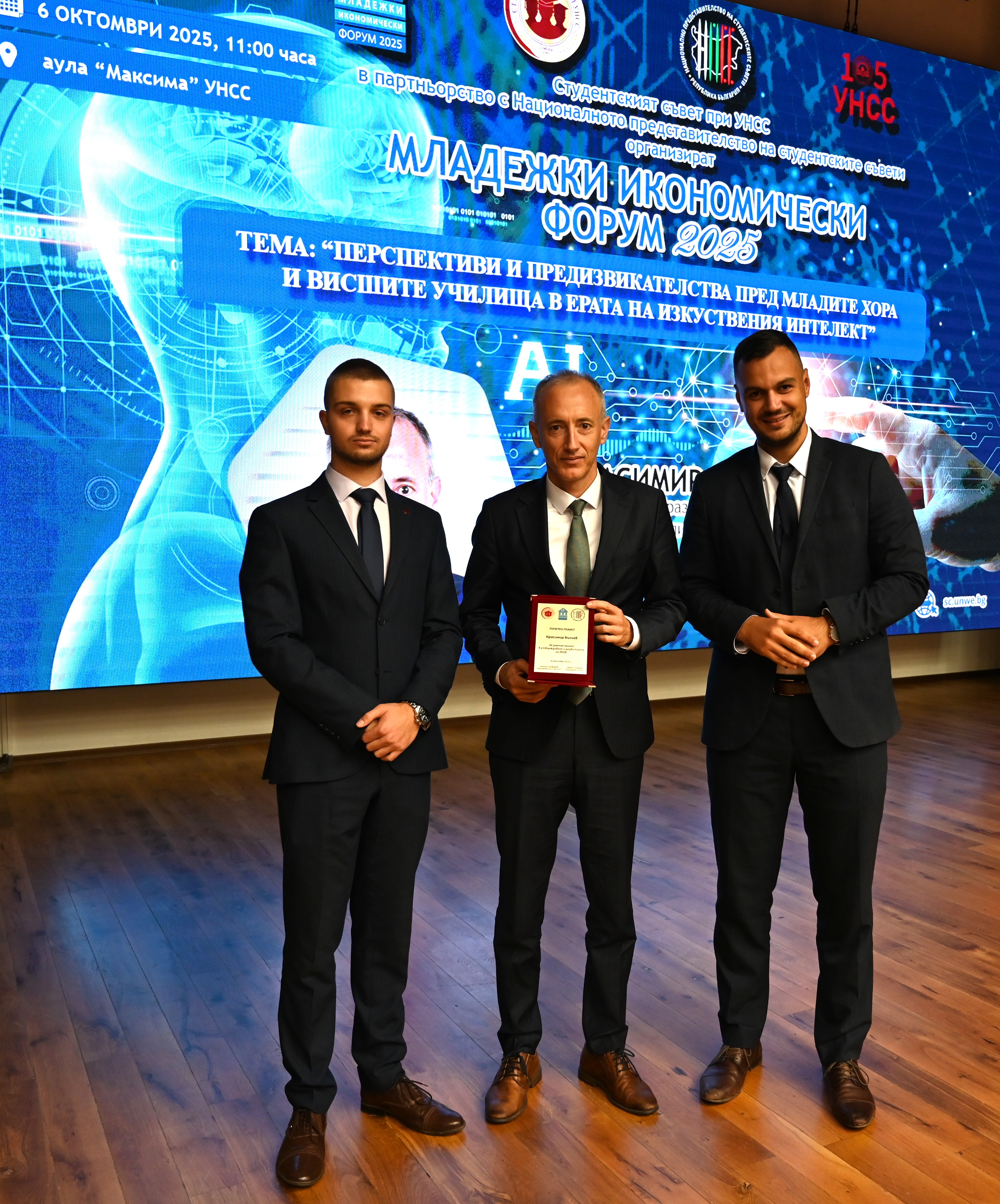 „Тази година Младежкият икономически форум си е постави за цел да обсъди една от най-актуалните и значими теми на съвремието – изкуствения интелект, с перспективите и предизвикателствата, които поставя пред младите хора и висшите училища. Очаквам оживена дискусия, защото живеем във времена на динамични промени, когато технологиите трансформират начина, по който мислим, учим, работим и общуваме. Изкуственият интелект не е просто инструмент – той е нова среда за развитие, която предлага огромни възможности, но и поставя сериозни предизвикателства, нови въпроси пред образованието – за ролята на преподавателя, за начина на усвояване и прилагане на знанията“, каза ректорът на УНСС проф. д-р Димитър Димитров и подчерта: „Изключително важно е младите хора да бъдат не само потребители, но и създатели на новите технологии, да бъдат носители на критично мислене, предприемачески дух и етична отговорност. Нашата мисия като университет е не просто да подготвяме добри специалисти, а да изграждаме личности – мислещи, етични, критични и иновативни млади хора, които да водят обществото напред. Убеден съм, че висшите училища имат ключовата роля в динамичния процес на технологичните промени, като подготвят компетентни специалисти и активни създатели на иновативно и устойчиво бъдеще“.
