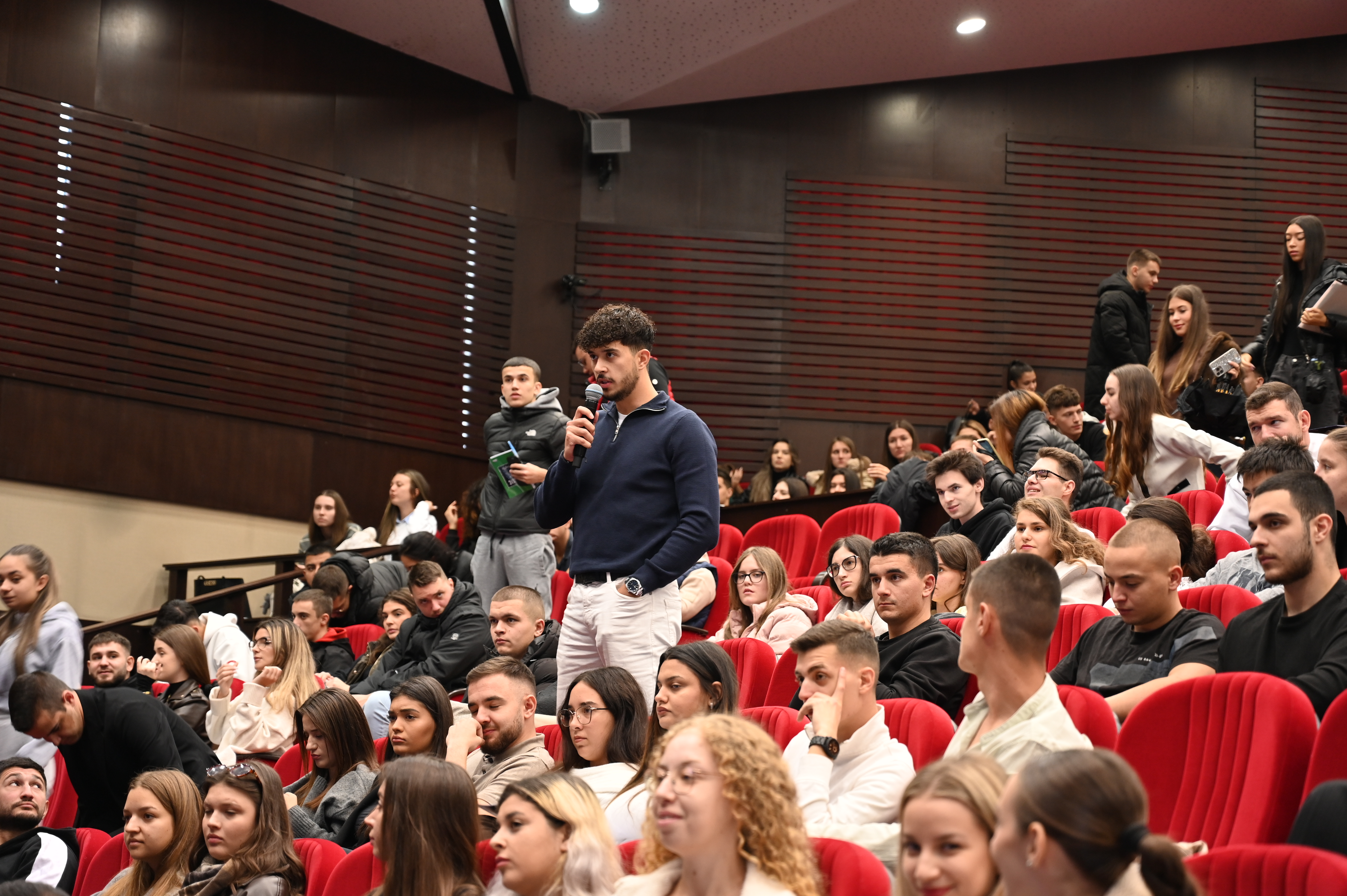 По време на форума студентите имаха възможност да зададат своите въпроси към министъра по теми, свързани с приетите повече студенти държавна поръчка, учебните такси и въвеждането на ИИ във висшето образование.