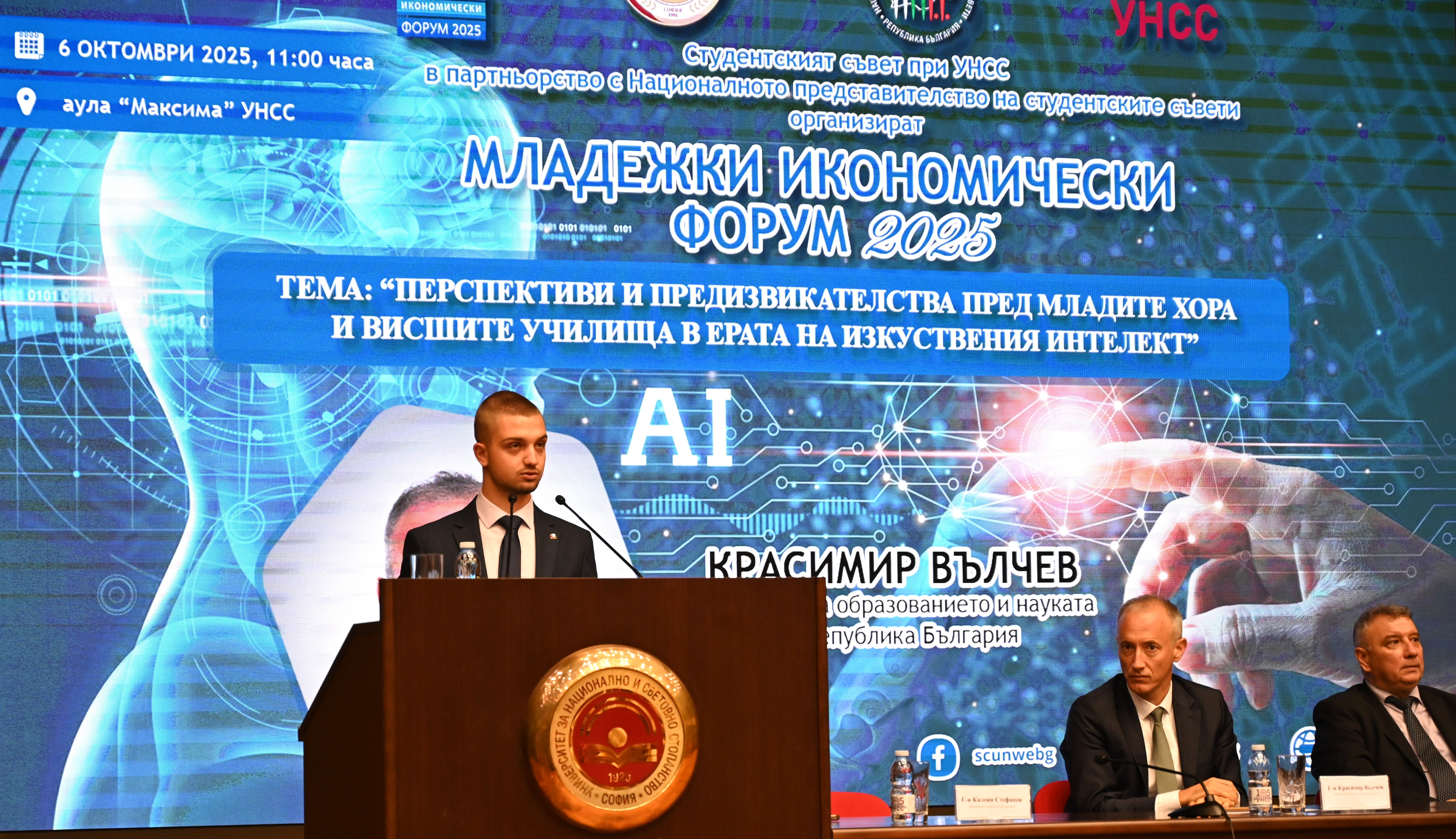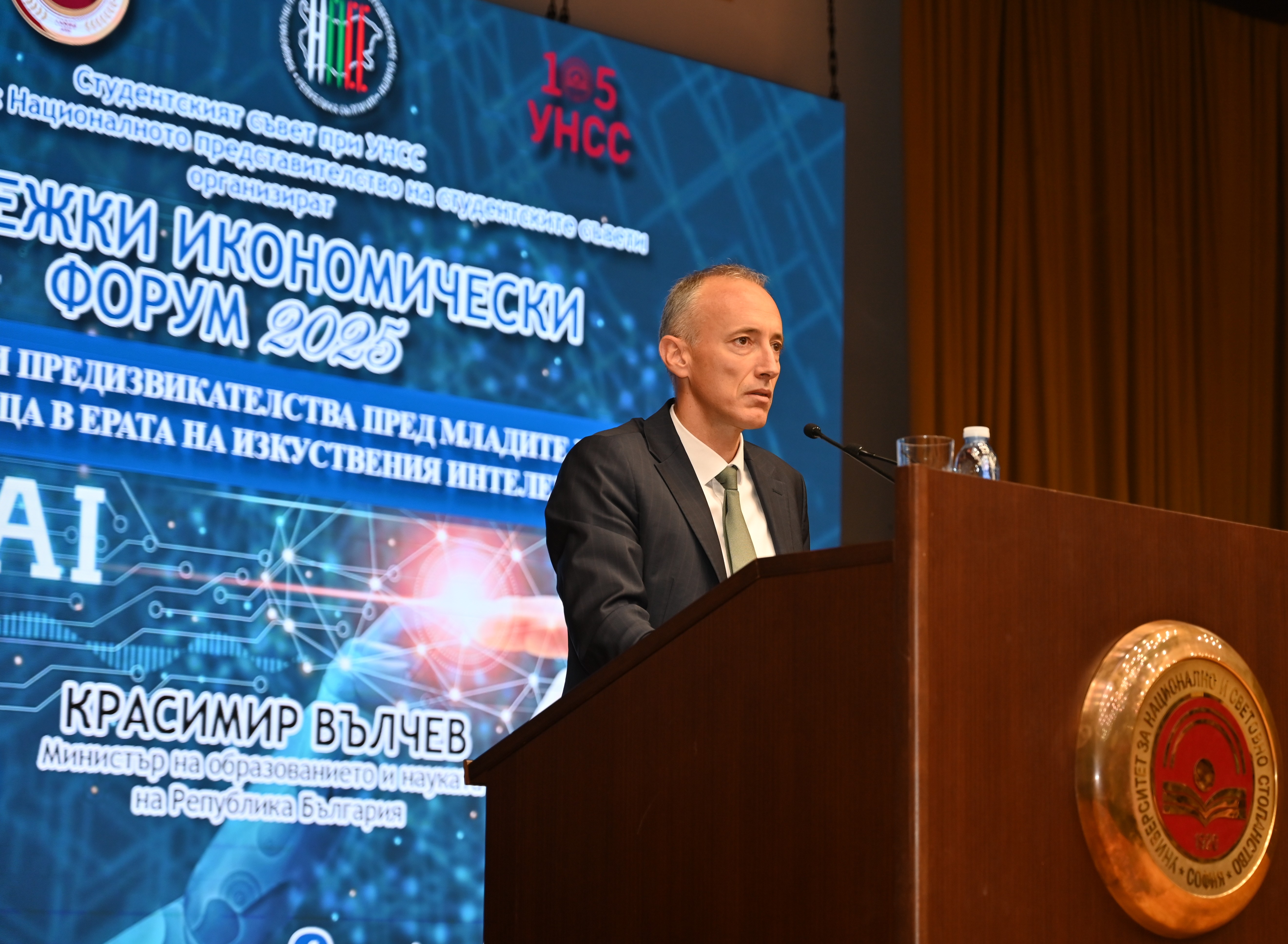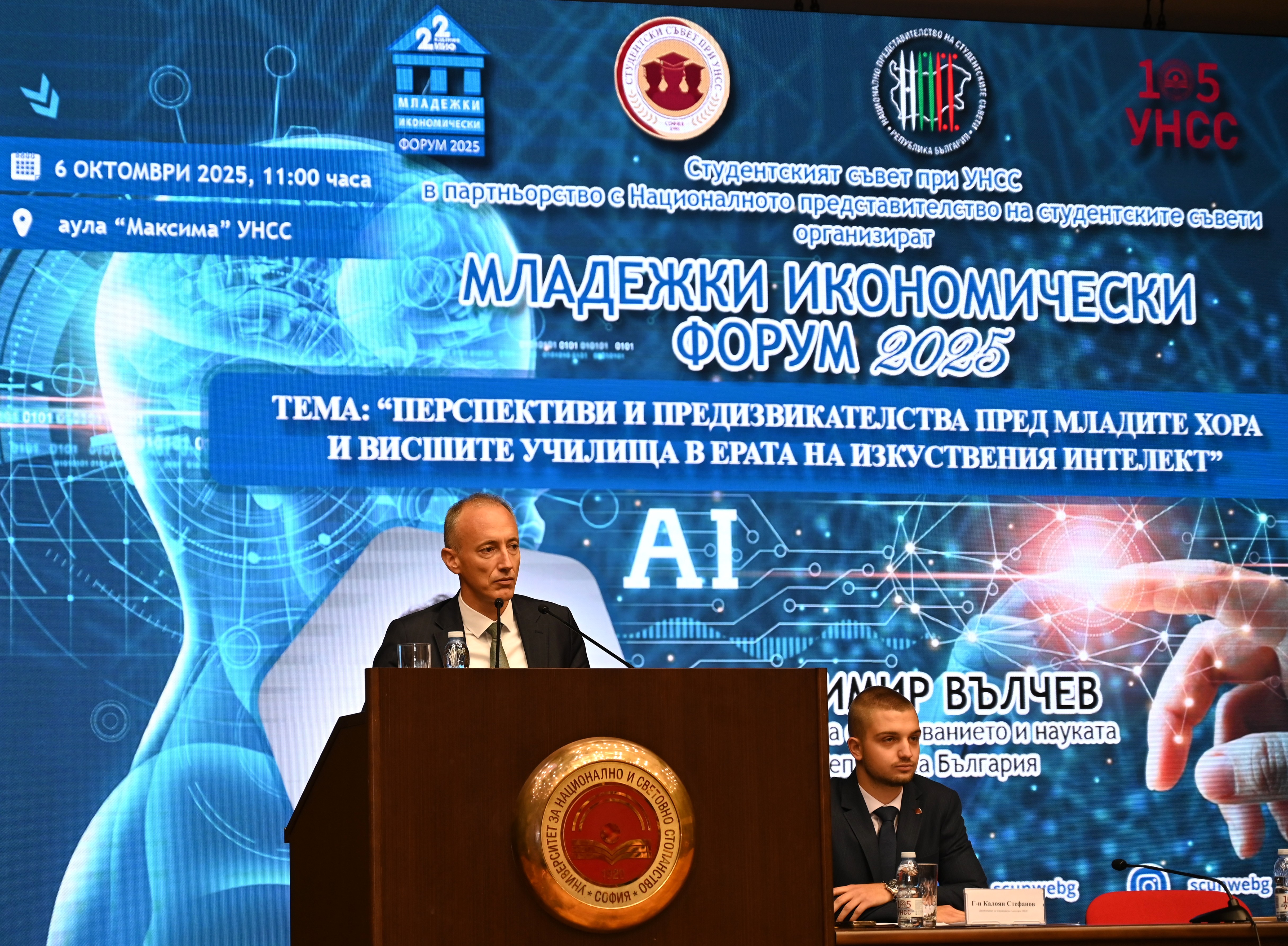 Изкуственият интелект ще концентрира силна добавена стойност, но и ще увеличи неравенствата между страните. Икономиката ни ще расте, ако имаме повече дигитални създатели, а не само ползватели. Това каза министърът на образованието и науката Красимир Вълчев пред студенти по време на Младежкия икономически форум в УНСС. Той беше гост-лектор в първия ден на форума.