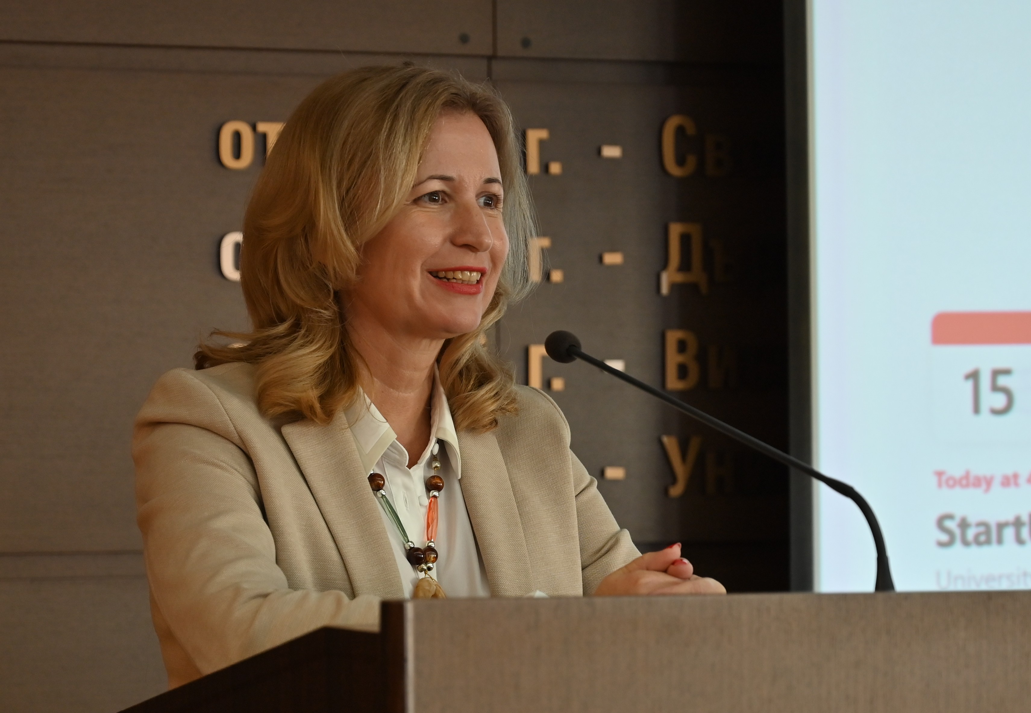 „За мен е изключително удоволствие, че днес даваме старт на Стартъп центъра на УНСС. След като беше приета визията за развитие на Центъра от Академичния съвет, днес вече развиваме дейности. Радвам се, че след стартъп срещата участниците ще имат възможност да участват и в нетуъркинг“, каза проф. д-р Цветана Стоянова, зам.-ректор по институционално и бизнес сътрудничество и студентски политики. „Подписахме меморандум за сътрудничество преди няколко месеца, а вече имаме множество съвместни инициативи, което само може да ни радва“, допълни тя.