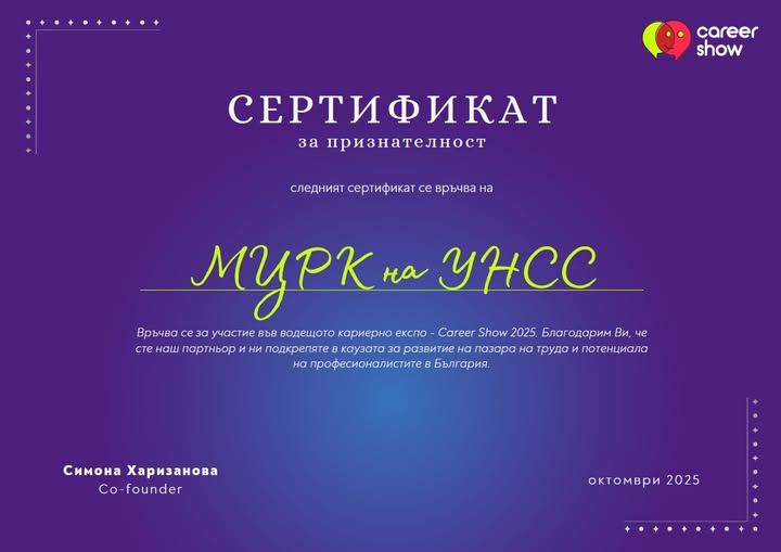 Career Show 2025 отново се превърна в място за среща на академичните институции, бизнеса и младите професионалисти, а участието на УНСС и МЦРК показа ангажираността на университета към модерното, практическо и ориентирано към бъдещето образование.