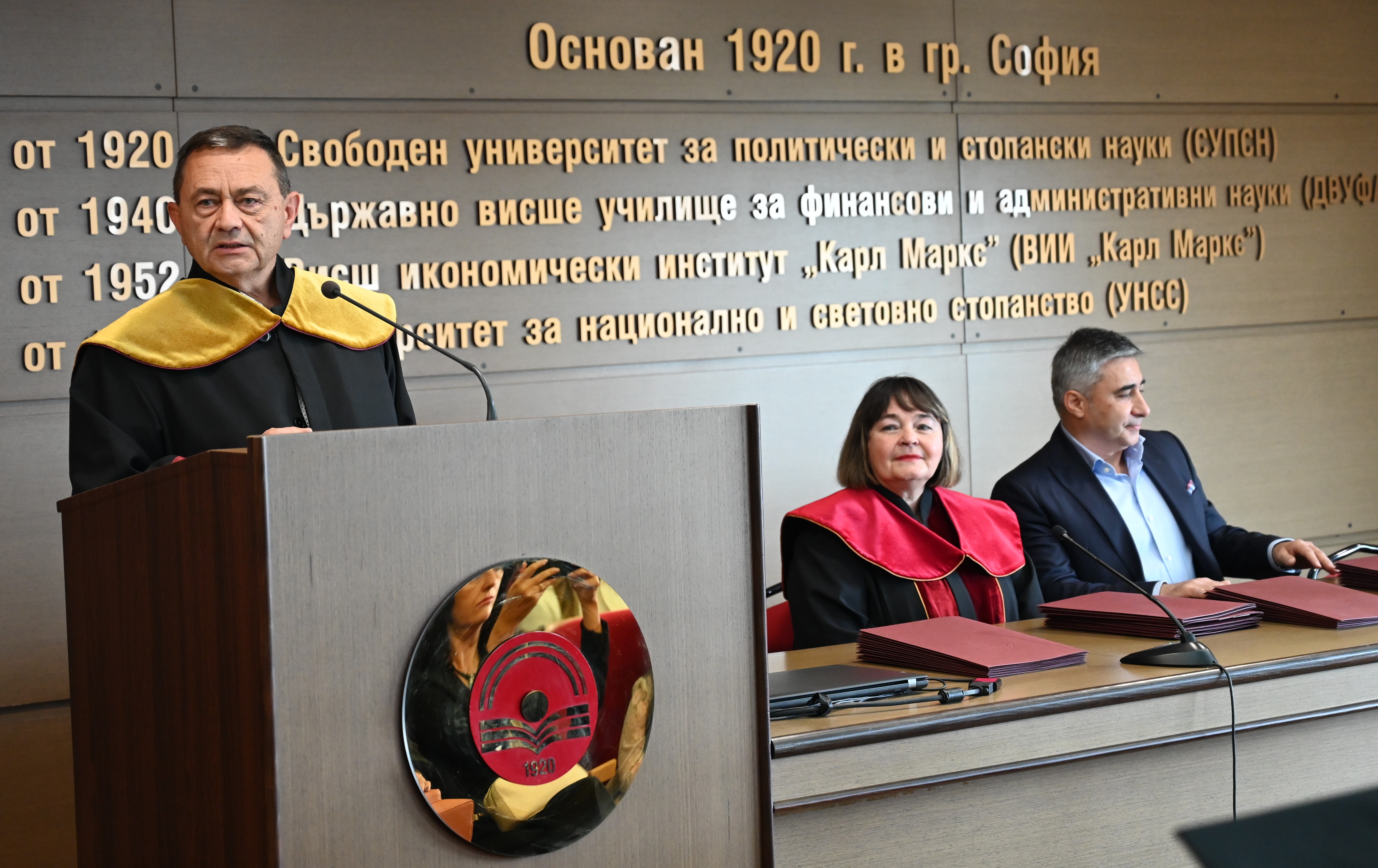 Доц. д-р Мирослав Димитров, декан на Юридическия факултет, проф. д-р Матилда Александрова, зам.-ректор по учебната дейност, съдия Любомир Гайдов, зам.-председателя на ВАС (от дясно наляво)