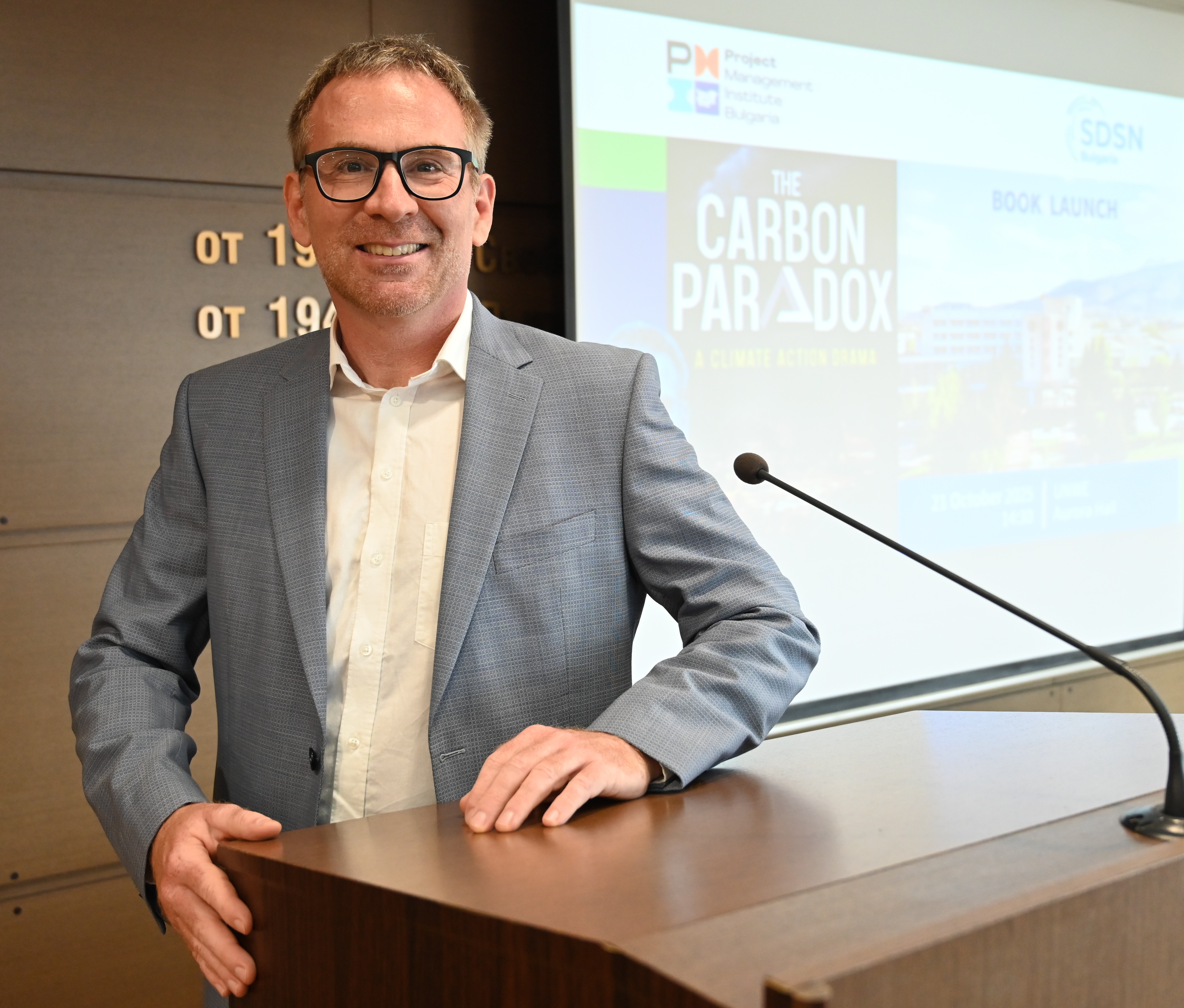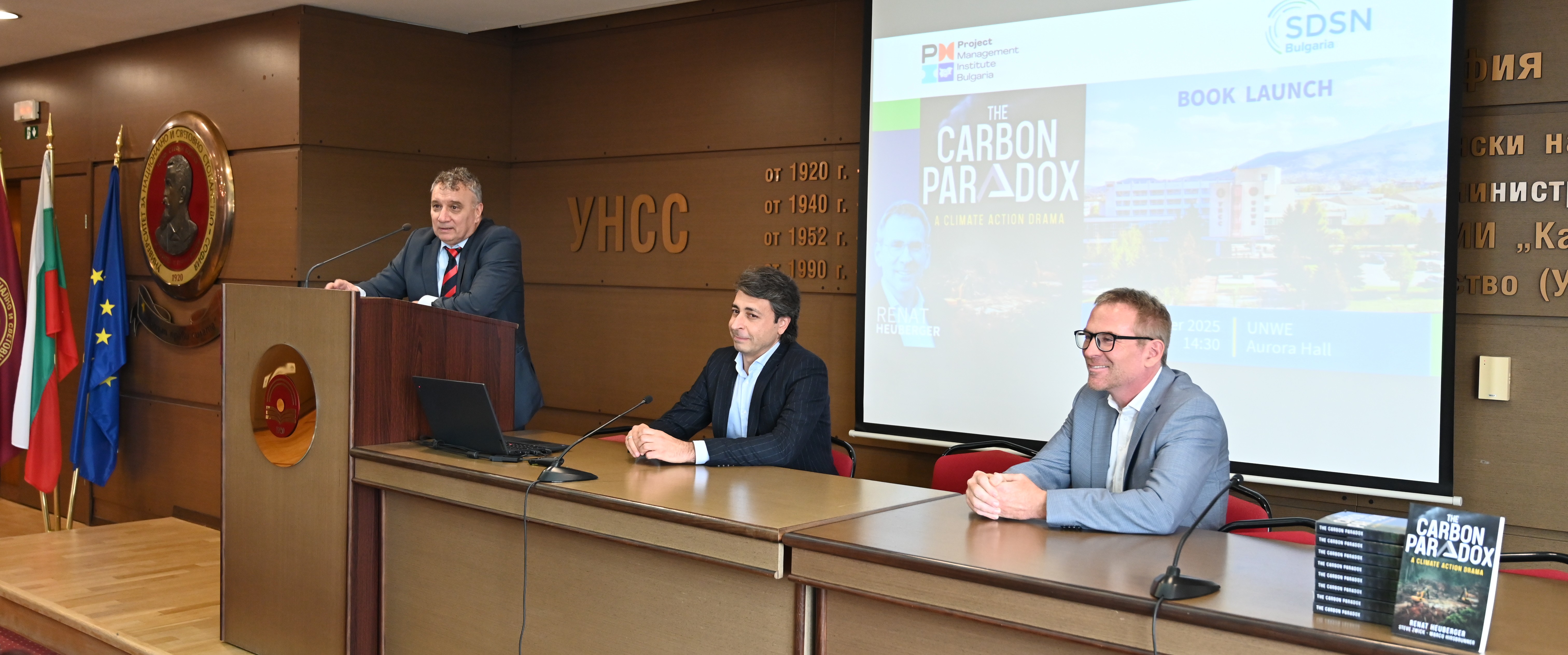 Световно признатият предприемач и експерт в областта на устойчивостта, климатичните иновации и зеления преход Ренат Хойбергер представи книгата си The Carbon Paradox пред студенти и преподаватели в зала „Тържествена“. Събитието беше организирано от Националната мрежа за устойчиво развитие SDSN Bulgaria, координирана от УНСС, и PMI Bulgaria Chapter. SDSN Bulgaria е под председателството на ректора на УНСС проф. д-р Димитър Димитров и доц. д.н. Михаил Мусов, зам.-председател е доц. д-р Щерьо Ножаров, гл. секретар по бюджет и финанси на УНСС. Мениджърска позиция в мрежата заемат гл. ас. д-р Атанас Димитров, научен секретар на катедра „ Национална и регионална сигурност“ и ас. д-р Габриела Наскова, преподавател в катедра „Информатика“.