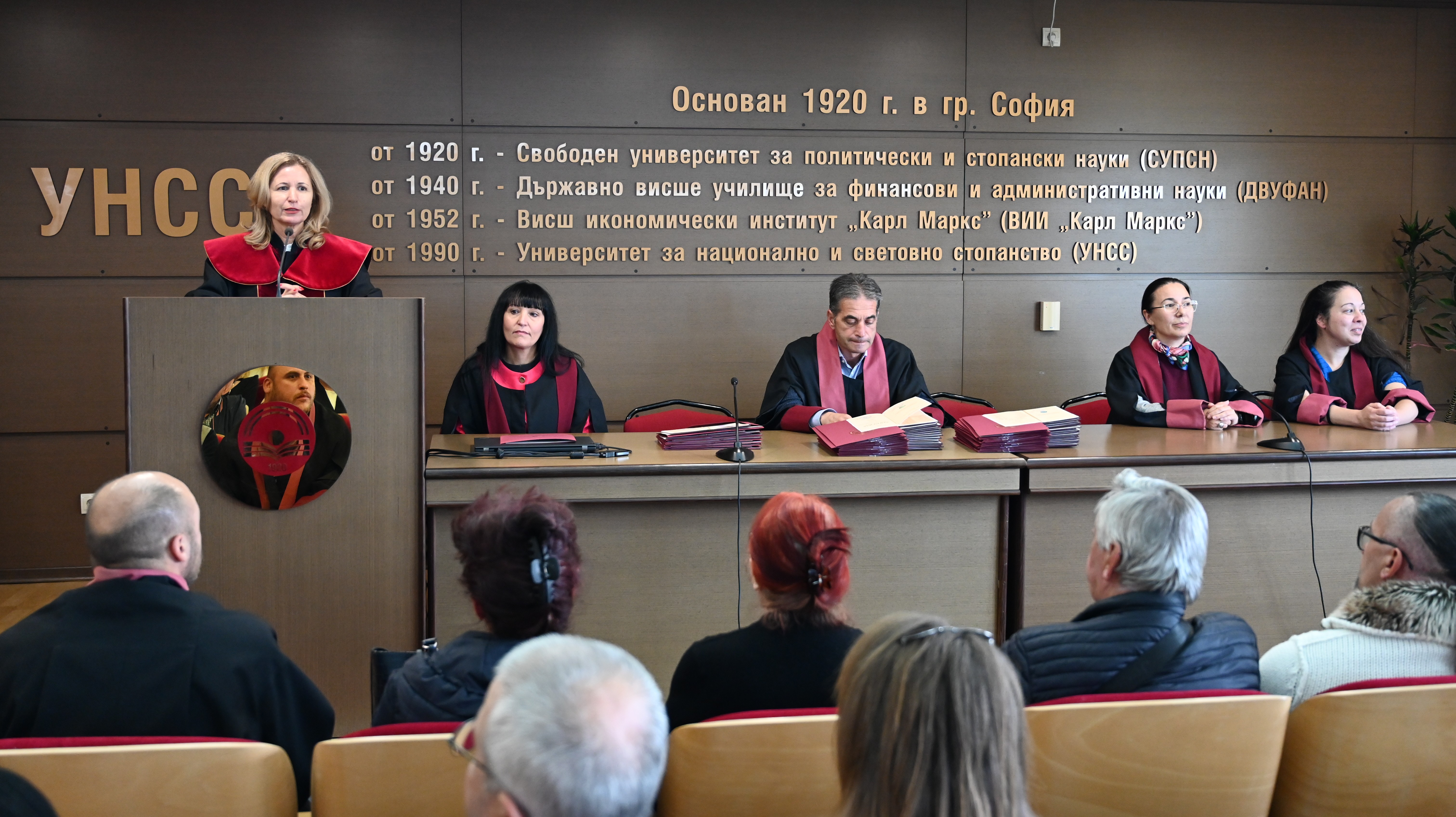 „За мен е изключително удоволствие в този тържествен ден, в който ще получите материализиране на всички усилия, които сте влагали по време на вашето обучение, да ви поздравя от името на ректора проф. д-р Димитър Димитров“, посочи проф. д-р Цветана Стоянова, зам.-ректор по институционално и бизнес сътрудничество и студентски политики. „Вие завършвате специалности в катедра с над 100 години история, в която умело се съчетават както традициите, така и иновациите, които съм сигурна, че след това ще позволят на всички вас да се реализирате успешно на пазара на труда, както и на високи управленски позиции в специализираните сектори.“ Проф. Стоянова призова абсолвентите да помнят, че са завършили УНСС и да се завръщат с утвърдени професионални позиции по различни поводи: „Сигурна съм, че ще прославяте Университета, където и да отидете“. Тя поздрави и преподавателите, които съчетават практически опит, от една страна, а от друга – са добри изследователи и учени, което им помага да предадат знания на младите, които идват след тях. Тя обърна внимание на завършилите да осъзнават ролята, която имат, защото завършват специалности, в които трябва да се съчетава желанието за икономически растеж с опазването на околната среда. „Помнете, че „Духът прави силата“, а вашата алма-матер и ние винаги ще бъдем зад вас.“