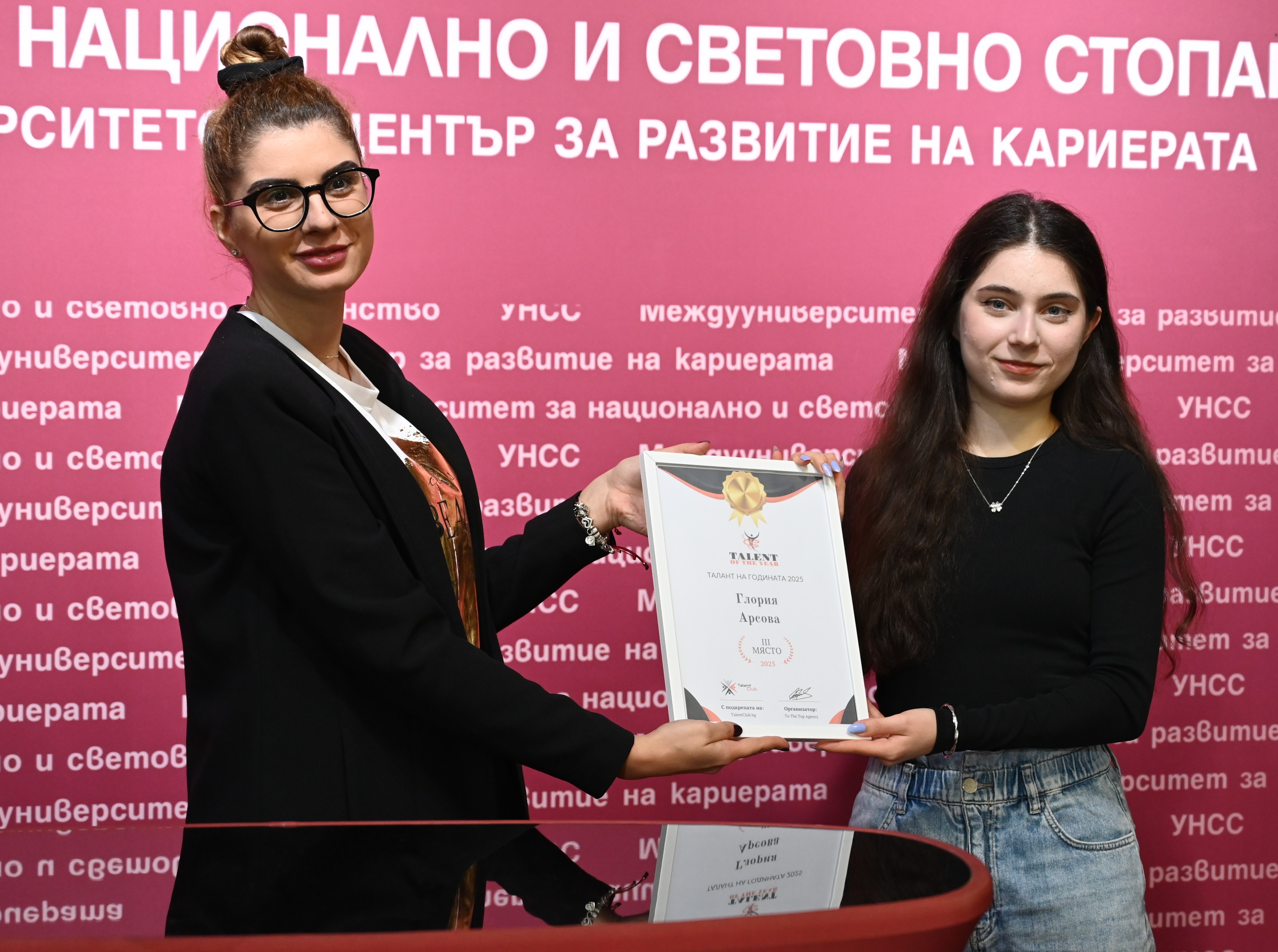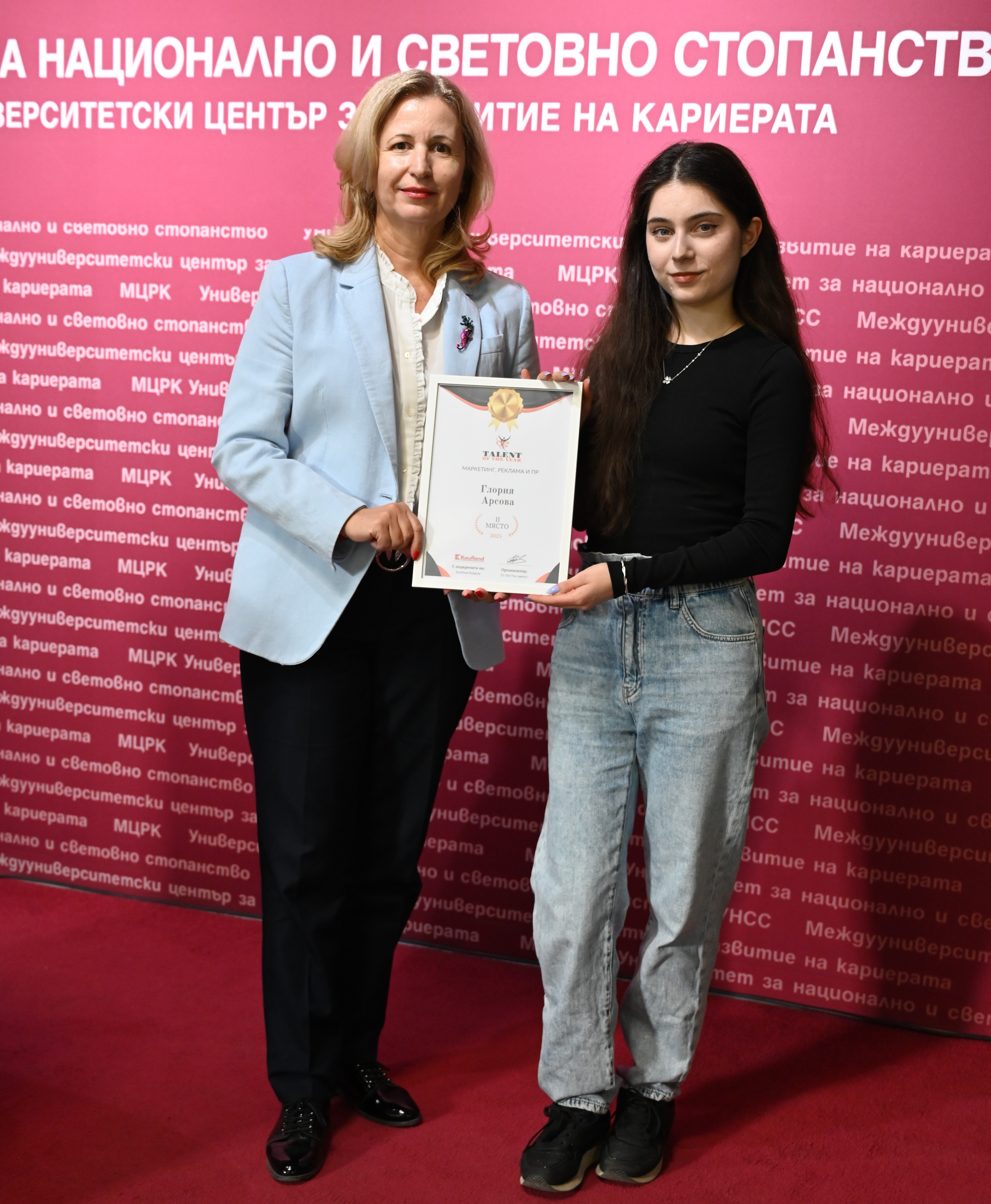 Големите победители в конкурса „Талант на годината 2025“, с подкрепата на TalentClub.bg, са: на първо място – Александрина Механджийска от Американския университет в България и SoftUni, Жак Милчев Семизов – второ място в категория „Счетоводство и финанси“; и Глория Арсова – трето място в категория „Маркетинг, реклама и PR“.