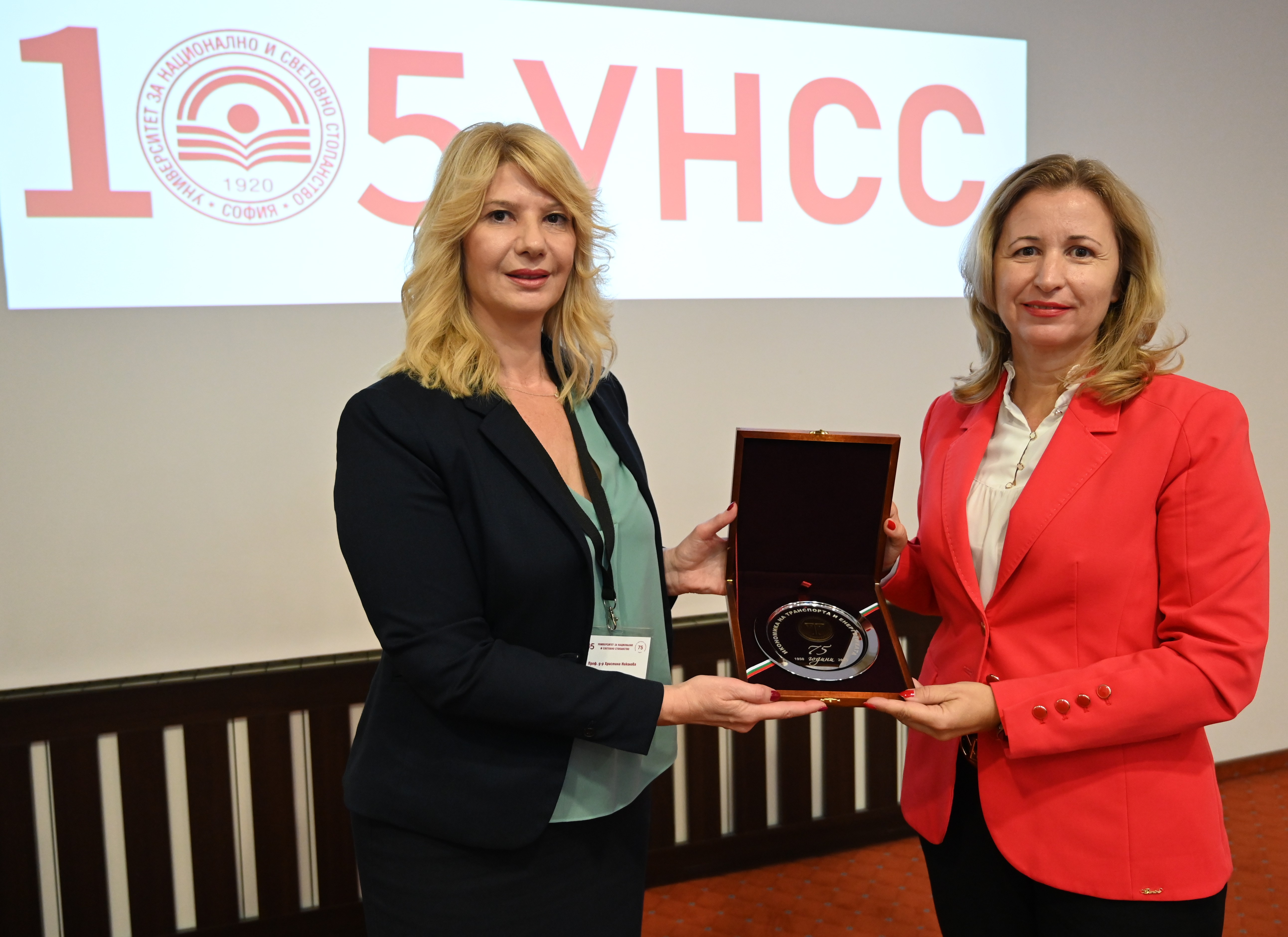 Проф. д-р Христина Николова, ръководител на катедра „Икономика на транспорта и енергетиката“, връчи плакет на проф. Цветана Стоянова за подкрепата, която са получавали и продължават да получават.