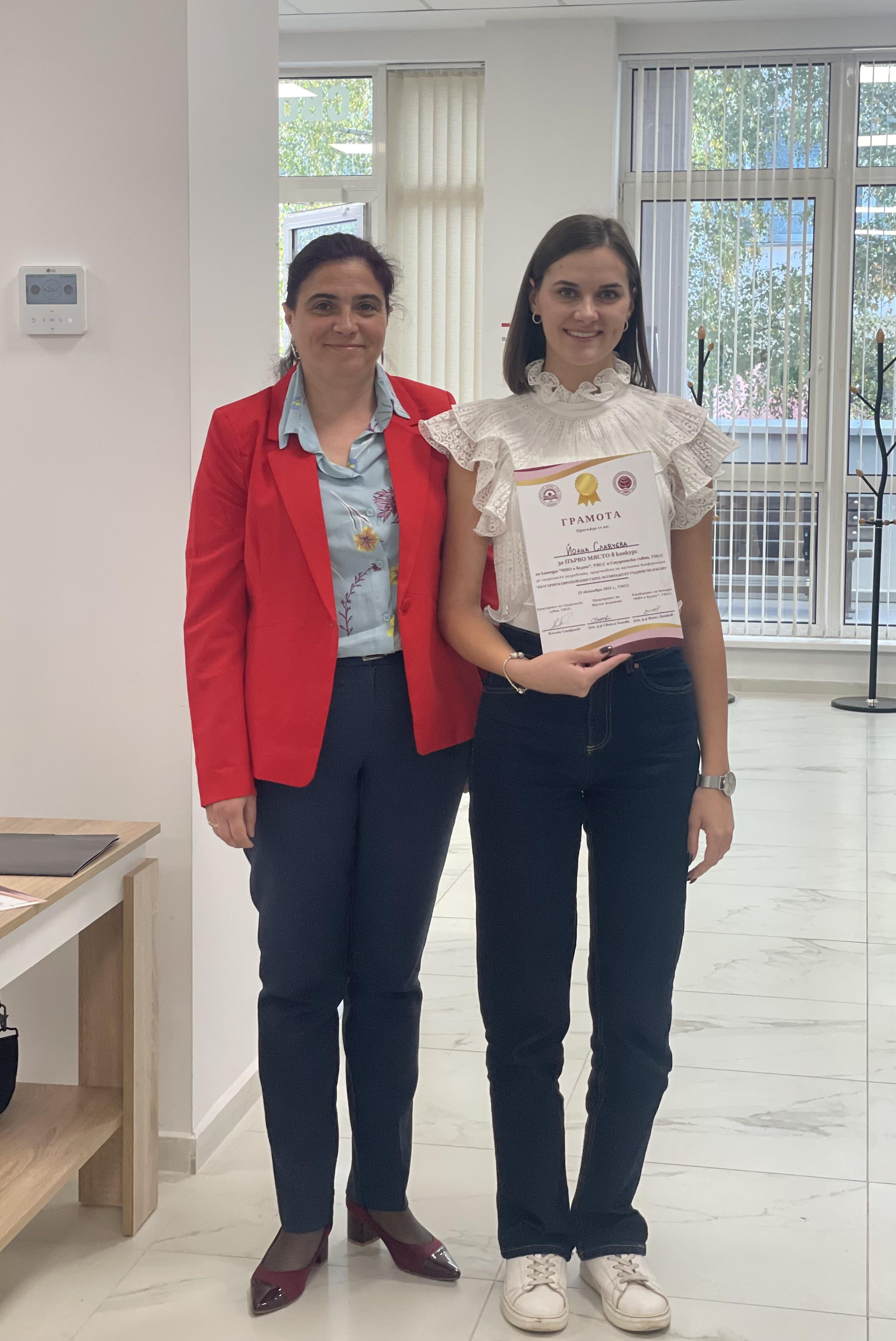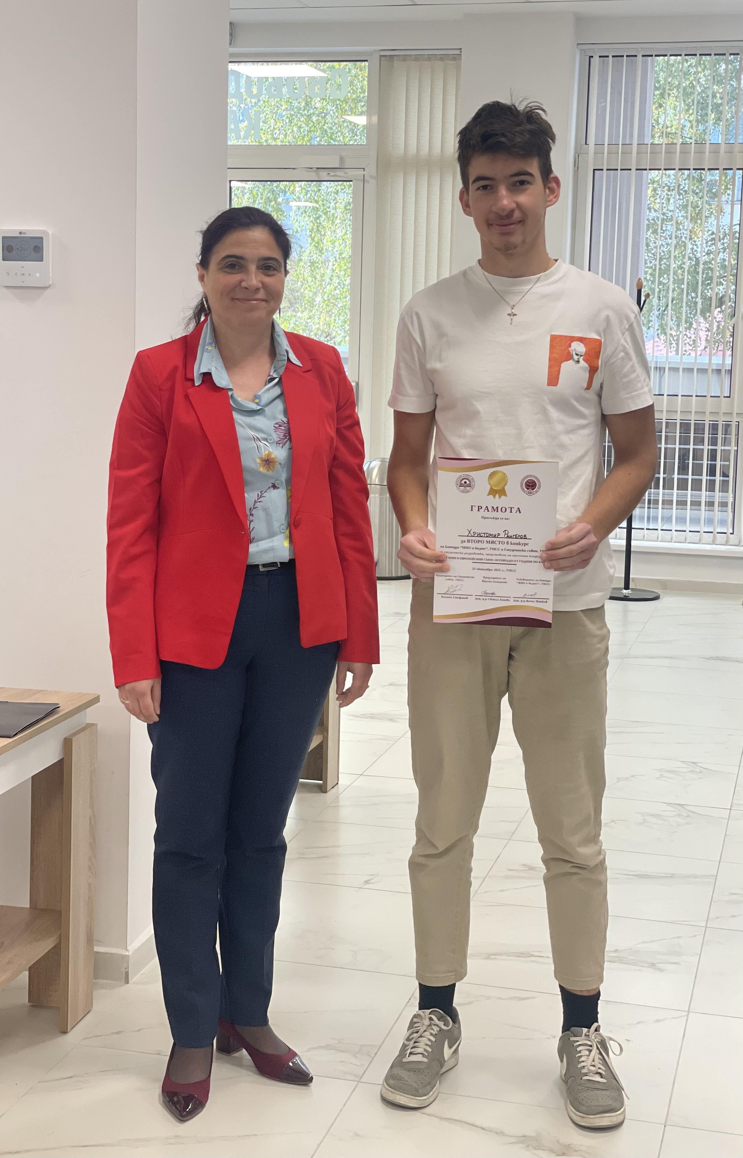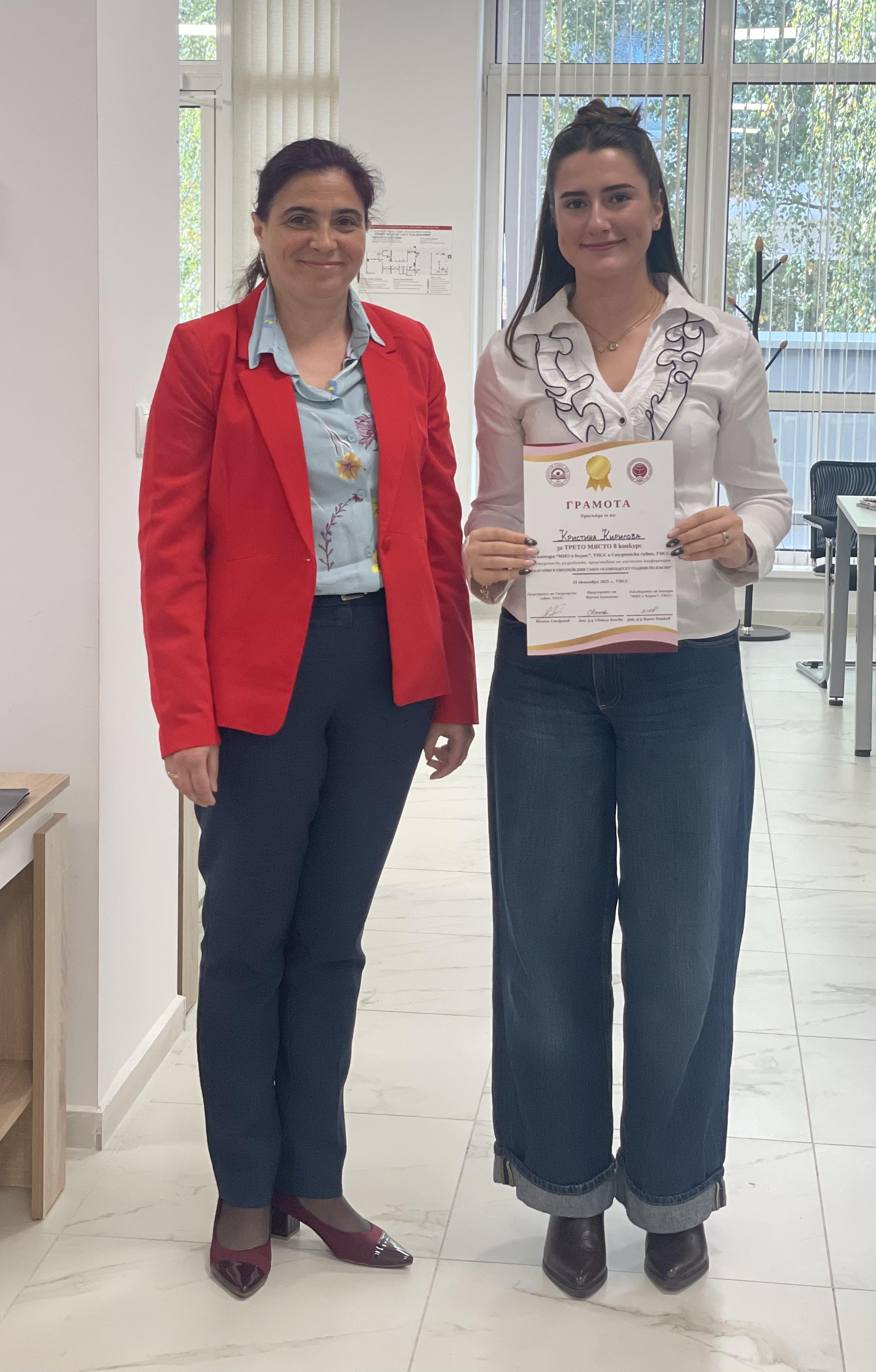 В рамките на XXIV научна конференция на катедра „МИО и бизнес“ на тема „Членството на България в Европейския съюз: Осемнадесет години по-късно“, под патронажа на ректора на УНСС проф. д-р Димитър Димитров, се проведе студентско състезание на тема „Бъдещето на ЕС: геополитически промени в ерата на изкуствения интелект“.