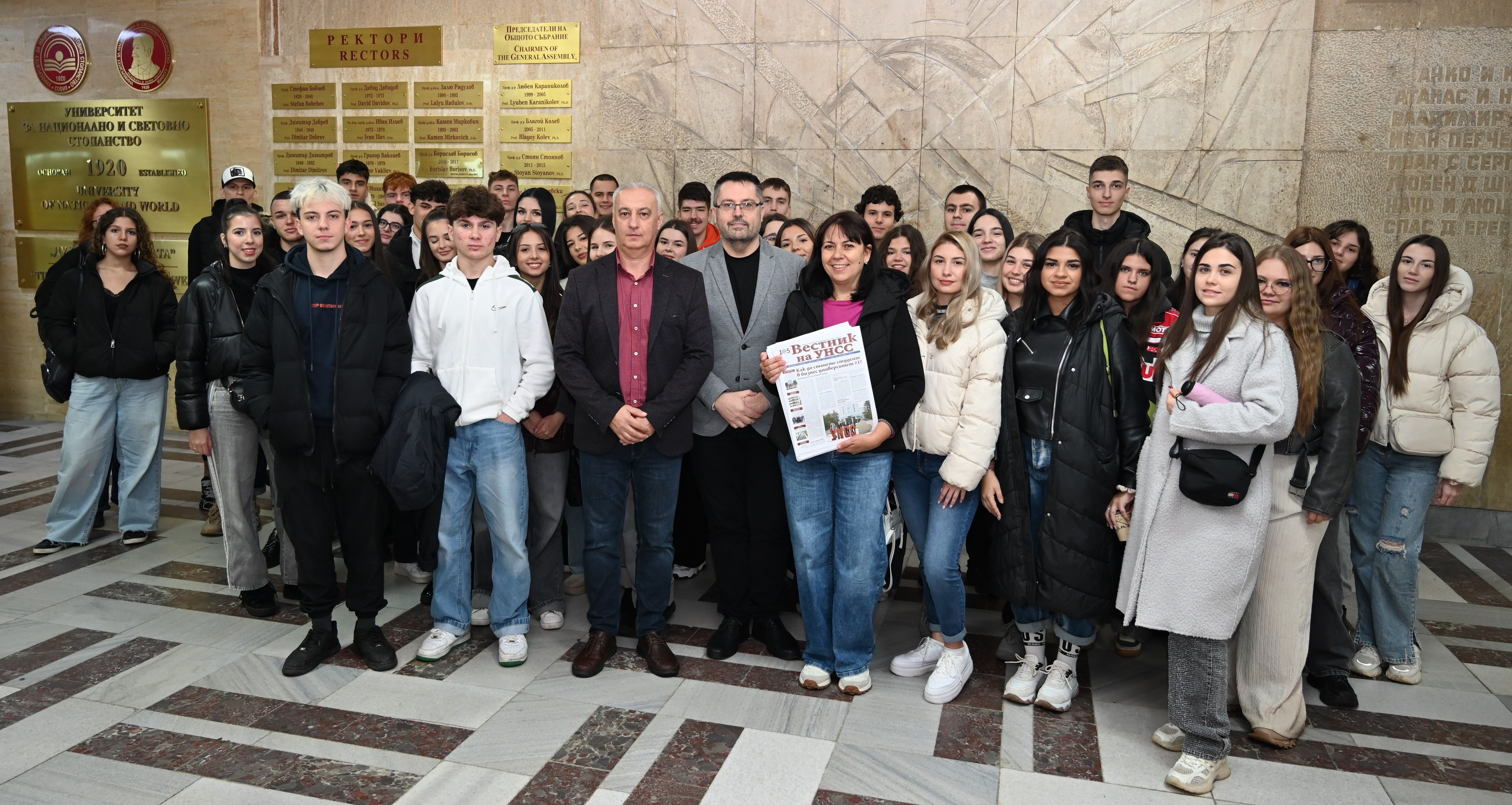 Ученици от 11. клас на Профилираната езикова гимназия „Йоан Екзарх“ – Враца, водени от г-н Бисер Благоев – преподавател по география и икономика, посетиха Университета за национално и световно стопанство. Посещението беше част от изнесено обучение по предмета „География и икономика“, организирано на базата на меморандум за сътрудничество между двете институции.