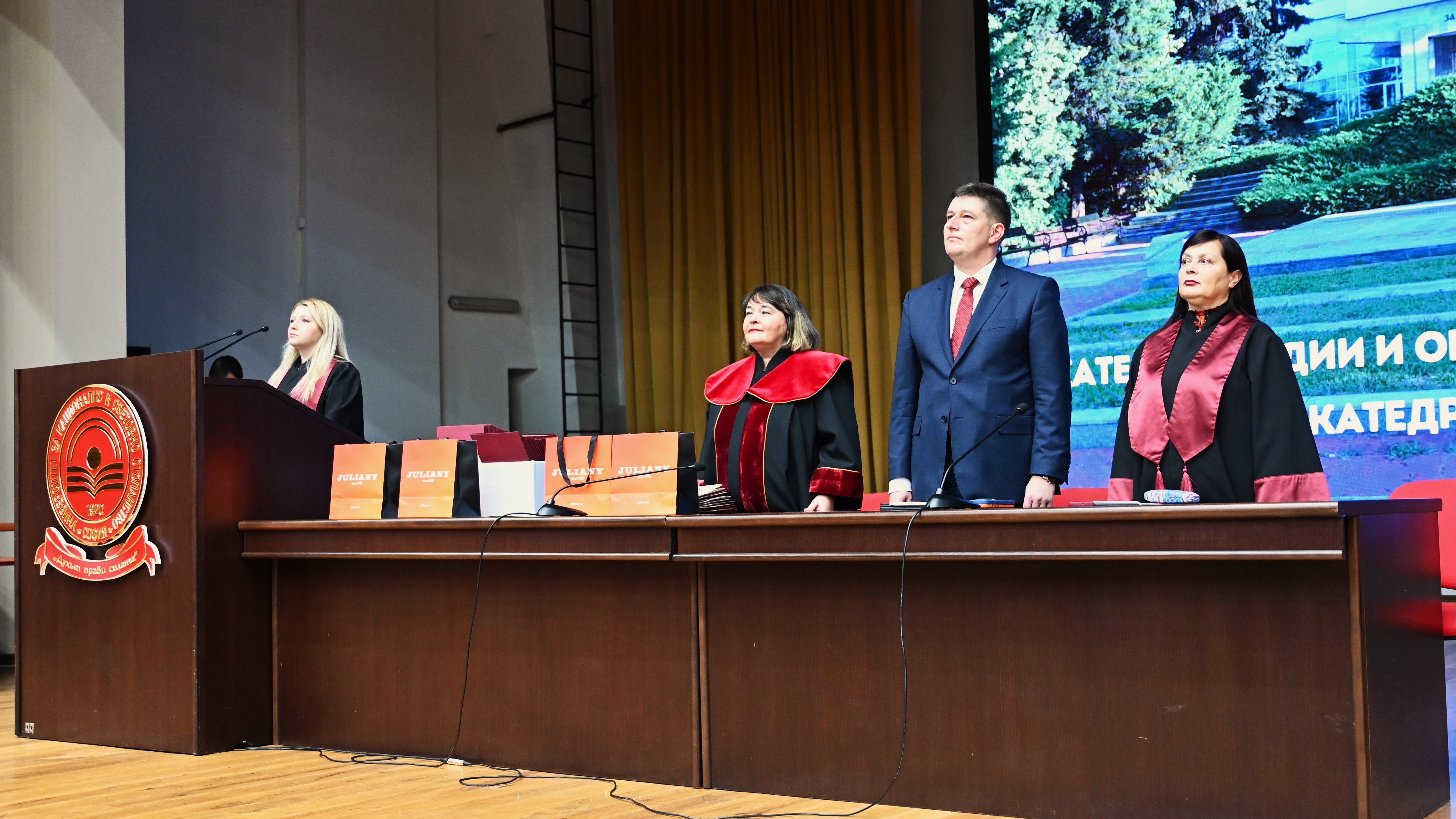 „За мен е изключително удоволствие и голяма чест да застана днес пред вас и от името на ректора на нашия университет, проф. д-р Димитър Димитров, както и от свое име, да ви поздравя за този важен успех. Скъпи випускници за 2025 година, бъдете себе си и следвайте истината. За мен вашите специалности се свързват преди всичко с три качества: отговорност, креативност и критично мислене“, отправи своите поздравления и пожелания към абсолвентите проф. д-р Матилда Александрова, зам.-ректор по учебната дейност.