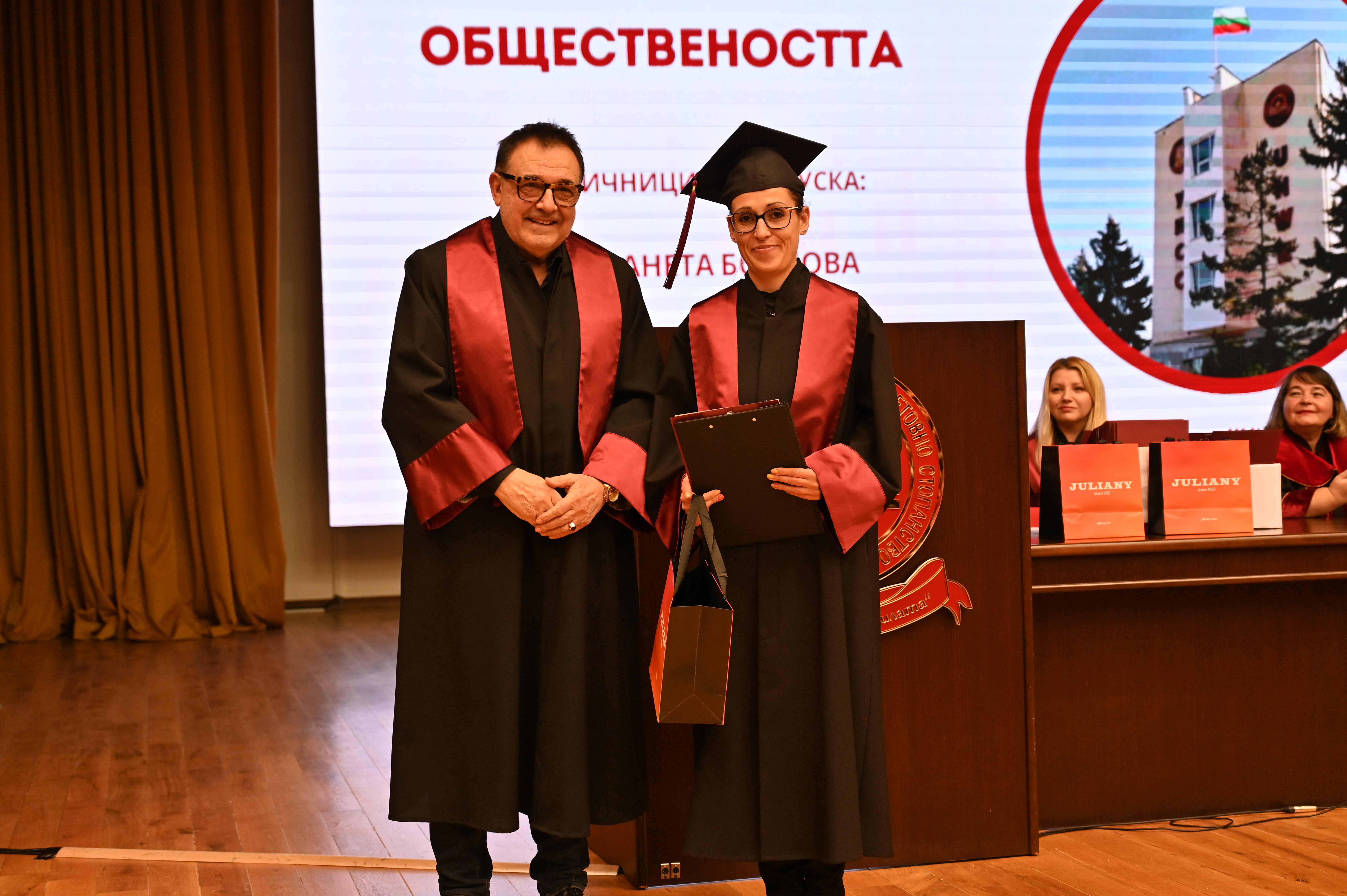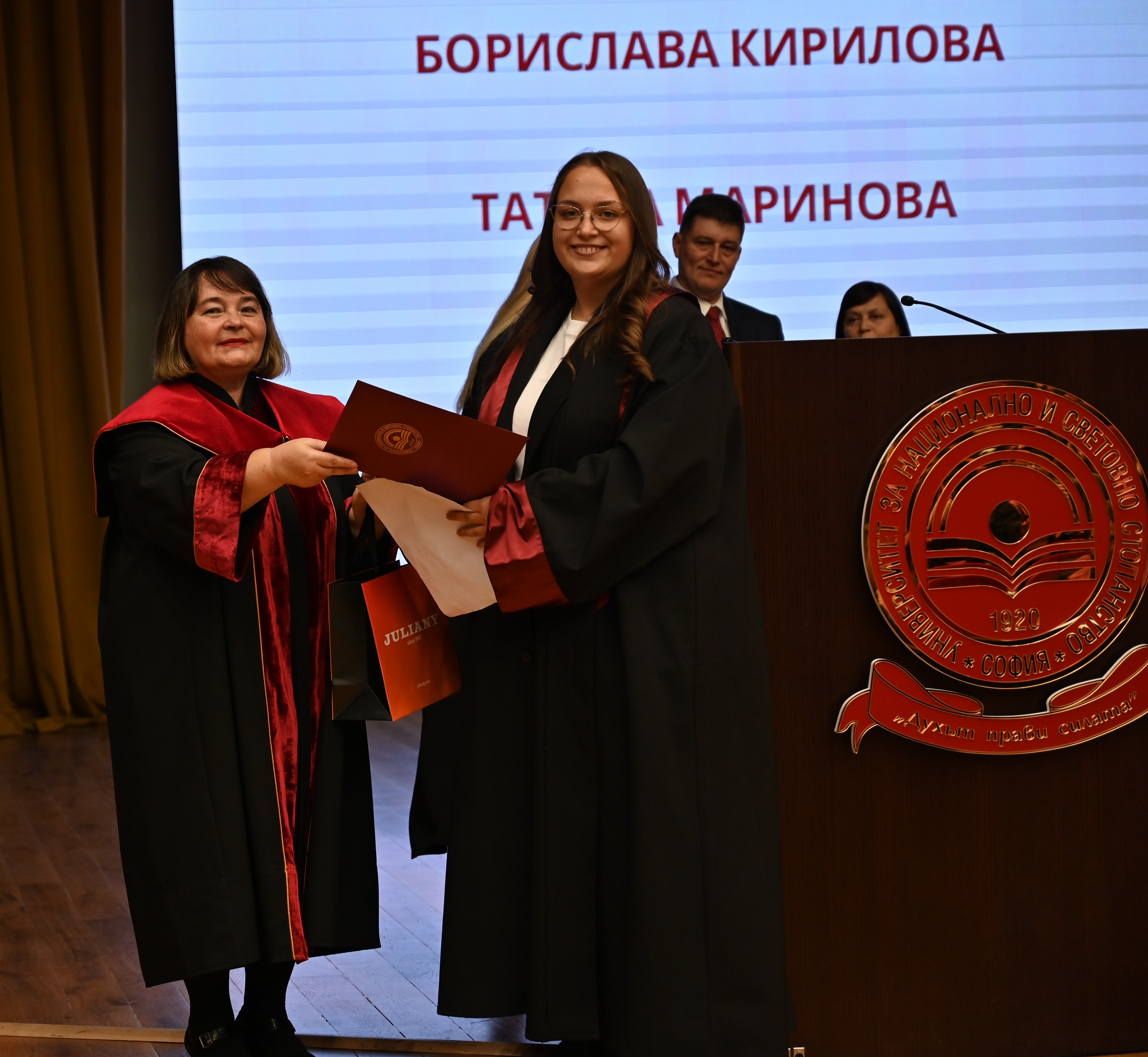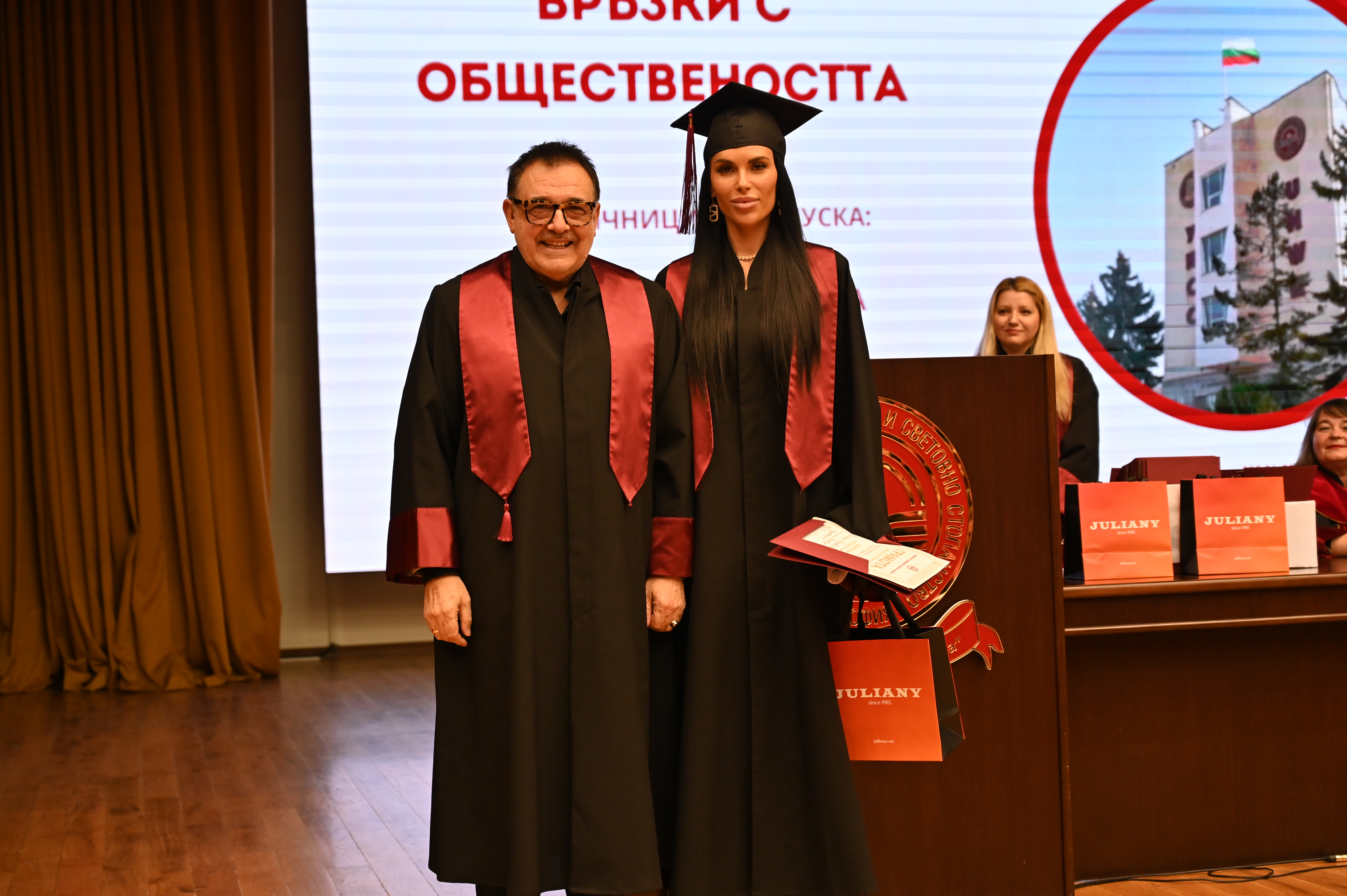 „Благодарение на вас стоя тук днес на тази сцена и ви показвам дипломата си. Знам, че се гордеете с мен, но още повече аз се гордея с вас – както всеки студент се гордее със своите родители, така и обратно. Искам да пожелая на всички мои колеги успех в бъдещето и най-вече – обичайте това, което правите“, каза Татяна Маринова, отличник в специалност „Медии и журналистика“ (на снимката долу вляво).