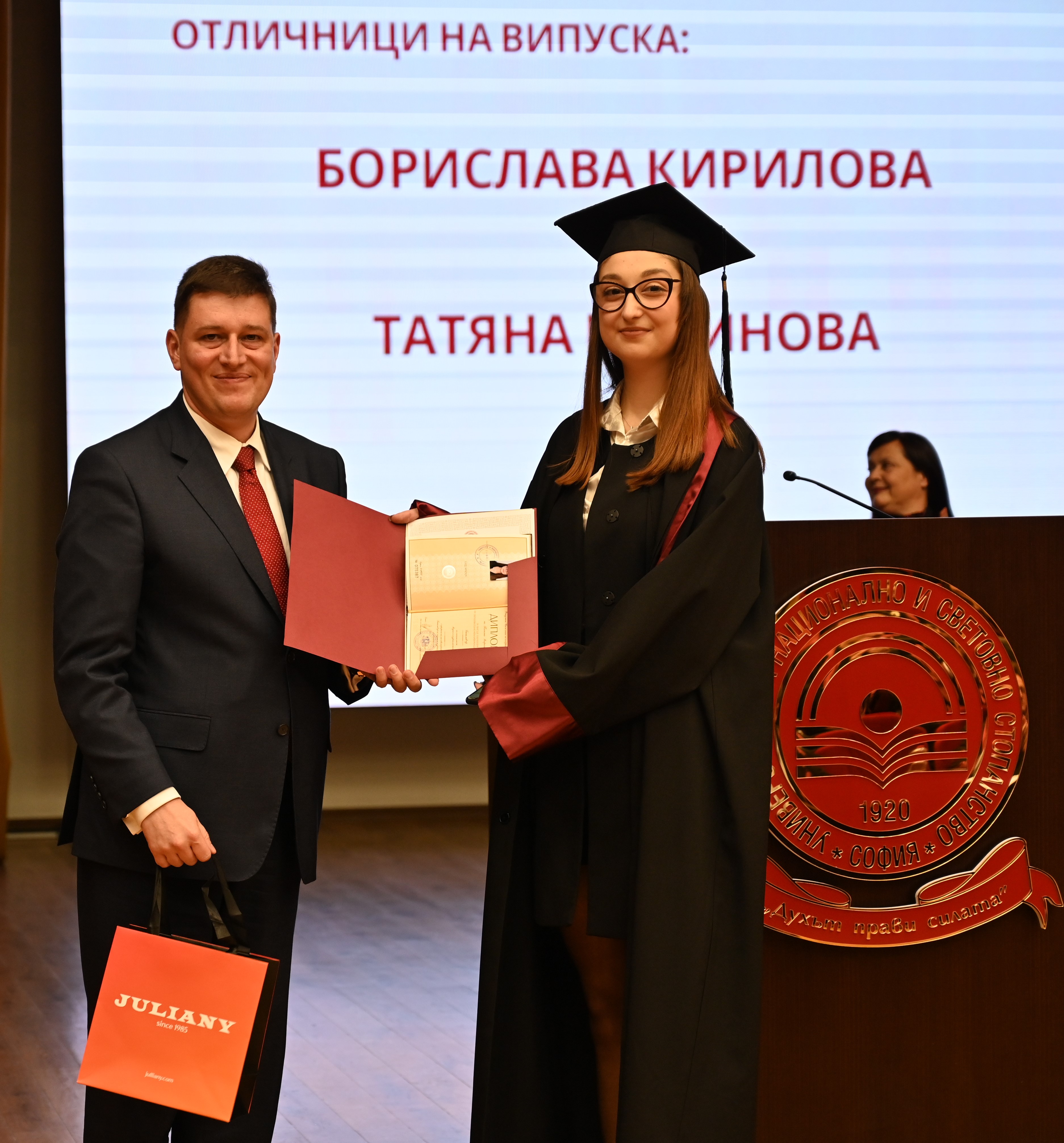 „Победите, които постигнахме, ни направиха по-силни, по-смели и по-добри. Днес стоя на сцената и говоря от името на целия випуск, но знам, че всеки един от нас заслужава този момент. Надявам се, че в думите ми ще откриете нещо, което сами бихте искали да кажете! Благодаря Ви!“, Борислава Кирилова, отличник в специалност „Медии и журналистика“ (на снимката долу вдясно).