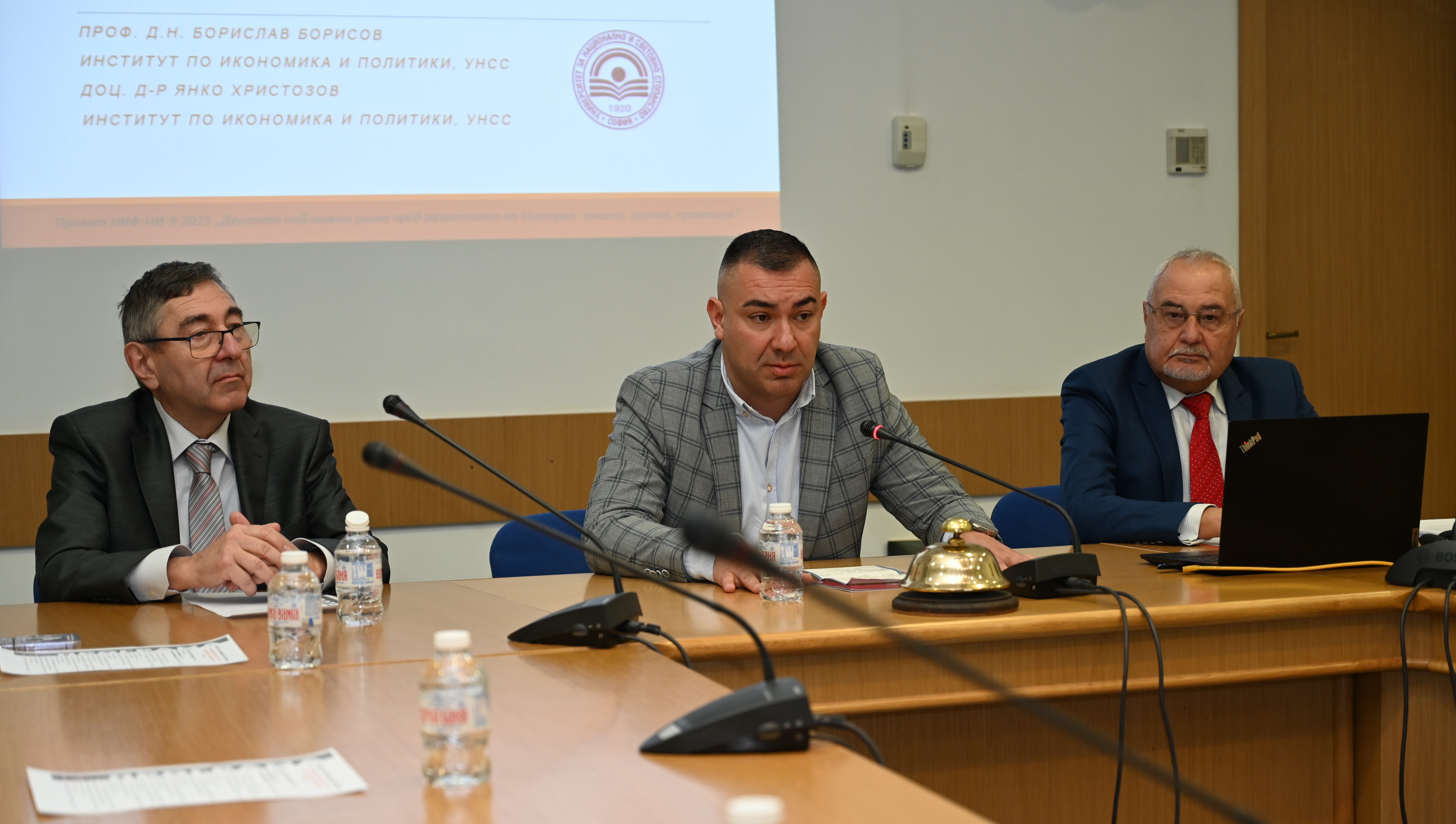 Зам.-ректорът по международна дейност и директор на Института по икономика и политики доц. д-р Янко Христозов разказа накратко за дейността на института и за ключовите му приноси към научноизследователската дейност на УНСС: „Работим в няколко основни направления, за да допринасяме за научноизследователската дейност на университета. Първото е създаването на научни публикации, индексирани в световноизвестни бази данни, като Scopus и Web of Science. В момента Институтът разполага с шест изследователи, повечето от които са утвърдени учени с високи научни показатели. Институтът разработва и различни видове икономически анализи. Сред по-значимите ни проекти са анализът за Министерството на туризма, който подпомогна стратегическото планиране в сектора, както и финансово-икономическият анализ за Българския енергиен холдинг, свързан с добива на нефт и газ в Черно море“ и допълни: „Днес сме се събрали, за да обсъдим една особено важна тема – десетте най-значими риска пред развитието на България през следващото десетилетие. Сред тях, на първо място, е демографският проблем, който изисква спешни мерки и дългосрочна политика. Като финансист смятам, че друго сериозно предизвикателство ще бъде фискалната политика на страната. При сегашните тенденции съществува риск България да навлезе в дългова спирала, което трябва да бъде избегнато. Темите са много, но се надявам нашата работа да помогне за по-доброто разбиране и решаване на икономическите и социалните предизвикателства пред страната“.