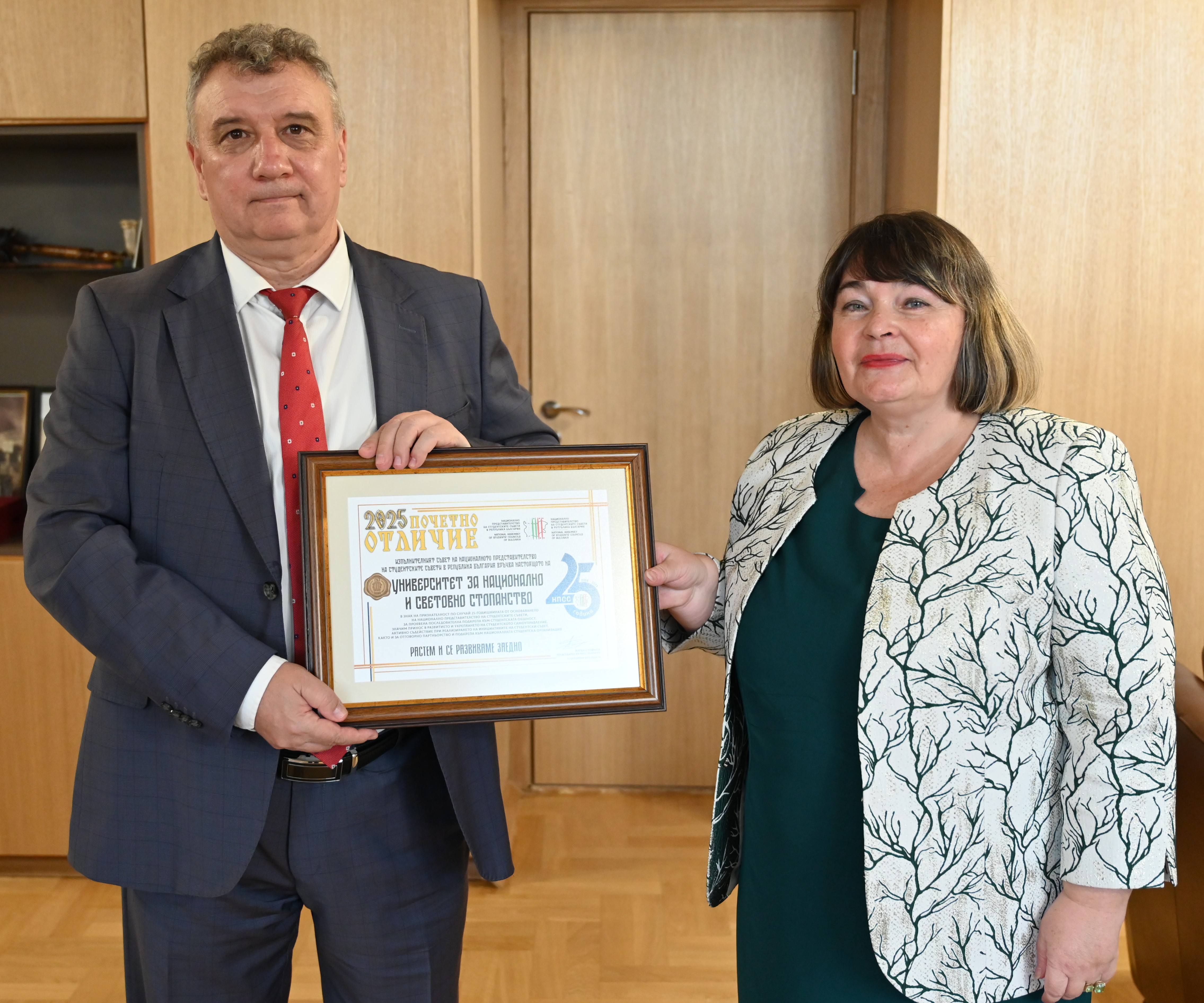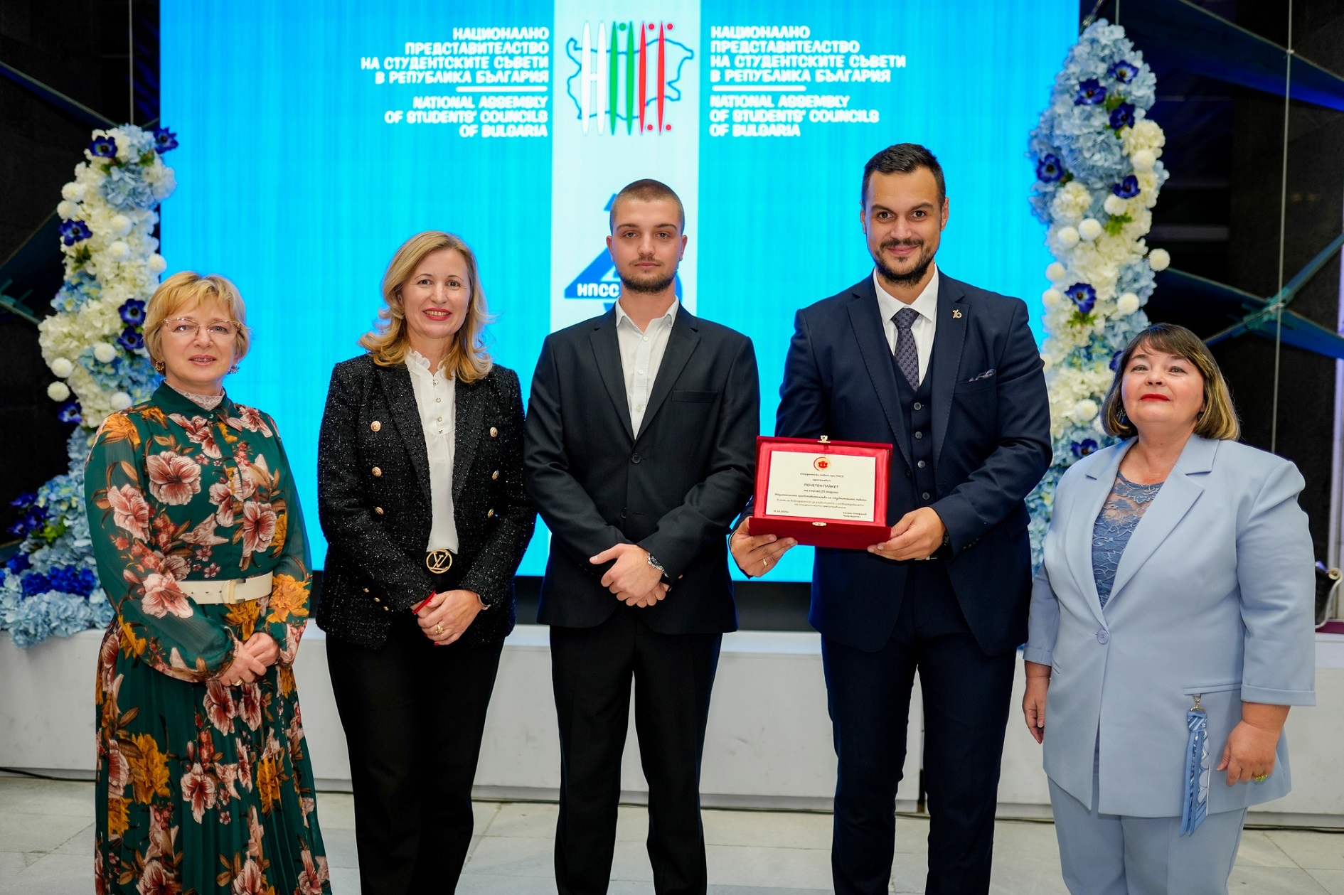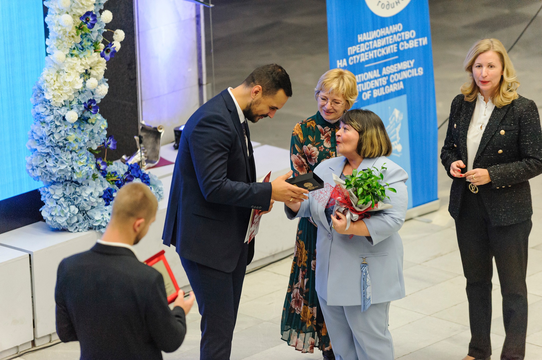 От името на Изпълнителния съвет на НПСС Ангел Стойков връчи почетно отличие на УНСС в знак на признателност за проявена последователна подкрепа към студентската общност, значим принос в развитието и укрепването на студентското самоуправление, активно съдействие при реализирането на инициативите на студентските съвет, както и за отговорно партньорство и подкрепа към Националната студентска организация. Почетното отличие от името на Университета получи проф. Матилда Александрова.