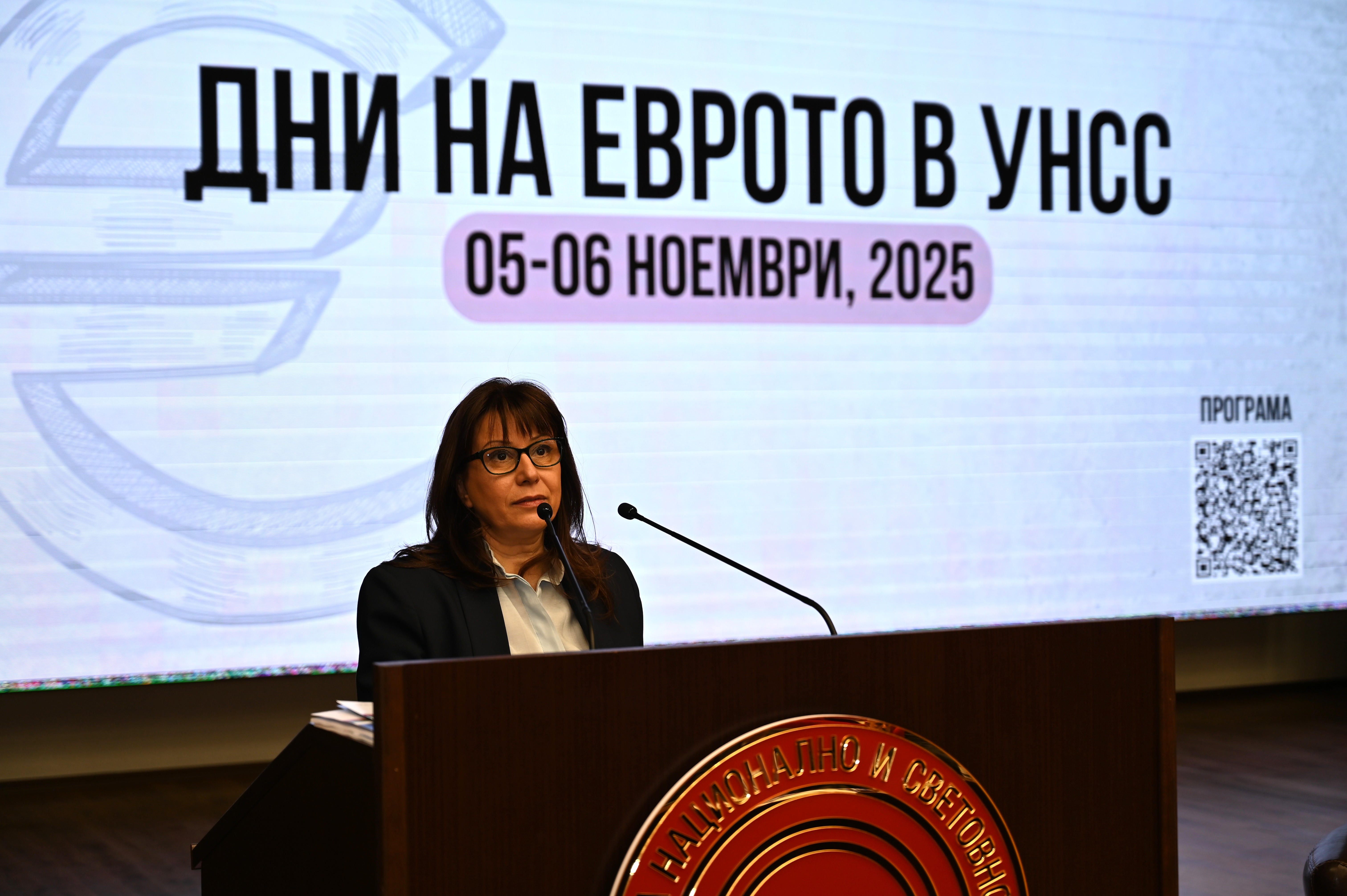 „УНСС е едно място, където се създават не само икономисти, но и мислещи граждани, подготвени да водят обществения разговор не само за еврото, но, сигурна съм, и за бъдещето на България“, подчерта Велислава Делчева, Омбудсман на Р България. „Дискусията за присъединяването ни към еврозоната е преди всичко дискусия за доверието в институциите, в решенията, които нашата държава взима, както и за доверие в самите нас като общество. Защото въвеждането на еврото не е само икономически акт, но и дълбока социална промяна. Тази промяна засяга всеки човек – от пенсионера, който следи цените, до младия предприемач, който мисли за инвестиции и развитие. Като омбудсман на Р България поставям човека в центъра на държавната политика и затова вярвам, че в този процес трябва да гарантираме, че гласът на хората ще бъде чут и решенията, които взима държавата и институциите, ще бъдат обяснени с прозрачност и уважение. Необходима е честна комуникация и ясни гаранции срещу злоупотребата и активна социална подкрепа за уязвимите групи. Само така ще запазим доверието, което е най-ценната валута в нашето общество. Убедена съм, че с общи усилия можем да превърнем този преход в икономическа реформа, а в социален договор за справедливост и стабилност. Пожелавам успех на студентите, които са бъдещи лидери и които ще продължат разговора за еврото и за бъдещето на България с нова енергия и знания. Нека това събитие да бъде пример как академичната общност, държавата и обществото могат да работят заедно в името на едно общо благо.“