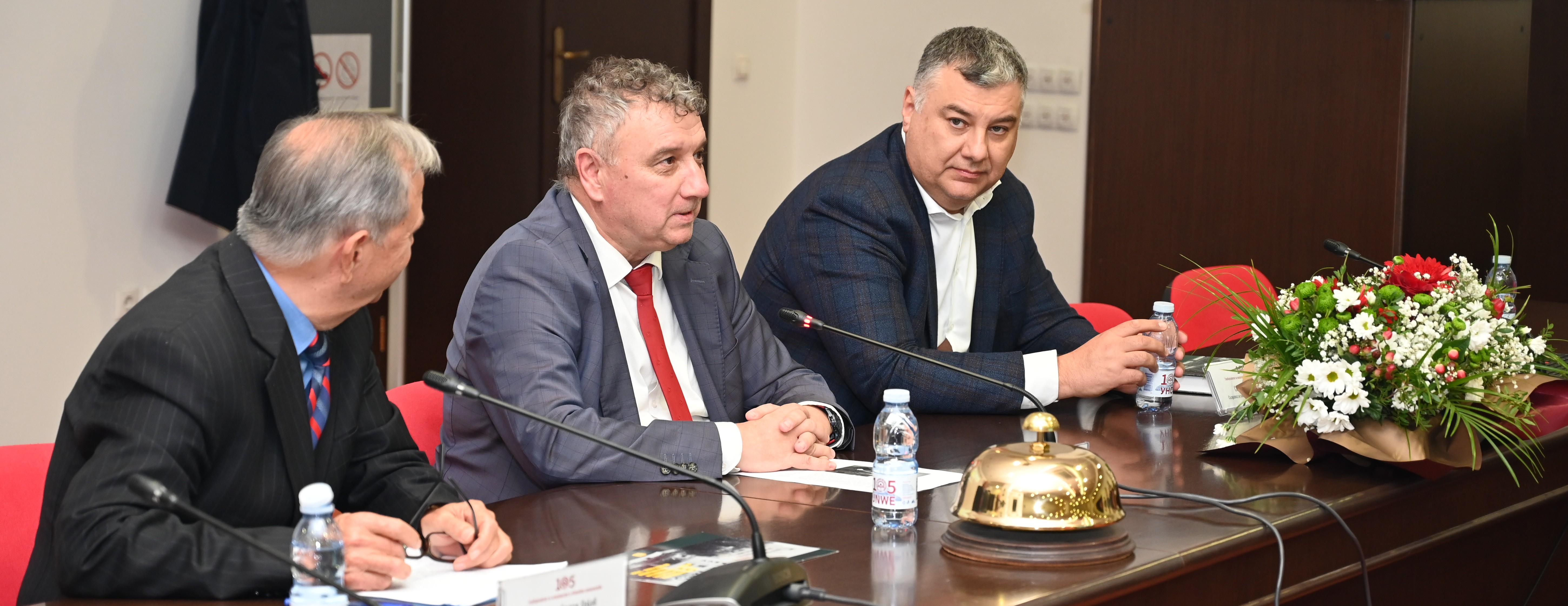 | Доц. д-р Елена Симеонова ръководител на катедра „Политология“, проф. д-р Георги Янков, ректорът проф. д-р Димитър Димитров, Светлин Николчев |