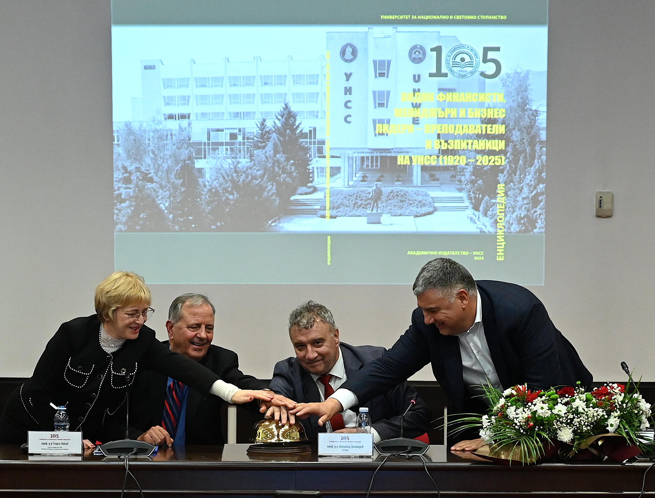 „С голямо удоволствие днес представяме едно издание, посветено на важни фигури в света на финансите, мениджмънта и бизнеса – преподаватели и възпитаници на нашия университет. Този изследователски труд, дело на екипа на Центъра за политологични изследвания на УНСС, воден от заслужилия проф. Георги Янков, излиза в чест на 105-годишнината от създаването на нашия университет“ отбеляза проф. Димитър Димитров и разказа как се е зародила идеята за тази втора енциклопедия, която се явява логично продължение на първата „Министър-председатели, министри и висши представители на законодателната власт – преподаватели и випускници на УНСС“. „Изданието е плод на усилията да се запази и предаде на бъдещите поколения историята на академичния и професионален успех на изтъкнати личности, оказали съществено влияние върху развитието на икономическата наука, бизнеса и обществото в България и по света“ допълни ректора и изказа специални благодари на Светлин Николчев, собственик и управител на „Ролпласт груп“, наш възпитаник, завършил специалност „Икономика и управление на индустрията“, но и един съвременен спомоществовател, с чиято помощ е отпечатана енциклопедията.