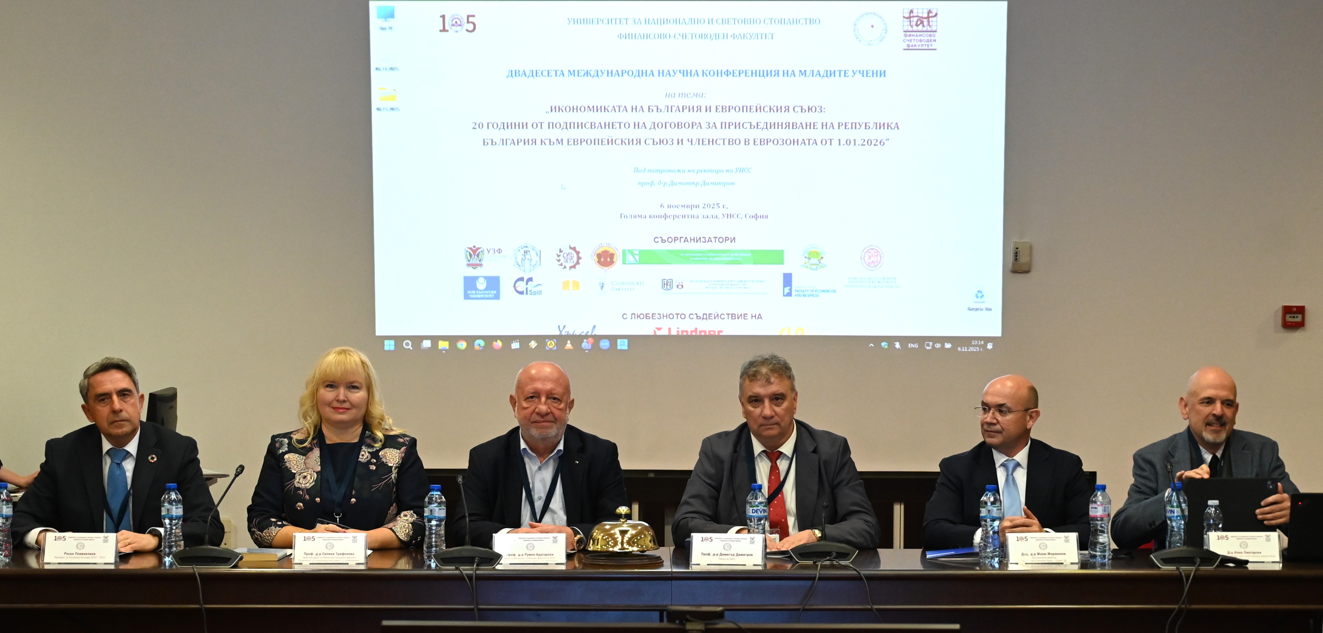 Двадесетата международната научна конференция на младите учени на тема „Икономиката на България и Европейския съюз: 20 години от подписването на договора за присъединяване на Република България към Европейския съюз и членство в еврозоната от 1.01.2026“ тържествено бе открита в УНСС. Тя се организира за 20 път от Финансово-счетоводния факултет под патронажа на ректора на университета проф. д-р Димитър Димитров.