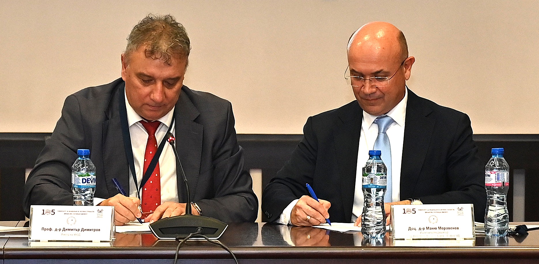 | Проф. Димитър Димитров и доц. Маню Моравенов при подписването на меморандума за сътрудничество |