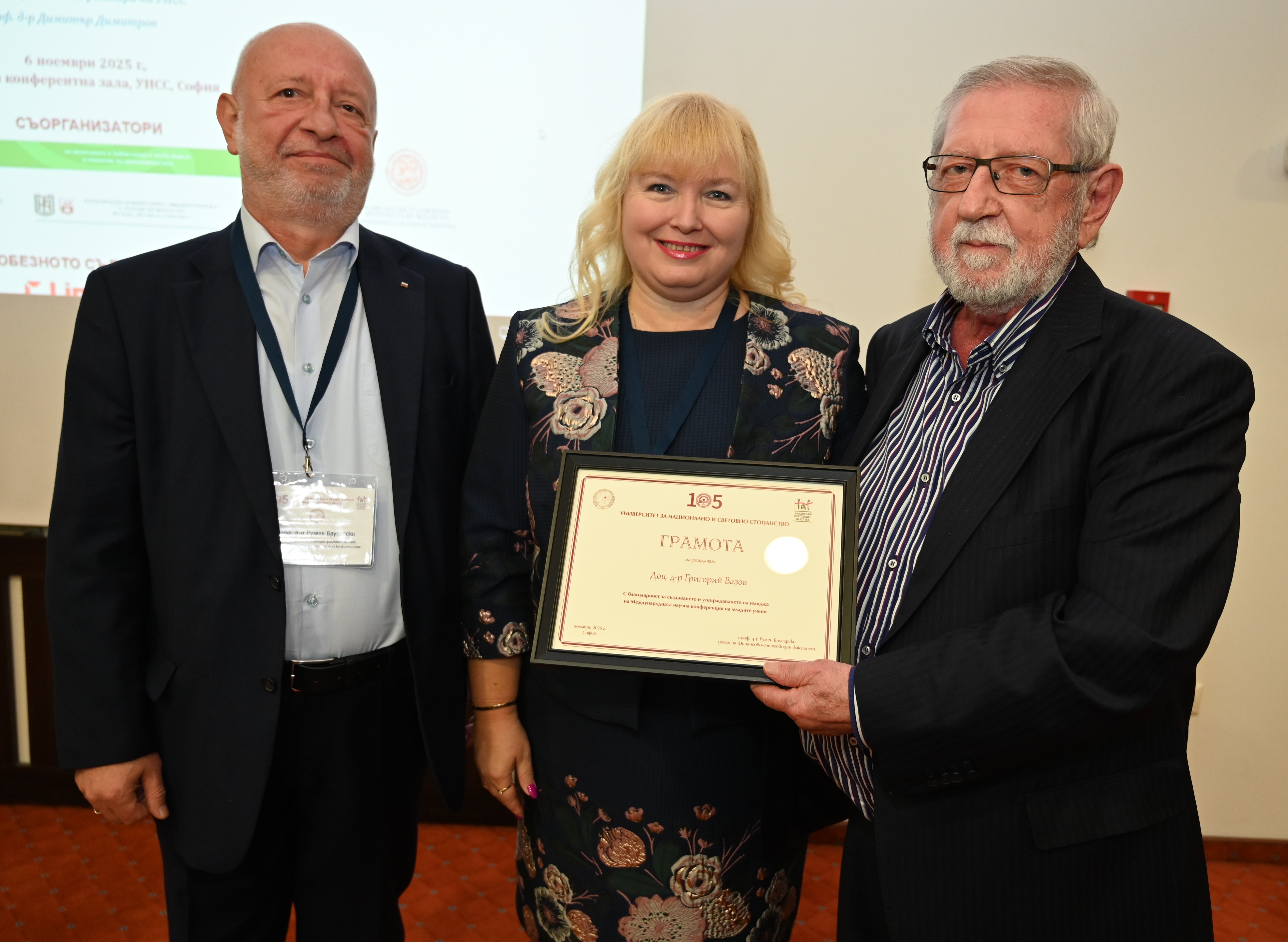 Деканът на Финансово-счетоводния факултет проф. д-р Румен Брусарски награди с почетни грамоти тримата декани на факултета в различни периоди. „С благодарност за създаването и утвърждаването на имиджа на международната научна конференция на младите учени награждаваме трима високоуважавани колеги, доайени на факултета, а именно доц. д-р Григорий Вазов, проф. д-р Стоян Стоянов и проф. д-р Огнян Симеонов.“