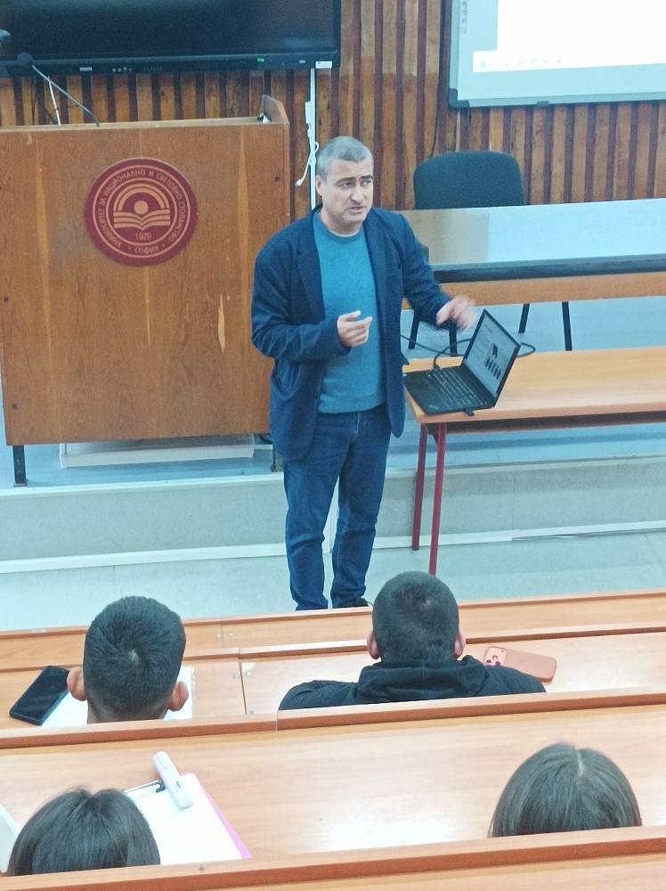 Студентите, обучаващи се в специалностите „Бизнес икономика“ и „Индустриален бизнес“, се срещнаха с д-р Даниел Пангев и имаха възможността да слушат негова лекция, в която той разгледа практичната страна на редица въпроси, които те вече теоретично изучават. Срещата с лектора бе в рамките на лекция по дисциплината „Бизнес мениджмънт“ с титуляр доц. д-р Кирил Димитров, катедра „Индустриален бизнес“.