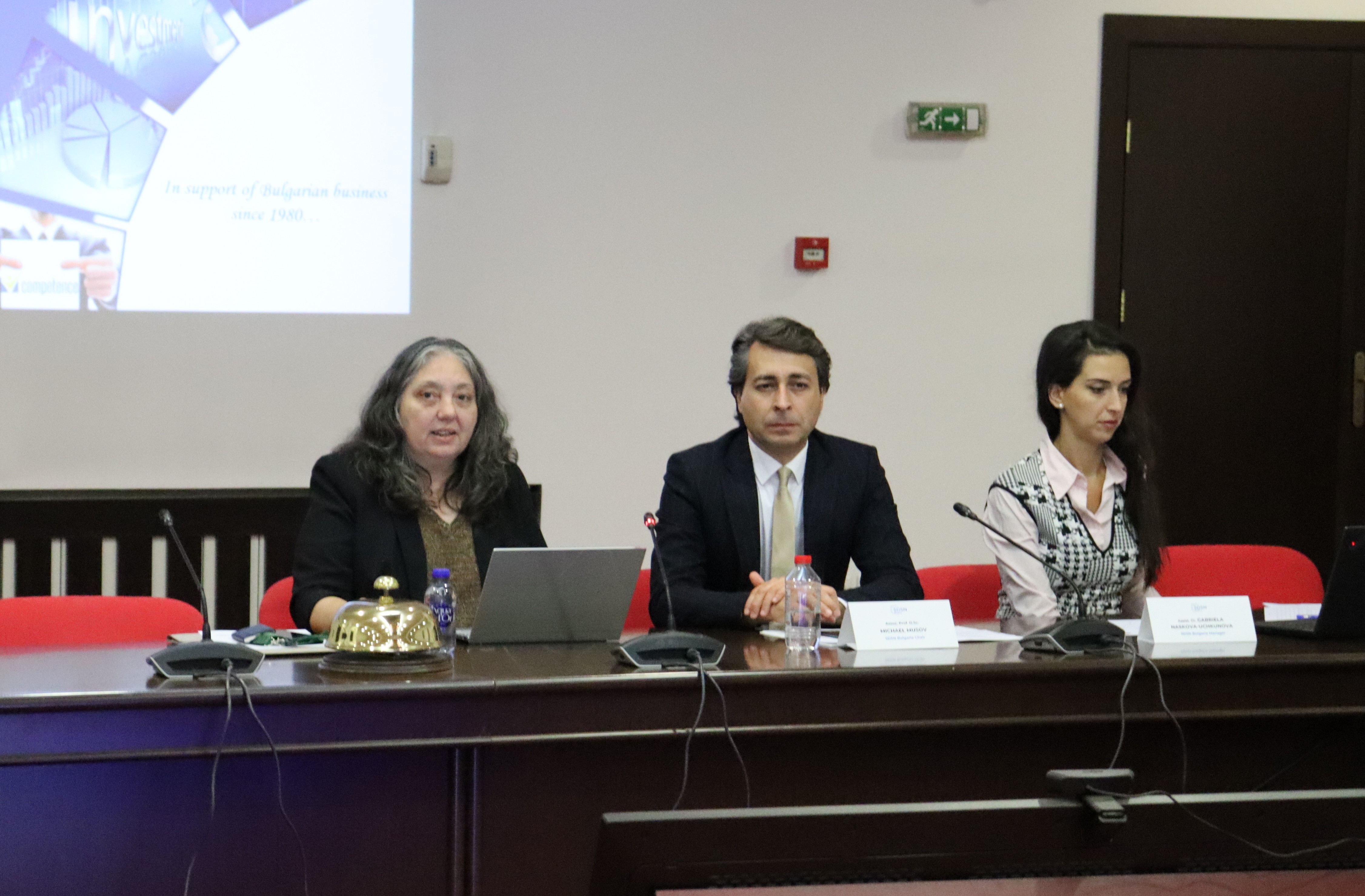 | Силвия Тодорова, директор на Център „Предприемачество“ към Българската стопанска камара, доц. д.н. Михаил Мусов и гл. ас. д-р Габриела Наскова (от ляво надясно) |