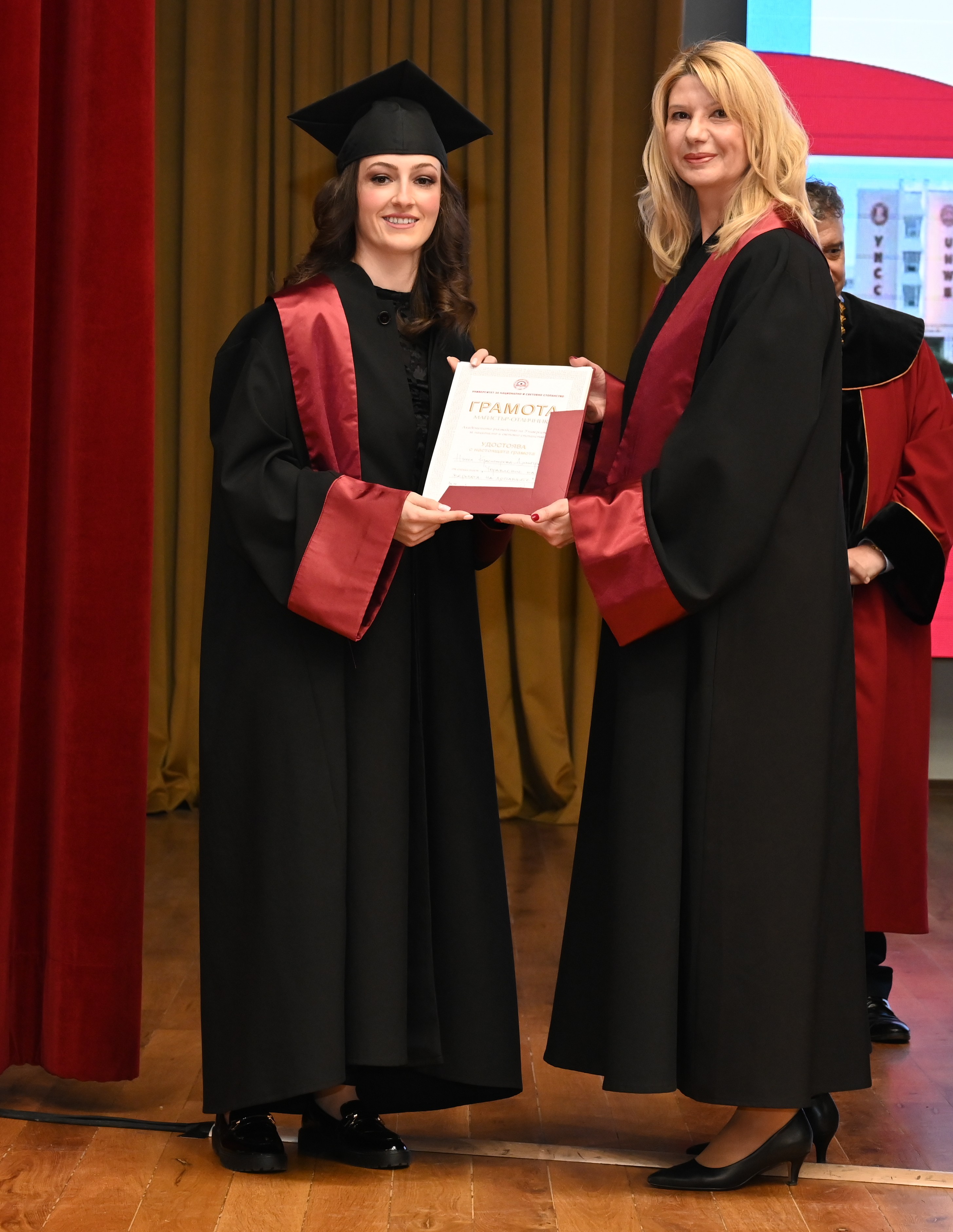 Проф. д-р Христина Никова, зам.-декан по научноизследователската дейност на факултет „Икономика на инфраструктурата“ се обърна към бакалаврите и магистрите с думите: „Позволете ми от името на декана на факултета доц. д-р Силвия Терезова и от името на цялото деканско ръководство да ви поздравя с успешното завършване и за постигнатия успех, и за упоритата работа през тези четири години – или една година, година и половина при магистрите. Зад вас стоят много усилия, предизвикателства и личен труд. Скъпи родители, бъдете горди – вашите деца направиха нещо голямо, за да осигурят бъдещото си развитие. Пожелавам ви да следвате сърцето си, да знаете какво искате и уверено да вървите по своя професионален път като дипломирани бакалаври и магистри на нашия университет“.