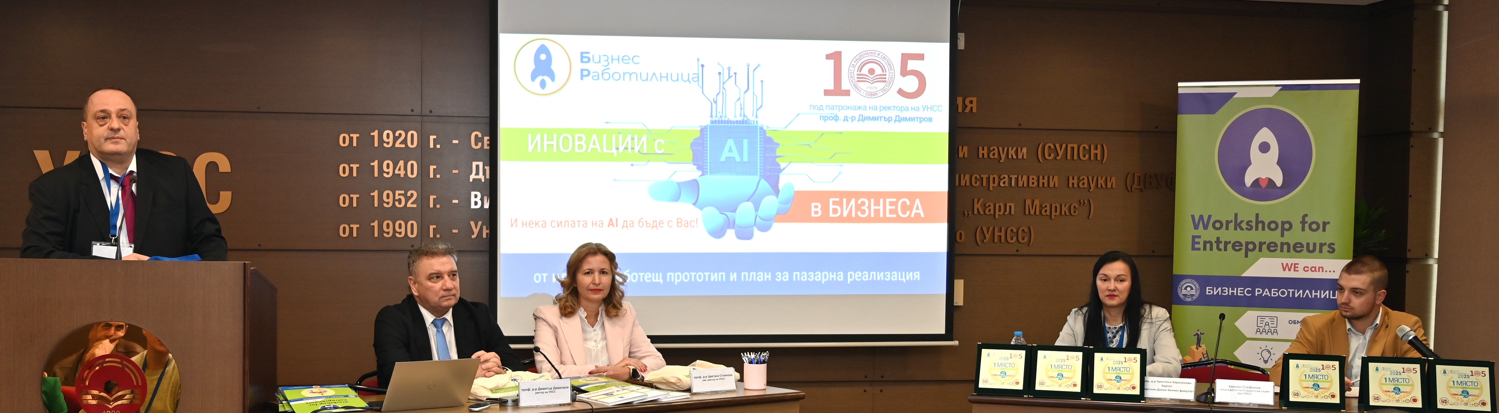 При огромен студентски интерес за трета поредна година Бизнес факултетът и Студентският съвет при УНСС проведоха практико-приложната Бизнес работилница / Workshop for Entrepreneurs 2025, като темата тази година беше „Иновации с AI в бизнеса“. Работилницата е под патронажа на ректора проф. д-р Димитър Димитров и обединява изследователи, студенти, професионалисти и предприемачи за обмен на знания, умения, идеи и иновации. Събитието е разделено на теоретична и практическа част. Гост-лектори от бизнеса изнесоха своите виждания по темата.