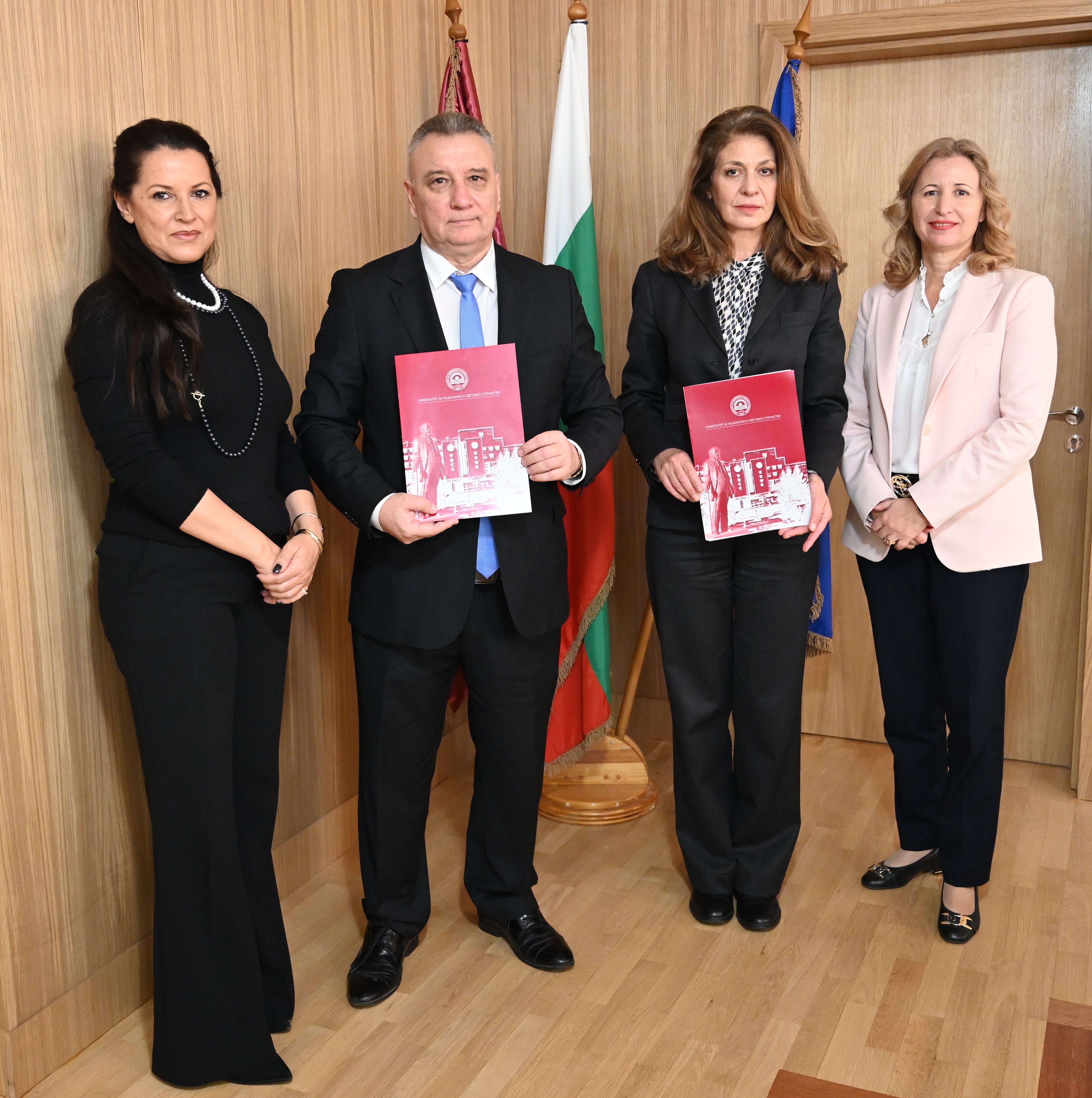 Доц. д-р Наталия Футекова, ректорът на УНСС проф. д-р Димитър Димитров, Ирина Радоева и проф. д-р Цветана Стоянова, зам.-ректор по институционално и бизнес сътрудничество и студентски политики |