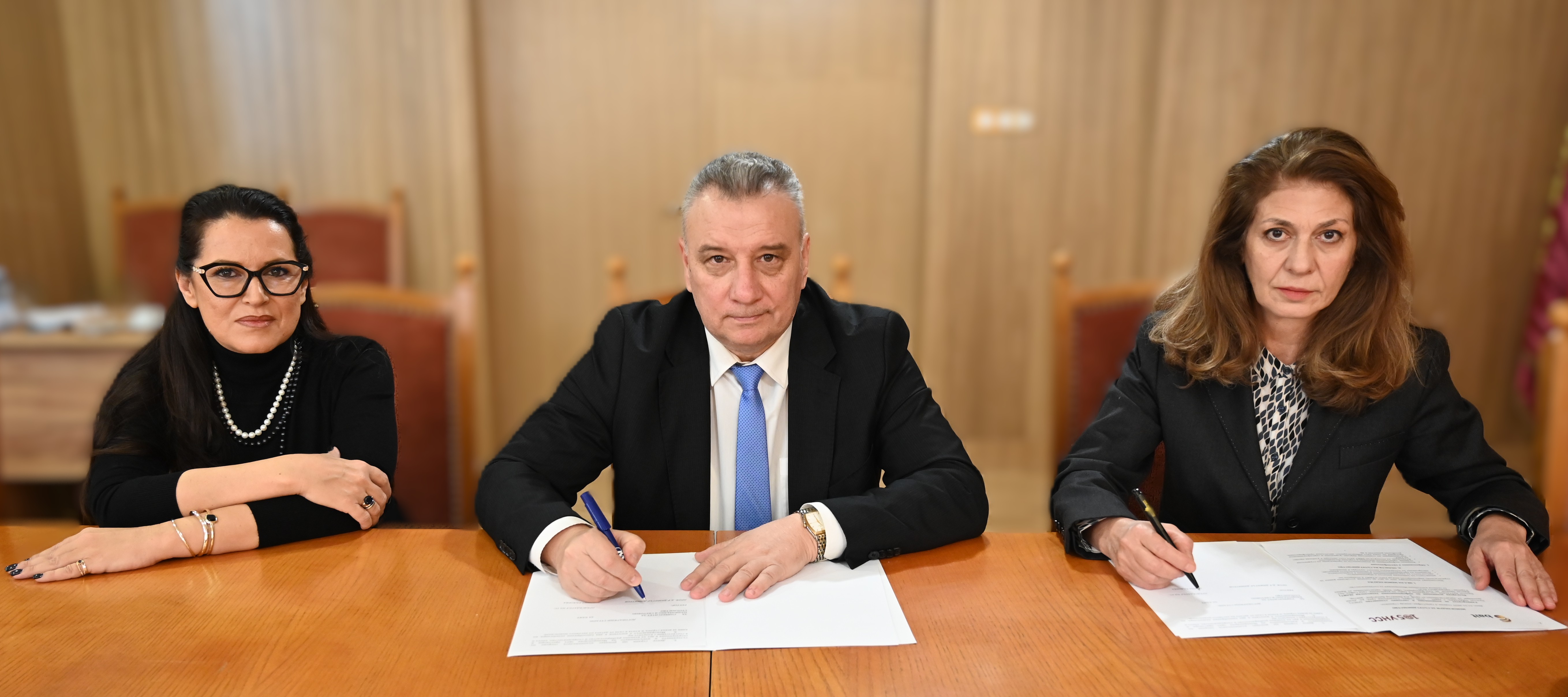 Доц. д-р Наталия Футекова, зам.-председател и член на Управителния съвет на БАИТ, ректорът на УНСС проф. д-р Димитър Димитров, Ирина Радоева, председател на Управителния съвет на БАИТ |