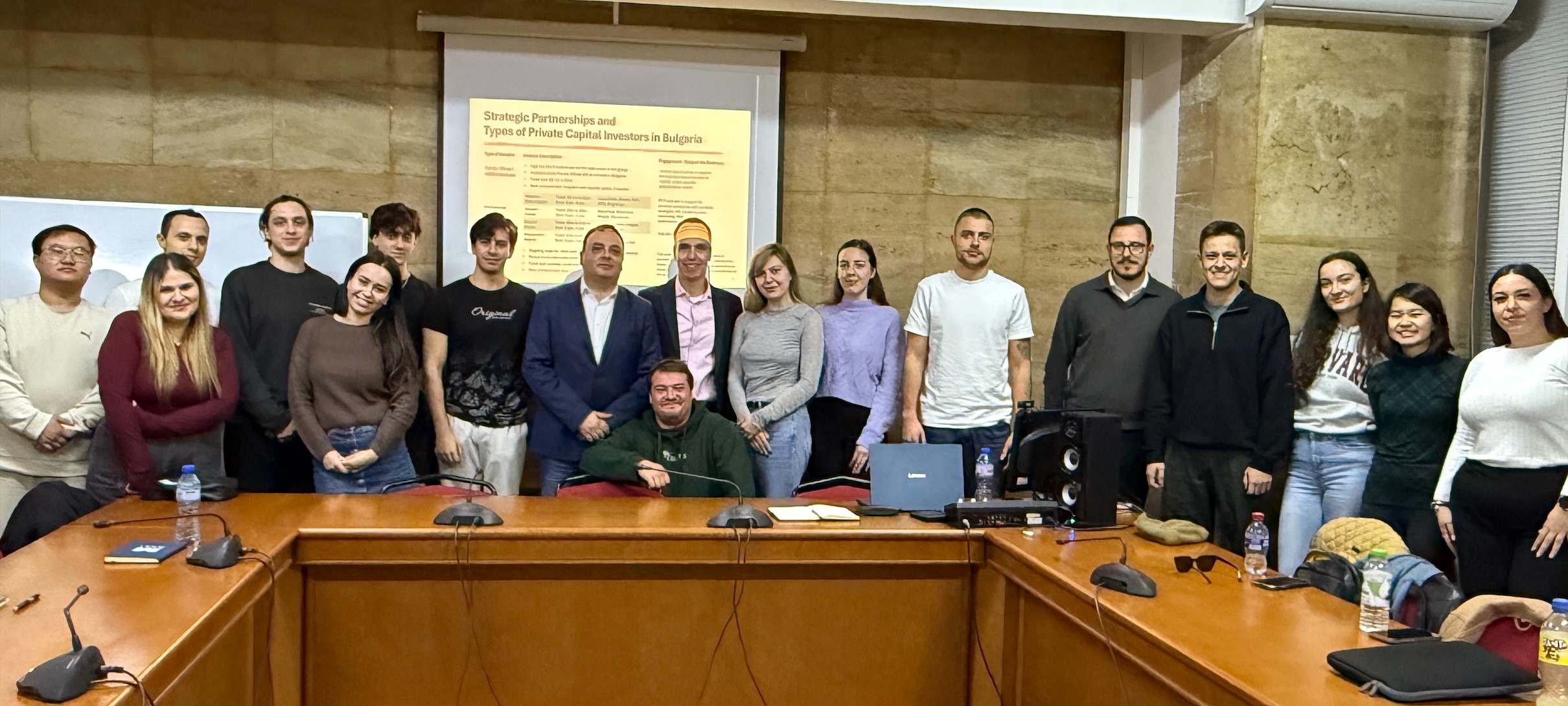 В срещата, организирана от гл. ас. д-р Цветомир Цанов, във връзка с изучаваната проблематика по дисциплината „Финансов мениджмънт в международния бизнес“, участие взеха студенти от България, Грузия, Китай, Малайзия, Молдова и Русия, обучаващи се в магистърската програма „Международен бизнес на английски език“, в едноименната дуална програма с Университета UNINT в Рим, както и в двойната програма по международен бизнес и управление с Университета Jiao Tong в Шанхай.