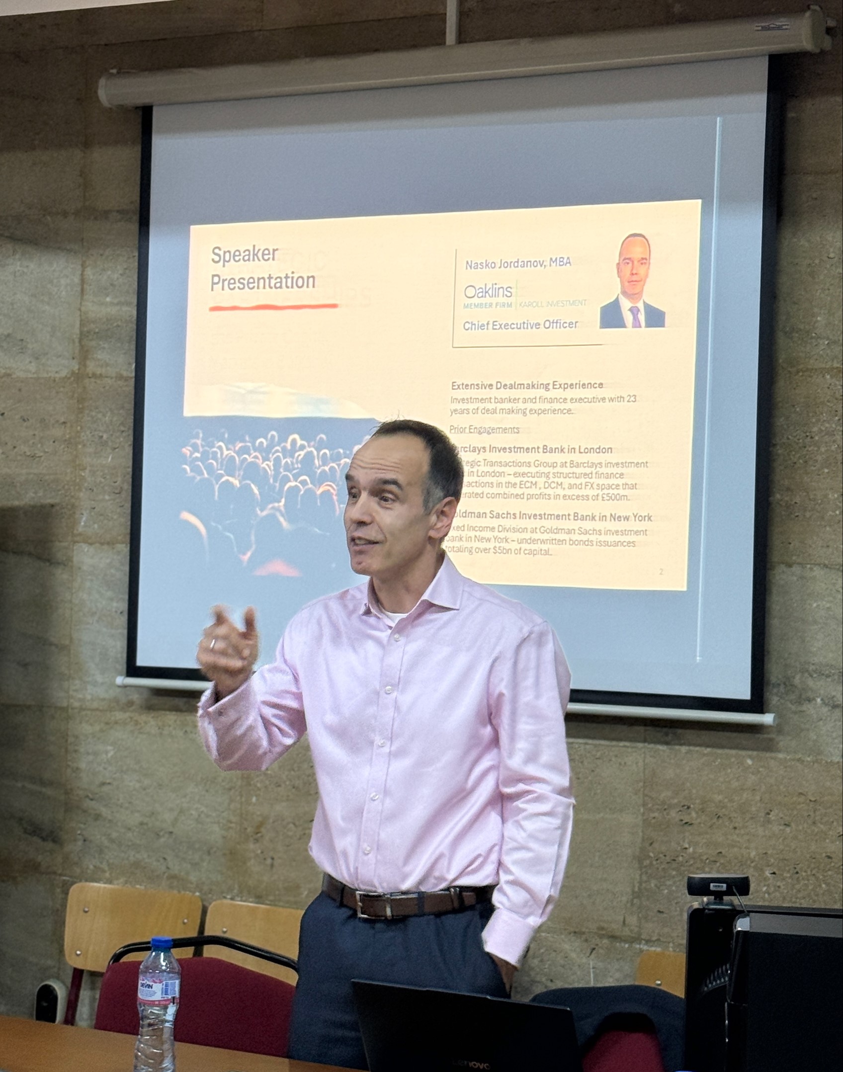 На студентите, обучаващи се в магистърските ни програми по международен бизнес с преподаване на английски език, гостува Атанас Йорданов, изпълнителен директор на „Карол Инвестмънт“, консултантска компания специализирана в консултирането на сливания и придобивания (M&A Advisory).