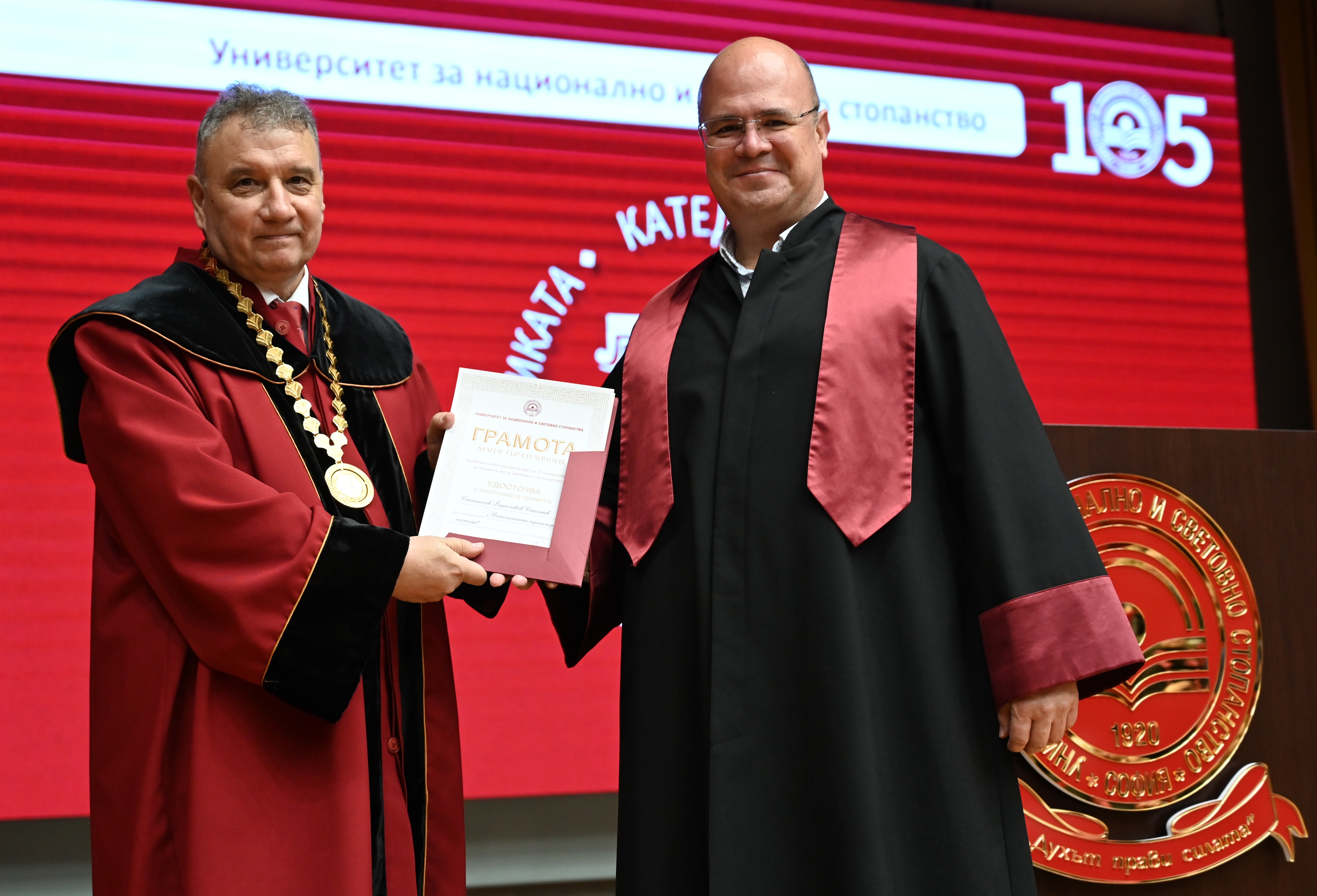 Ректорът проф. Димитров връчи дипломите на отличниците на випуска – Станислав Стоянов, Виктория Монова, Елена Гайдаджиева, Лъчезар Ангелов, Марина Далчева, Николай Герчев и Георги Първанов.