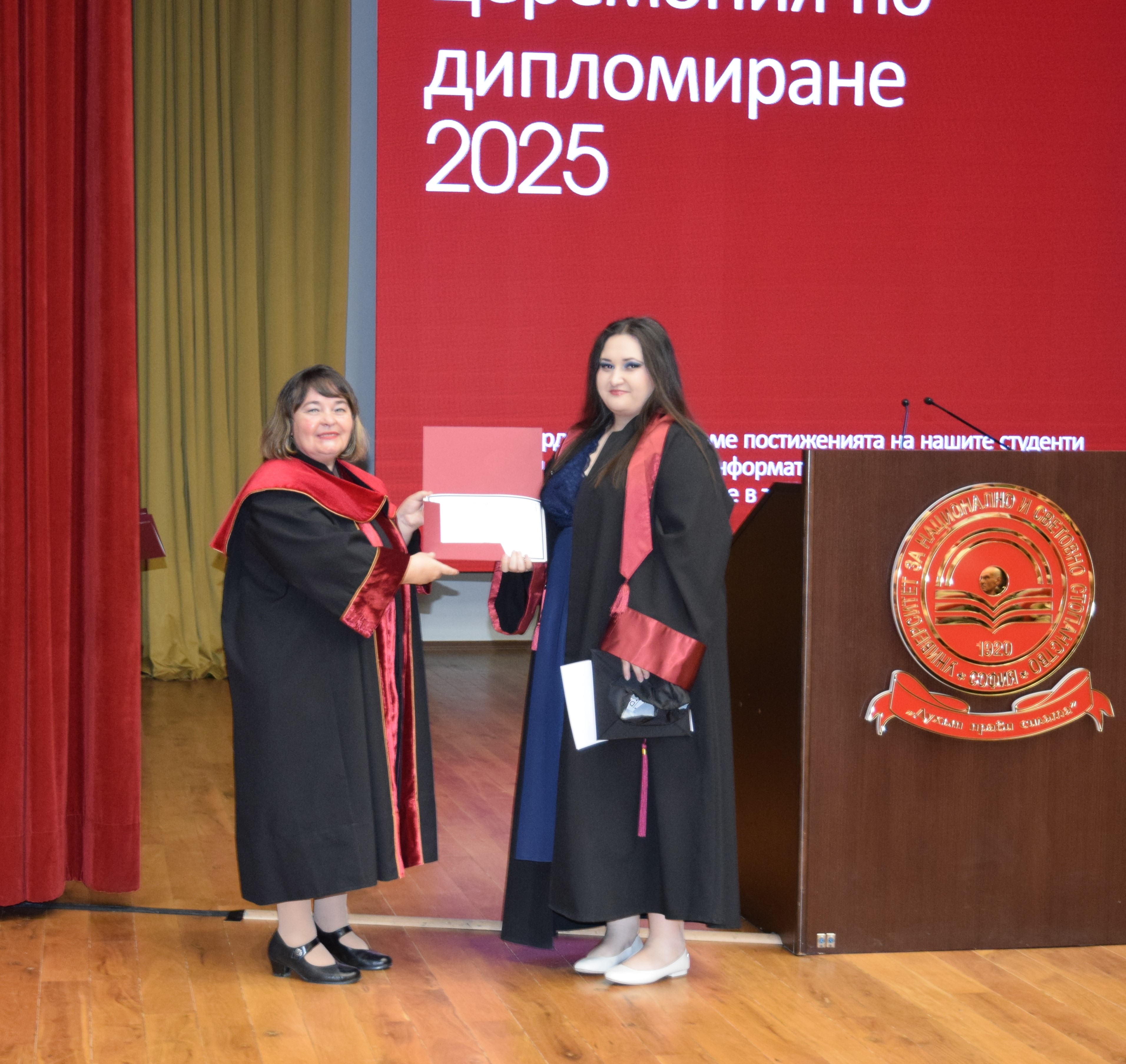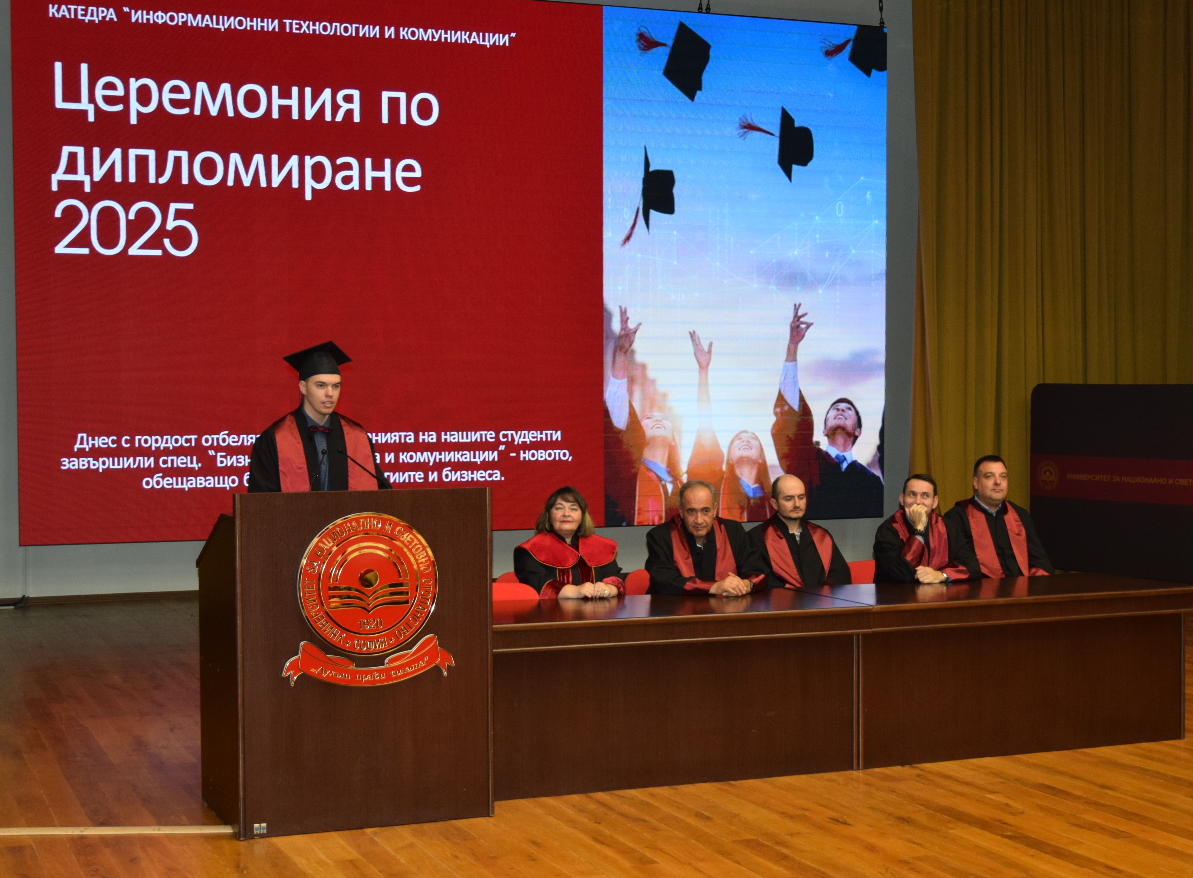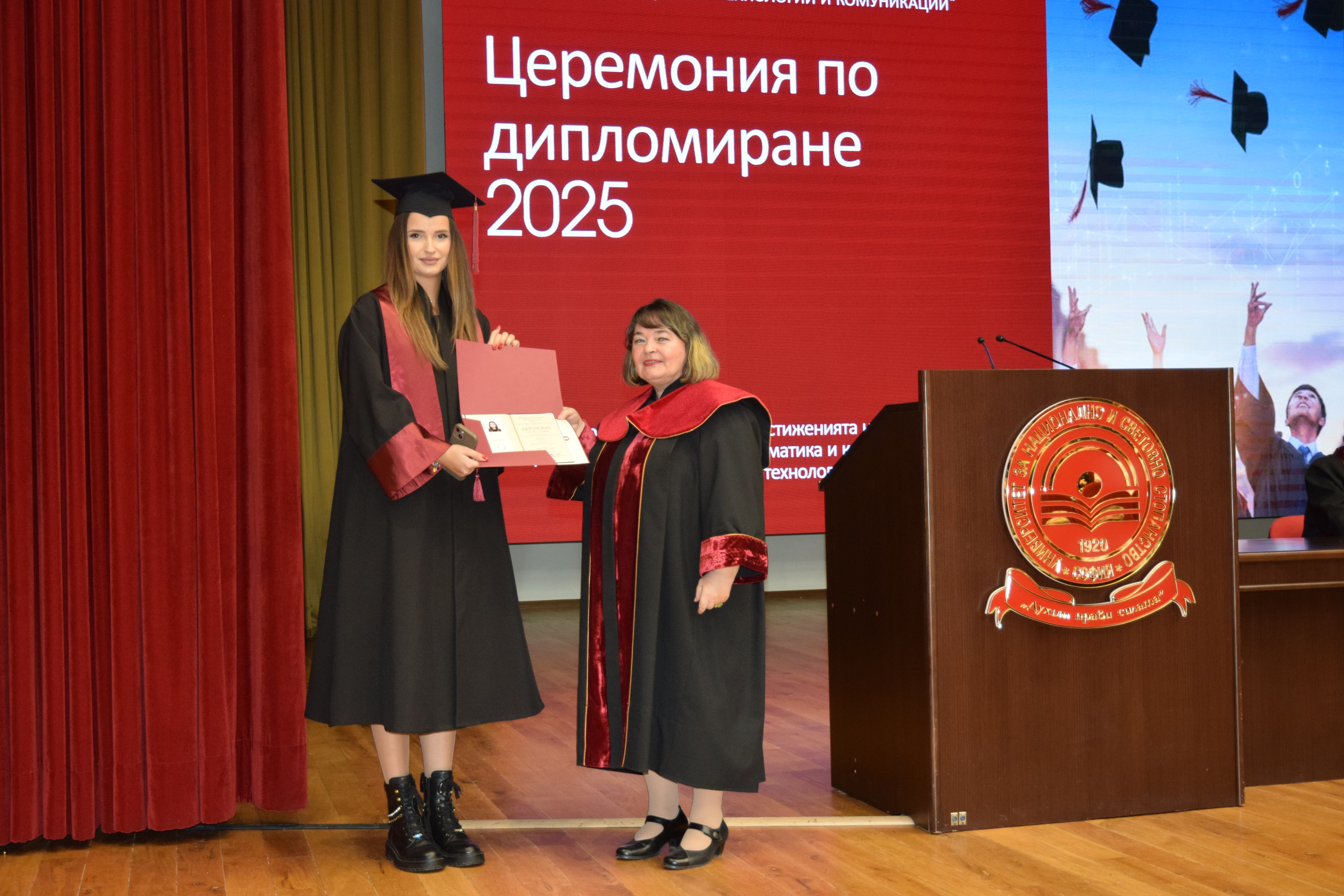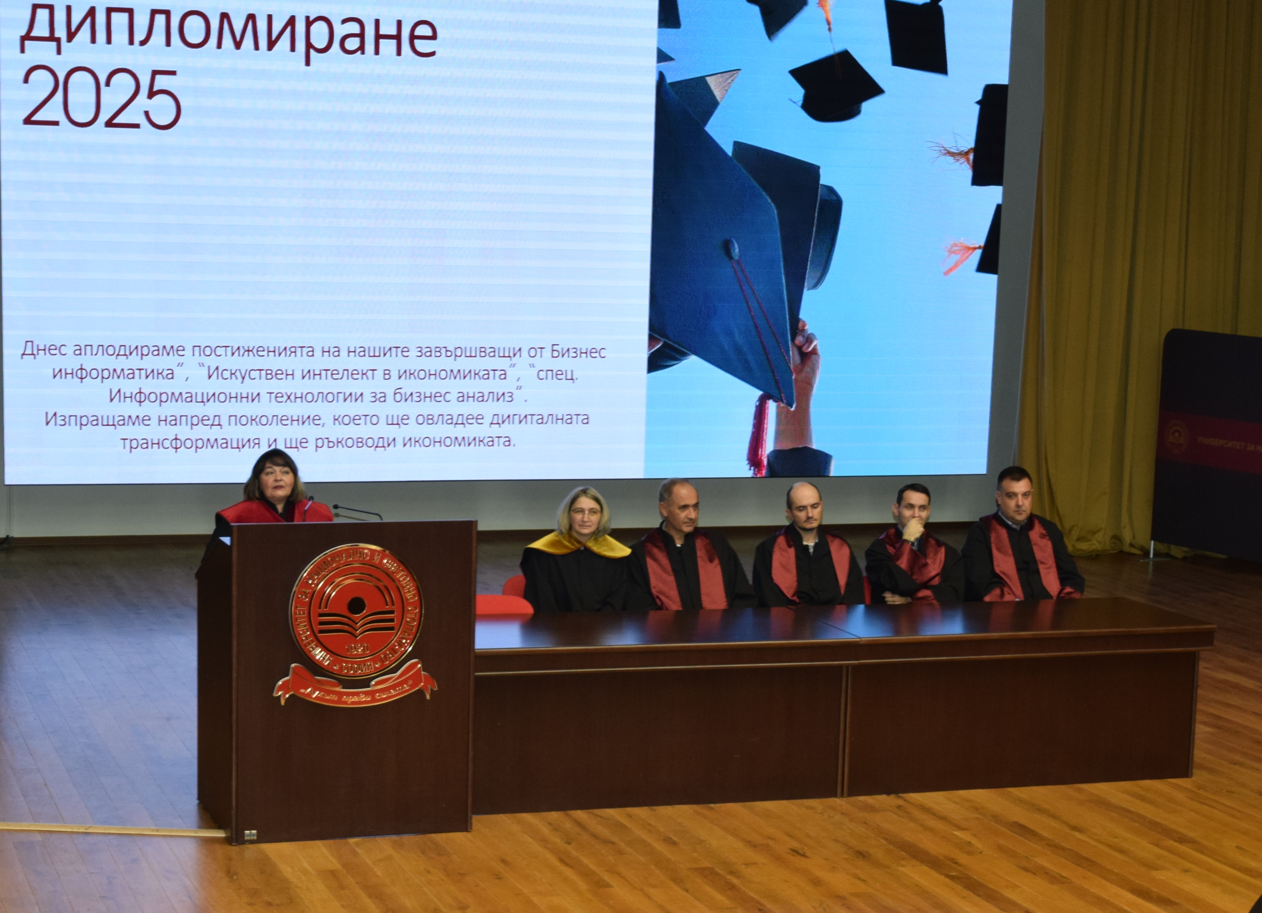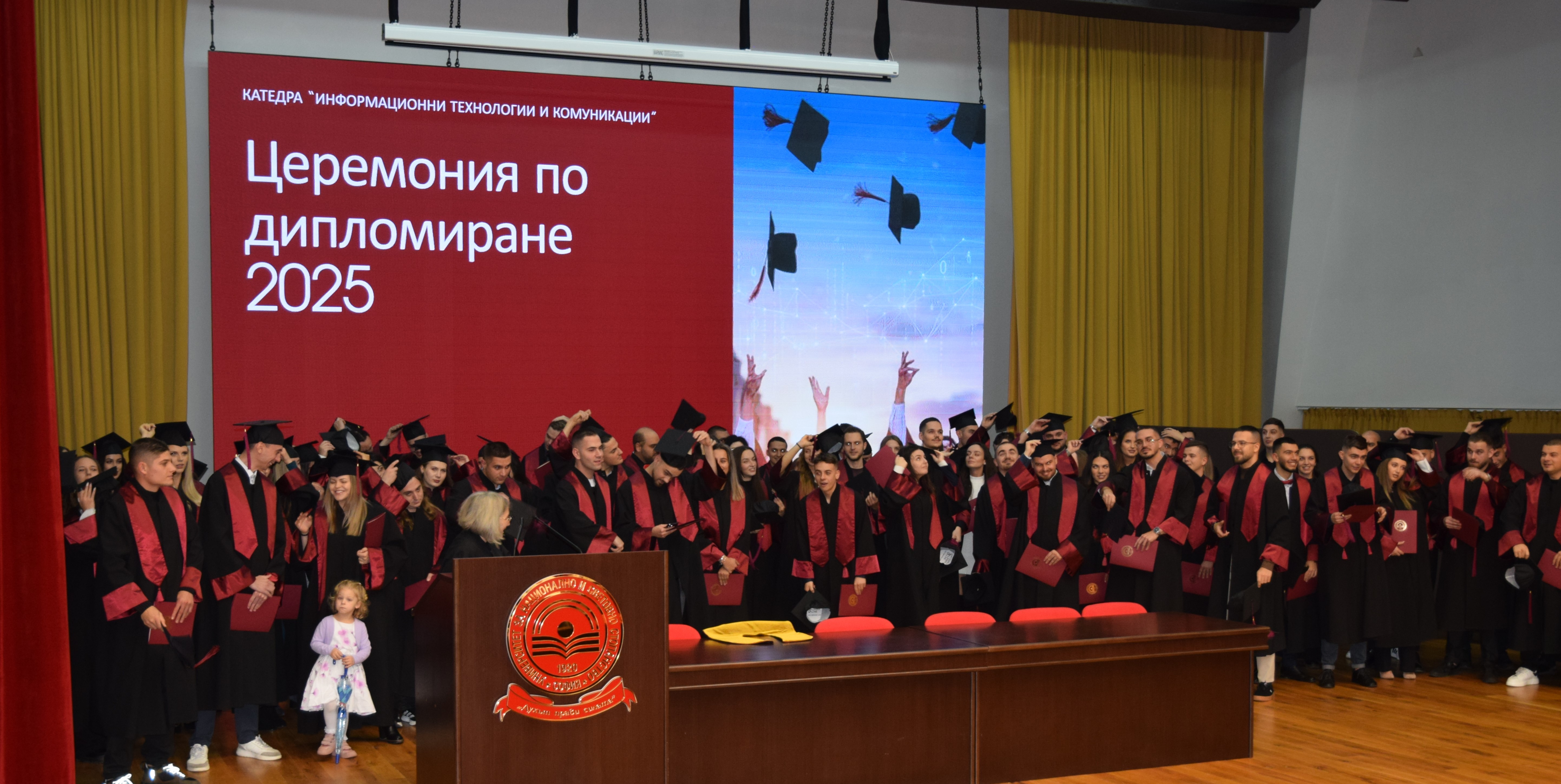 На официална церемония в аула „Максима“ бяха връчени дипломите на бакалаврите от специалности „Бизнес информатика и комуникации“, „Бизнес информатика и комуникации с преподаване на английски език“ и на магистрите от специалности „Бизнес информатика“, „Големи данни и изкуствен интелект“ и „Информационни технологии и бизнес анализи“ на катедра „Информационни технологии и комуникации“. Тържествената церемония започна под звуците на националния, европейския и студентския химн.